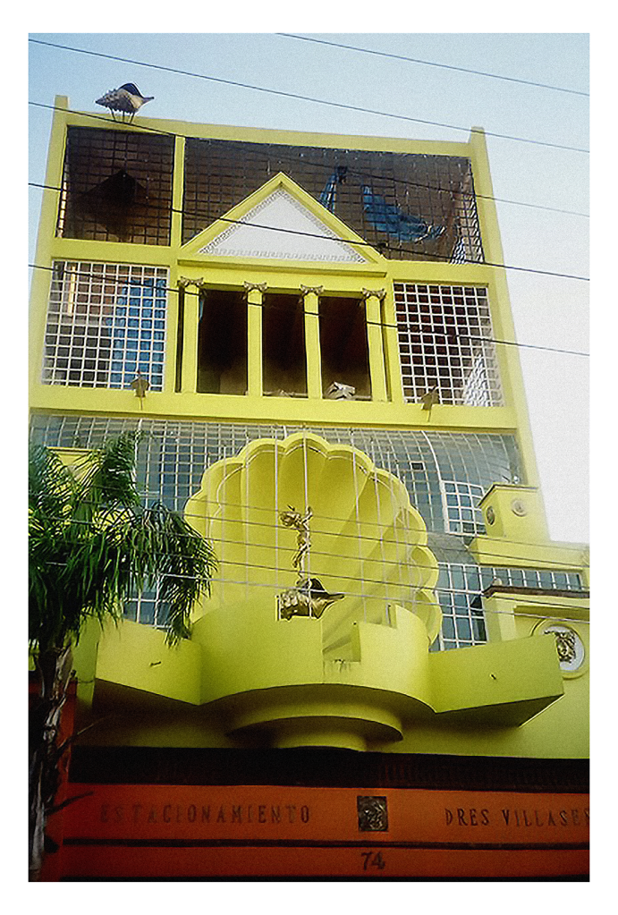 “I’m in a bit of a quandry re. De Chirico’s Song of Love – not that I haven’t given it a lot of thought! So my offering is almost an insane antidote to the subject matter, but none the less a real metaphysical concept of a building that I saw in Mexico some years ago. There are no holds barred when it comes to planning permission in Mexico. This curious mixture of ideas is an artwork in itself. Originally a thirties building full of the symbolism that pertains to that era in cinemas and the like, now it is the premises of car mechanics, and they have proudly painted it bright yellow. This is a poor area of Guadalajara, full of artisans and mechanics. The joy in colour and self expression shows a true love of their craft and life itself, whatever the hardships.”