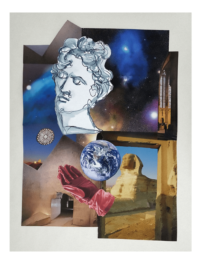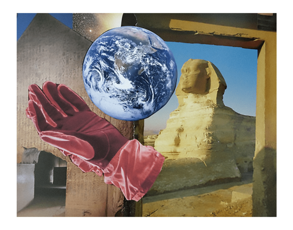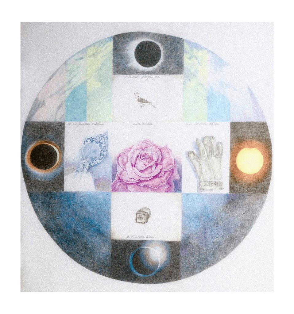 “Well this is multilayered in more ways than one but suffice it to say that I used the globe, glove and shadows from the original artwork and then wove it into my own song of love! Coloured crayon on paper.” 60cm X 55cm.