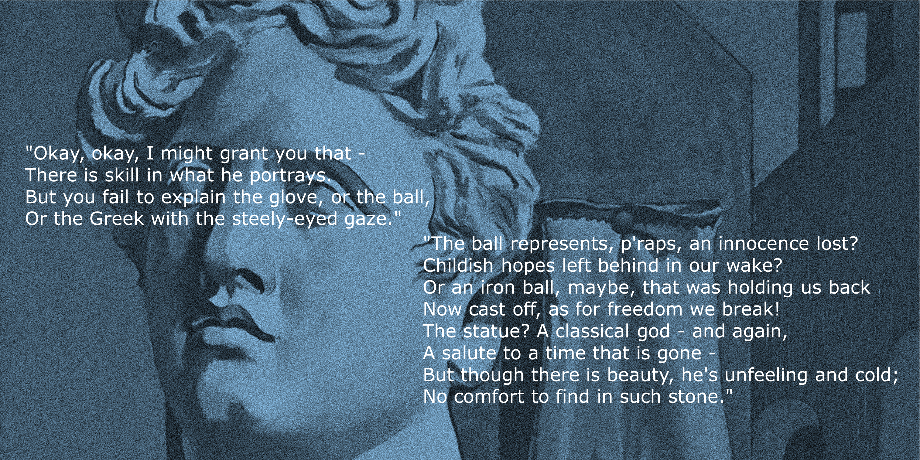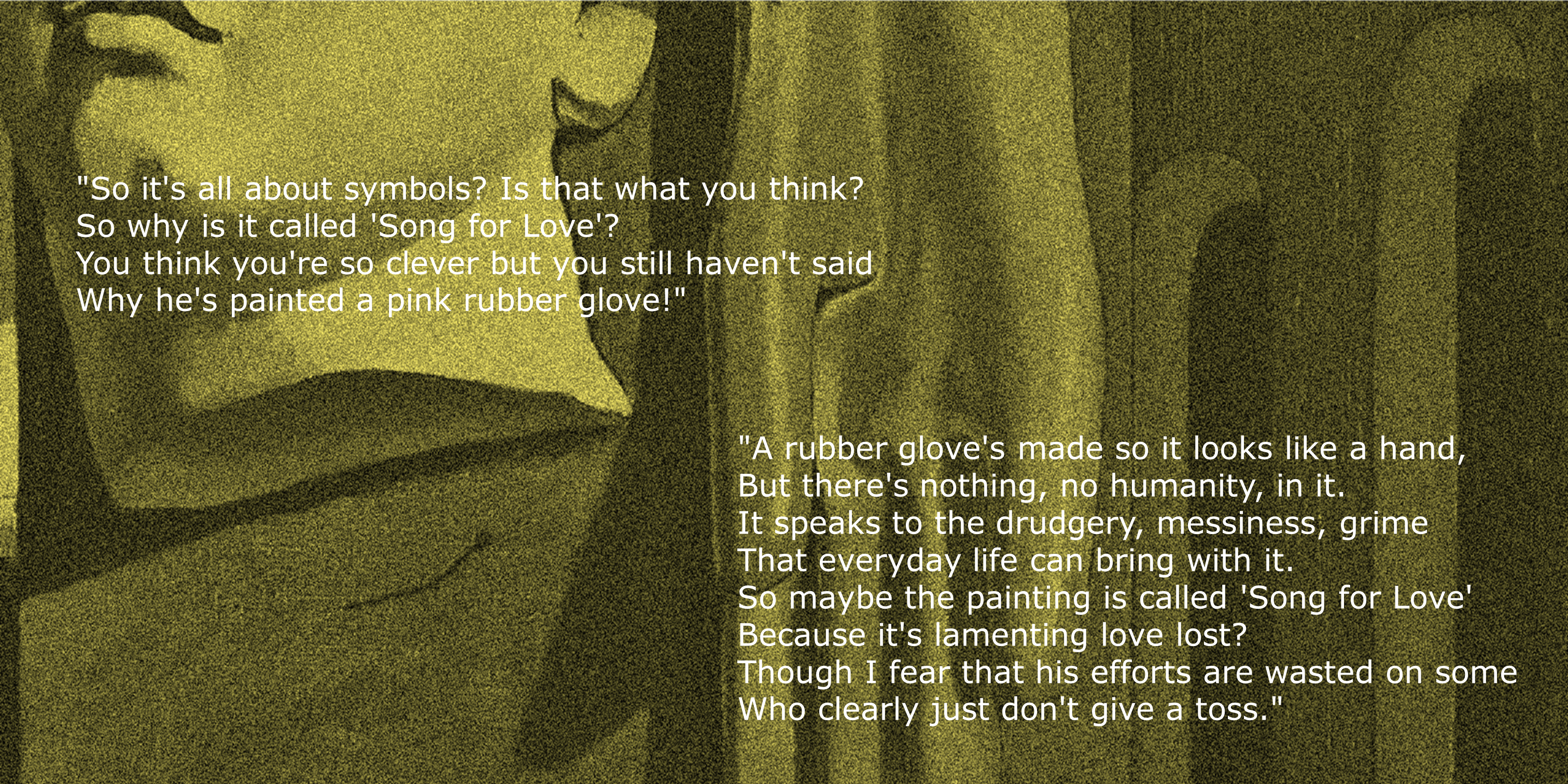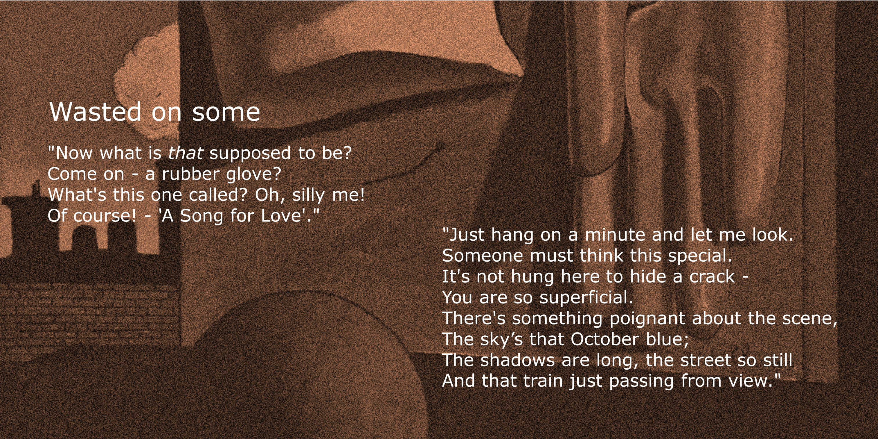 “My first reaction, when I saw this prompt, was OMG! I had no idea what to do with it, so I resorted to research (the procrastinator’s friend), read around it, looked at it again, read some more… Then one day, as I sat staring glumly at the painting on my computer screen, my husband Billy looked over my shoulder and gifted me the first line of my poem. The rest of it just sort of fell into place. After that, it only seemed natural that Billy should assist in the vocals. We had a lot of fun and discussion and laughter with this poem, and I hope some of that comes over in the recording. I still don’t really know what de Chirico wanted to convey in “Song for Love”, but I do know Billy and I will always think of this painting with affection. PS _ Billy’s got the performance bug – he keeps asking if there’s a part for him in the next one!”
