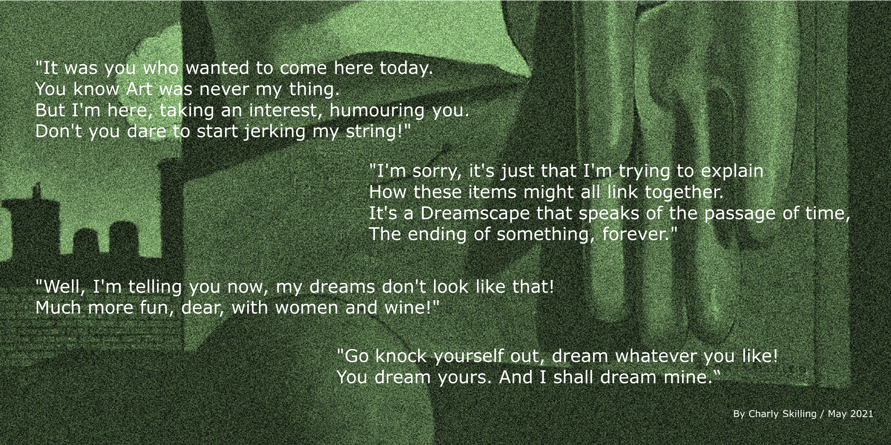 “I have been having wildly vivid dreams as of late, the kind of dreams where you wake up in the middle of the night and need to write them down, the kind you remember so clearly when you get out of bed in the morning, the kind where you try to decipher their meaning to see if its some sort of cosmic message within your unconscious psyche that needs to be brought to fruition. These dreams feel as though they relate to the collective phenomena, where people at the start of lockdown had extremely vivid dreams, probably in relation to their unconscious being so fired up because their everyday lives felt like Groundhog Day, something I still feel like I can relate too. Surrealism, as an art form, is cemented in the unconscious, with surrealist painters adopting many techniques to unlock the power within their unconscious, so that it translates through to their art, including many being influenced by allusive dreams. With this in mind, and with this week’s The Song of love prompt, I have created a landscape of some of the symbols I have recently seen in one dream that has had a lasting effect..”