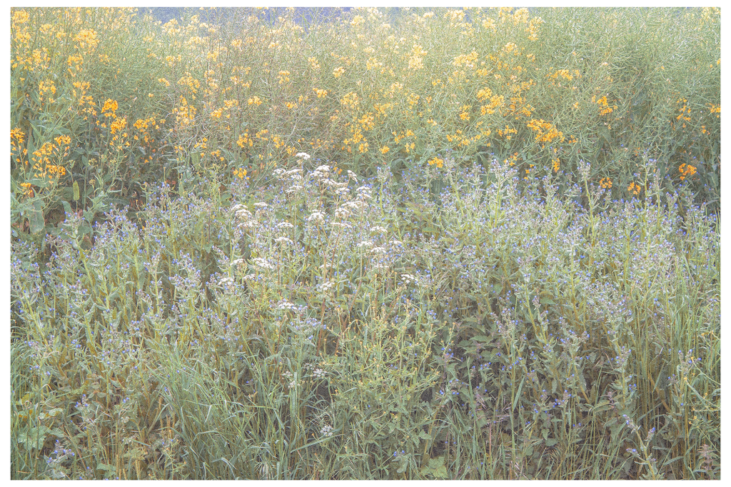 At the end of last week, at the end of the day, we went out to take in the view of a very large field of rapeseed just on the edge of Bysing Wood. I was soon lost, taking a great many photographs of the sea of billowing yellow flowers, photographing into the haze of the sun, over-exposing, and courting as much diffusion and noise as possible to produce my preference for painterly effects. The field itself was raised up above the level of the road and flanked by a steep, lush verge of the softest wild plants and flowers, a vertical garden more beautiful than any scheme I’ve seen designed and installed elsewhere. The sun was pushing into the camera through the voile of rapeseed at the very top of the verge, and the resulting light was like something out of Peter Weir’s Picnic at Hanging Rock. In coming days, Red’s Kingdom will be awash with golden fields; in advance of that, enjoy these postcards from the edge.