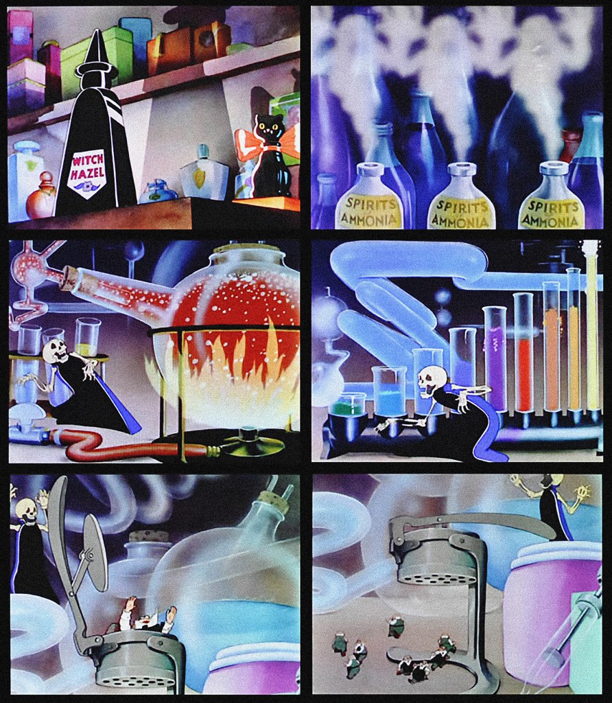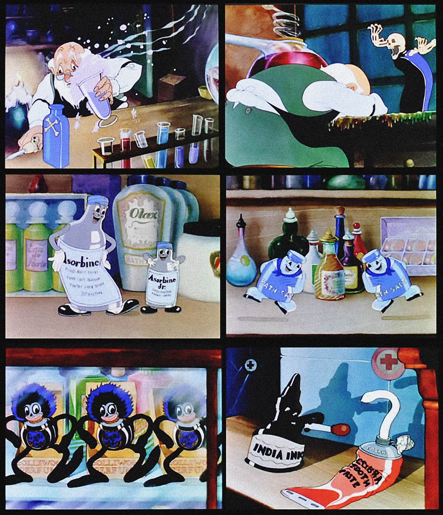As a child, whenever an old-style cartoon came on the television, Bottles was the one I was hoping for. The story, such as it is, begins with an old apothecarist falling asleep one suitably stormy night, initiating a musical dream sequence in which the bottles on the surrounding shelves come to life to perform in a series of variety-style skits. Even as a nipper, I detected that Scooby-Do, Captain Caveman and their like were ‘cheap’ animations. Something about their flat colour and all the labour-saving devices of their locked, unmoving poses told me corners were being cut. I enjoyed these cartoons, of course – better those than Grange Hill, or worse, The Littlest Hobo, but for me they were the equivalent of those packets of Swizzel’s Rainbow Drops – puffed rice dyed colorfully; a bit cheap, a bit thin, a bit light, and always a bit disappointing. Not a proper sweet, only the semblance of one.