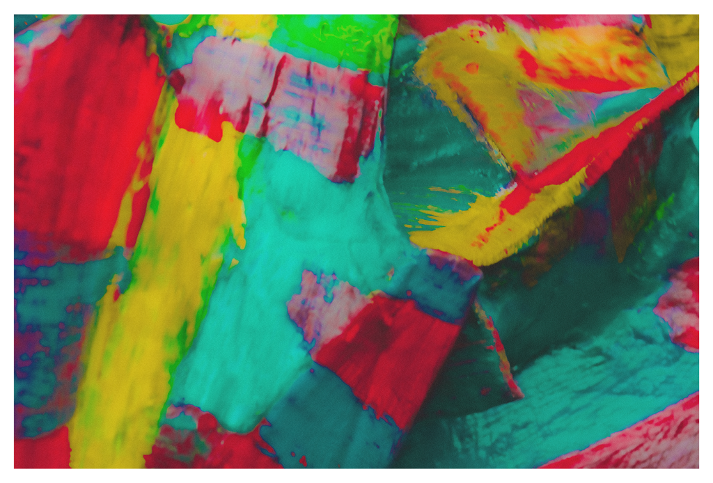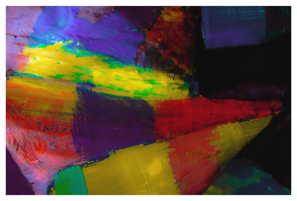 Another quartet of Rutenberg-inspired abstract photographs, inspired by the Kick-About No.32. Once again, the images are the result of first fabricating and painting some cardboard maquettes, which were then used as ‘Lego bricks’ to produce the sorts of three-dimensional terrains suggested by Rutenberg’s panoramic painting, Low Dense.