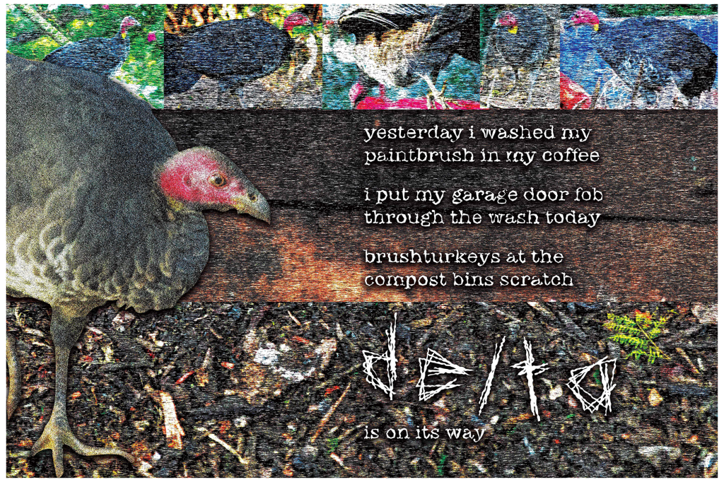 “I was a bit focused on other little projects – though chicken dance was lurking in the back of my mind – originally I was contemplating an image of someone crossing the road, lost battery chicken-like in their smart phone. My final offering quickly took off from a couple of weird things I did and the news feeds bombarding us in Australia on the delta variant, to the point where it feels like we never had alpha at all and that delta just appeared out of the ethers. We Australians really have ourselves to blame for not deciding to bite the bullet and take the not best option astra zenica for delta’s current launch in Sydney. Anyhow, my attempt at a voodooish/distressed thought-bubble.”