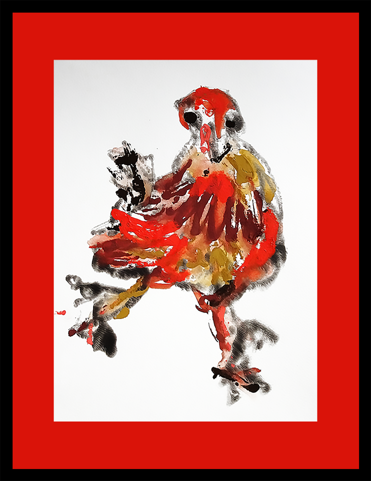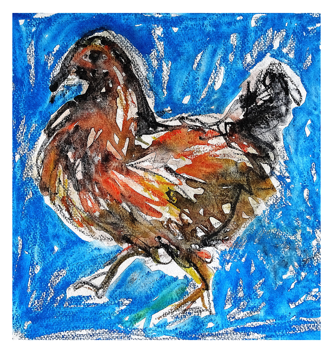 “I love the dancing chicken. Never would I have thought… Funnily enough, I am just painting a rooster, even if its meaning is a bit of a departure from the prompt. It all started from various kick about prompts actually, tree of life, symbols etc. Here is a bit of my tree of life, more like a climber really, with roots in the sea going up in a dreamy night sky, and my rooster daughter (by the Chinese horoscope), perched on it. Looks like a rooster singing to the moon now.”
