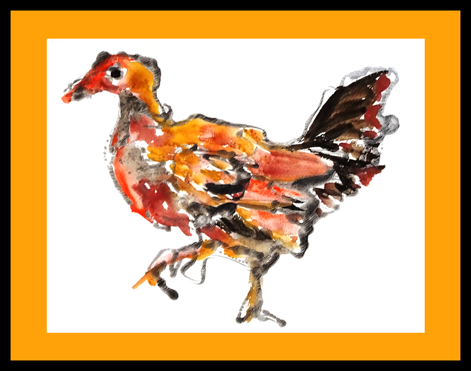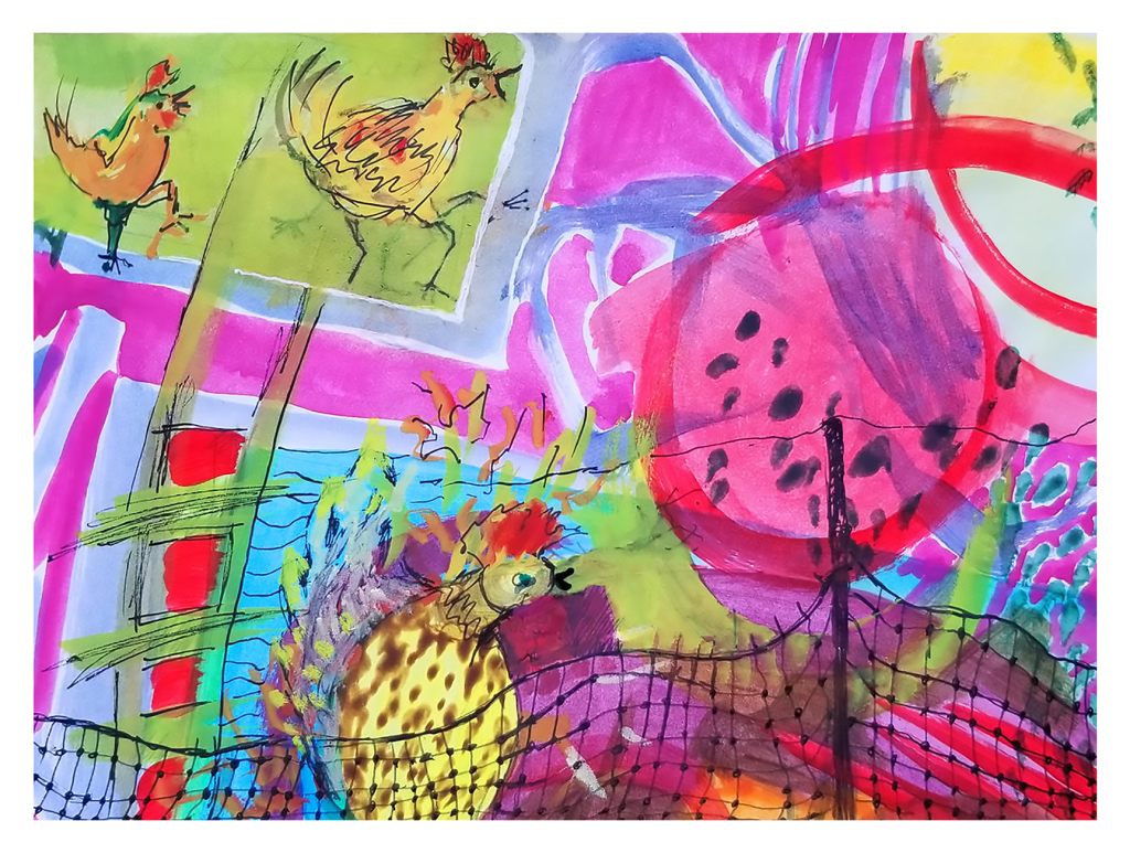 “I first decided to draw while watching the video on a roll of rice paper that I had. This was a fun exercise, worth thinking about for other videos in the future. Then I did some monoprint outlines, based on those sketches. I tried to monoprint color on top, but that was not as successful, so I improvised with paint. Only the chicken with the blue background did not have a printed outline, it was all drawn in neocolors. There is no cohesiveness to this week’s work, but chickens are endlessly fascinating to draw. So maybe that’s the take-away.”