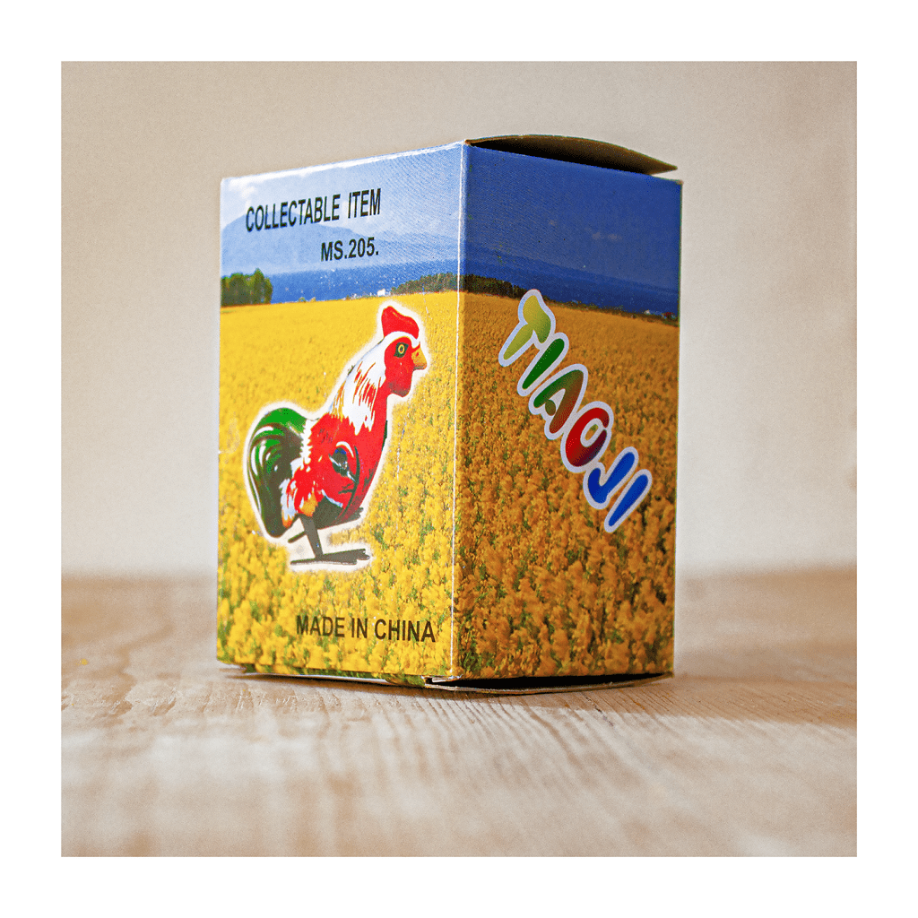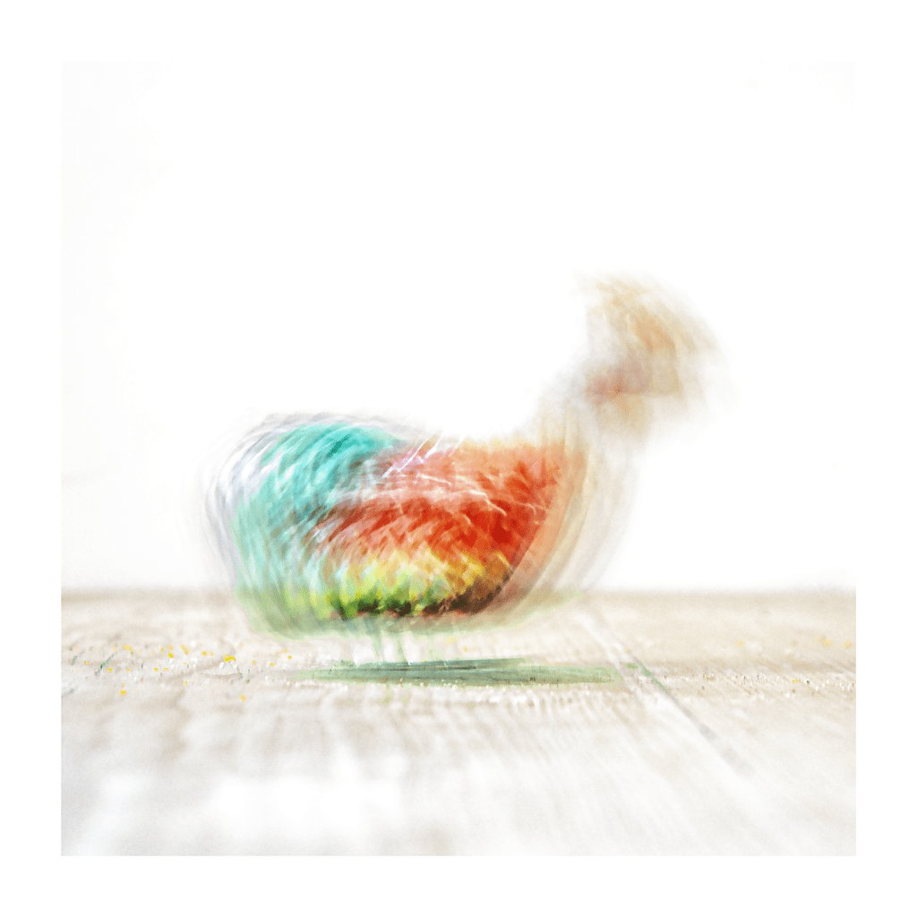 “I was struck by the folksy, pop-culture qualities of Herzog’s dancing chicken, and keen to investigate the movement of these performing animals too. The rather forlorn spectacle of these animals, in boxes, existing to entertain through repetitive actions got me thinking about mechanical toys, so I acquired a mass-produced tin toy clock-work chicken and set about trying to capture its efforts to entertain me, in the form of a series of long-exposure photographs.”