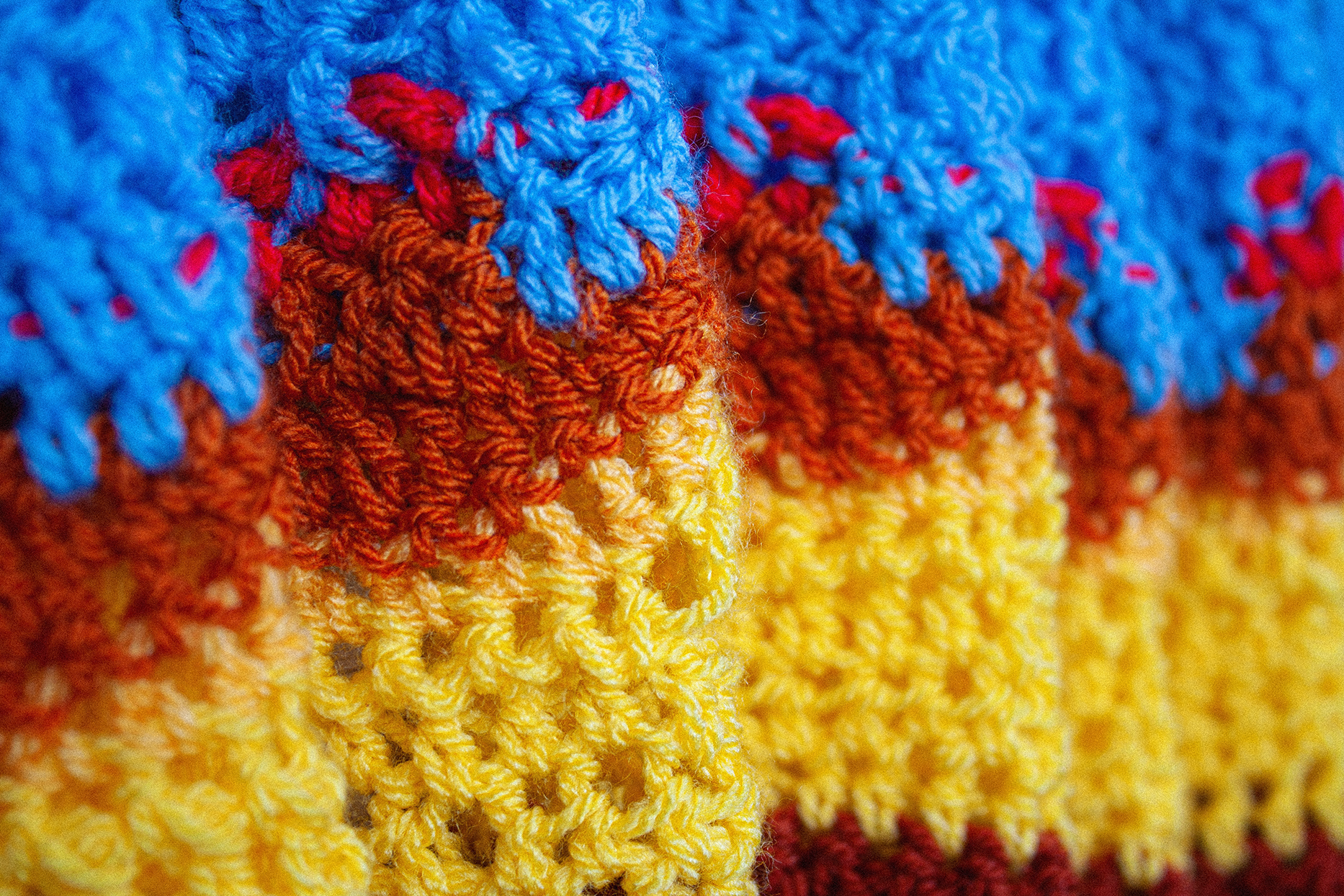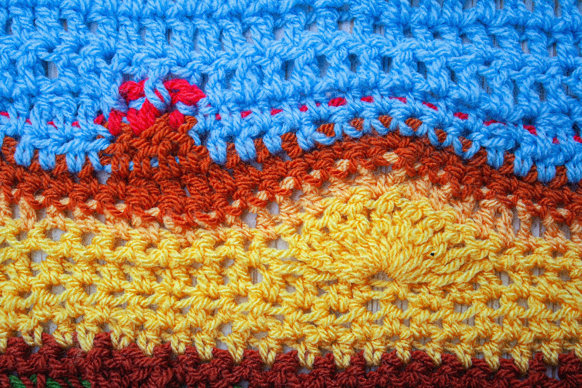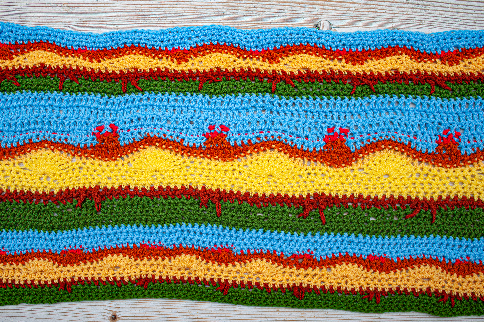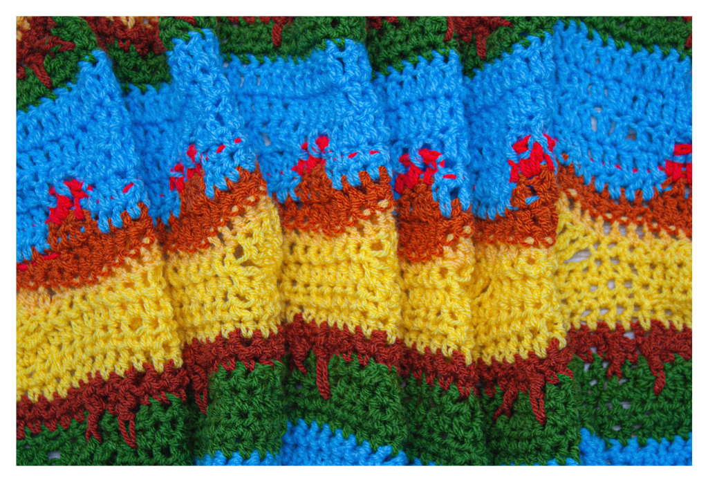 “I got very excited when I first saw this prompt, because I just love chickens! The range of colours and patterns they display in their plumage; their ability to scuttle about very busily, and then stop stock still – like a screen freeze – before resuming their previous activity, as if nothing had happened – and the fact they combine such dignity with such comedic flair. I just love ‘em! But, I have never attempted to capture motion in yarn before, let alone dancing hens. I soon realised crochet does not lend itself easily to “action shots” so it took a lot of head scratching and moaning and groaning before I found a way forward.