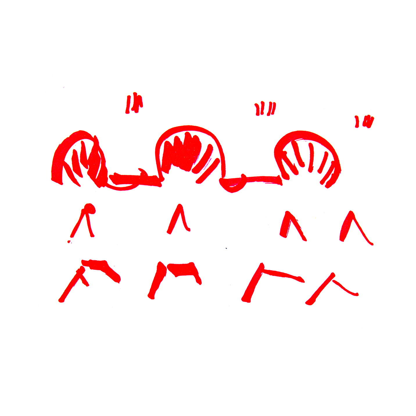 I found photos of chickens running, and then got my techie friend to overlap and tessellate them. From that I tried to identify the key shapes that said “chicken”. (See attached scribbles.) From that, I decided on tail shape, coxcomb and legs, and then tried to develop those into a pattern that might suggest movement. I chose colours in keeping with the folksy, children’s story mood of the original prompt. Here are the results. Chicken Runner, anyone?“