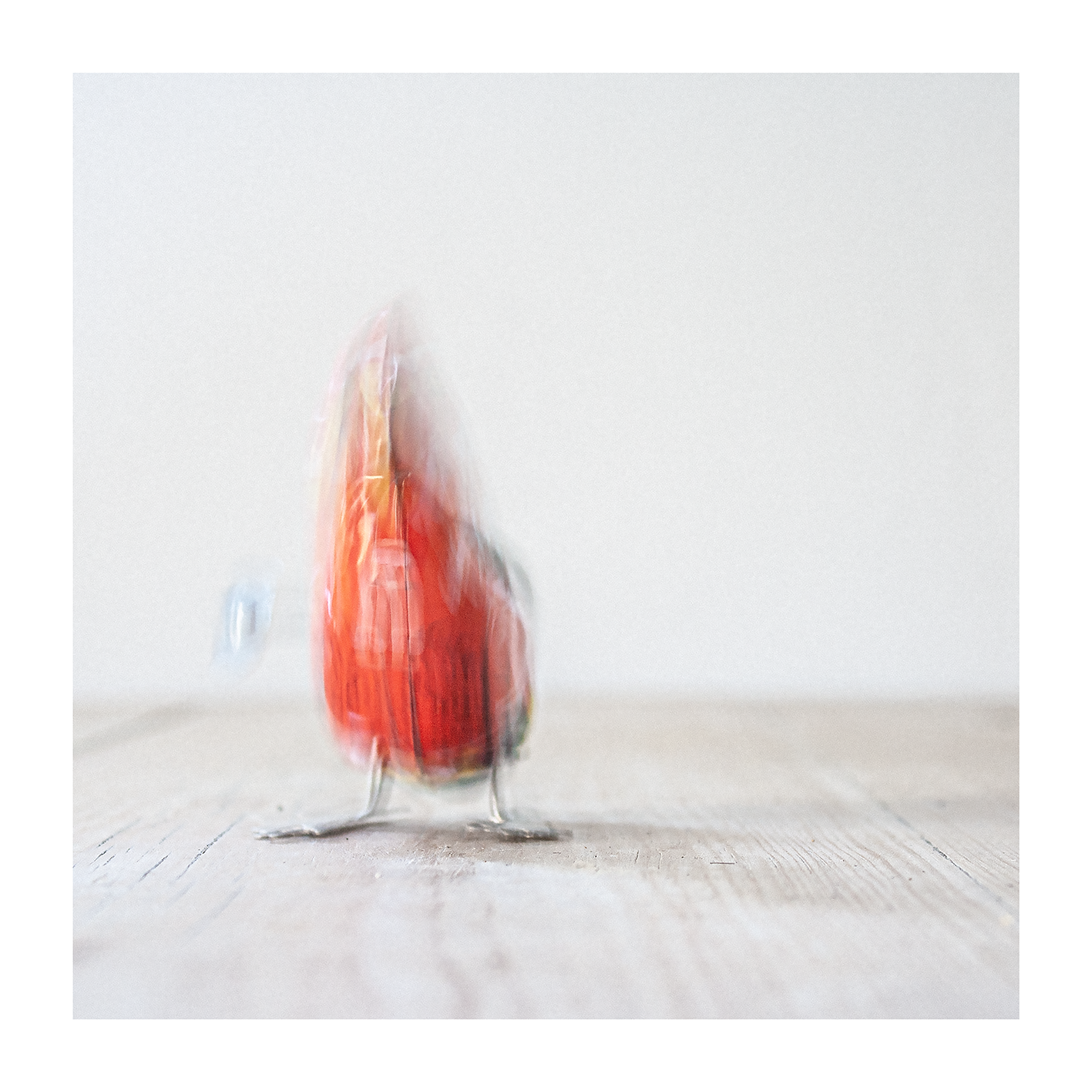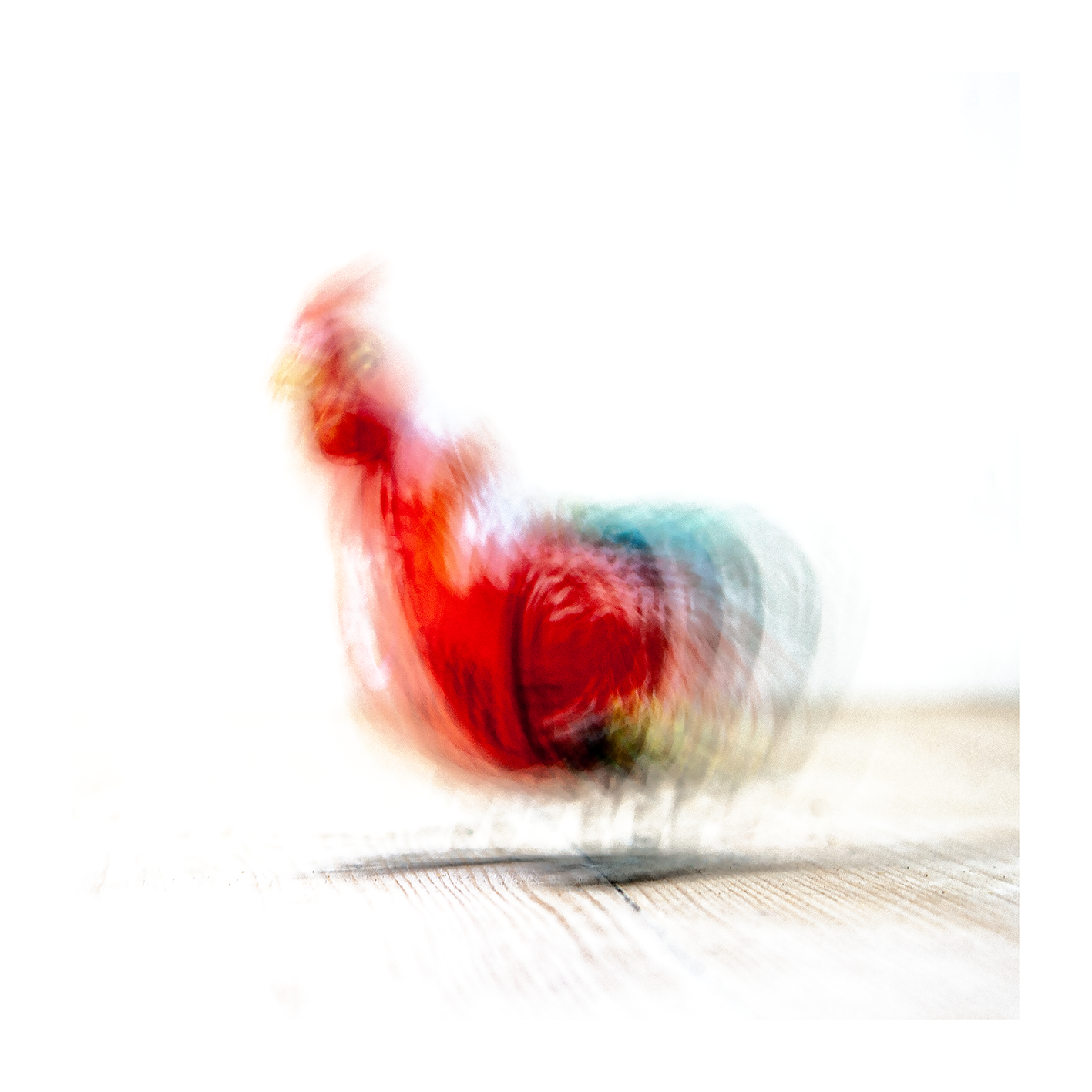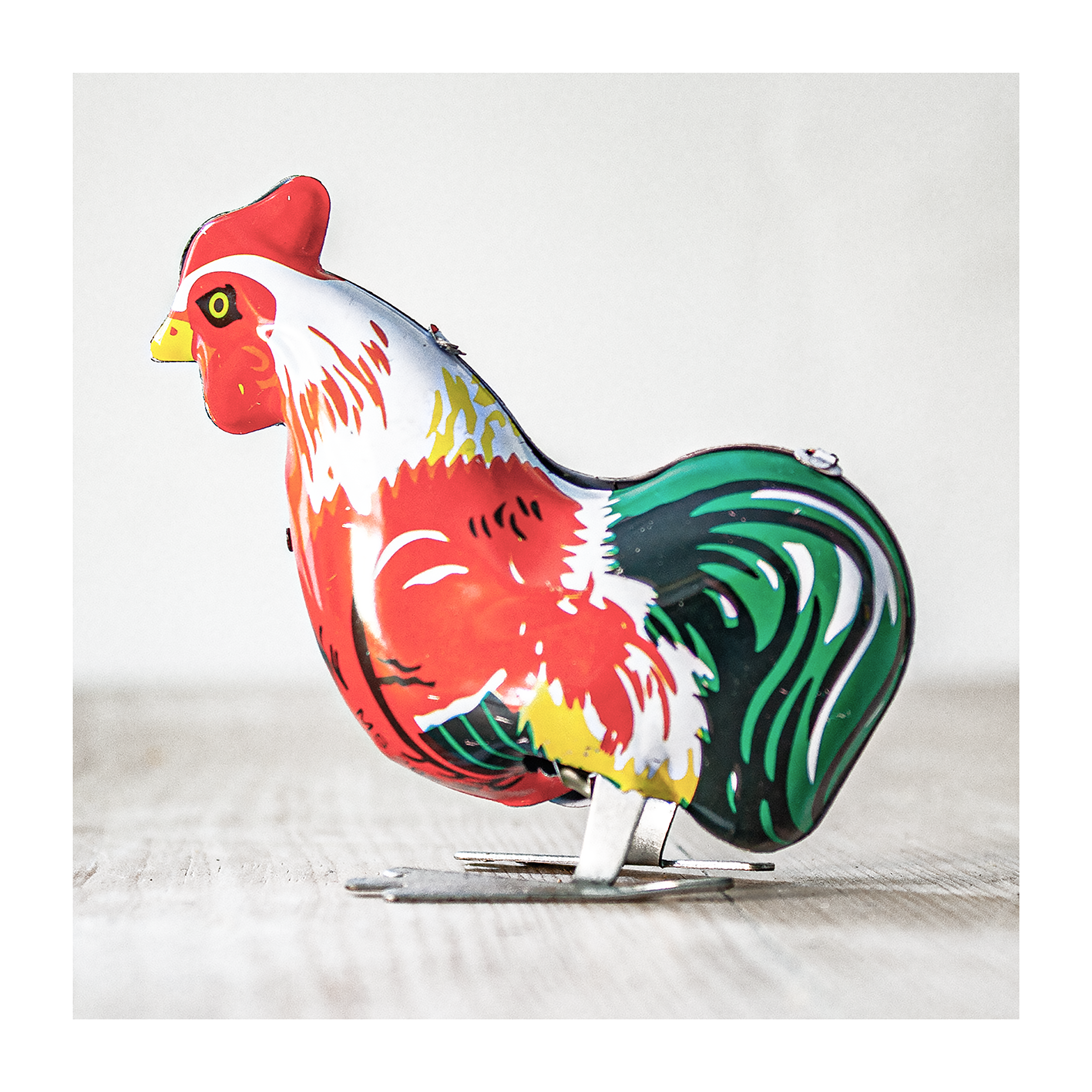 I was struck by the folksy, pop-culture qualities of Herzog’s dancing chicken – our prompt for The Kick-About No. 33 – and I was keen to investigate the movement of these performing animals too. The rather forlorn spectacle of these animals, in boxes, existing to entertain through repetitive actions, got me thinking about mechanical toys, so I acquired a mass-produced tin toy clock-work chicken and set about trying to capture its efforts to entertain me in the form of a series of long-exposure photographs. I tried a bunch of stuff – different exposures etc – and really enjoyed the unpredictability of the process, not least the waywardness of the clock-work rooster itself. Ultimately, there is something inescapably comedic about chickens, though I loved the way the object itself was effaced by some of the longer exposures, becoming something dreamier, ephemeral and odd. Suitably inspired, I turned my attentions to some other tin-toy birds I’d sourced, and soon kicked-off another series of photographic investigations, the results of which will follow on here over the coming days.