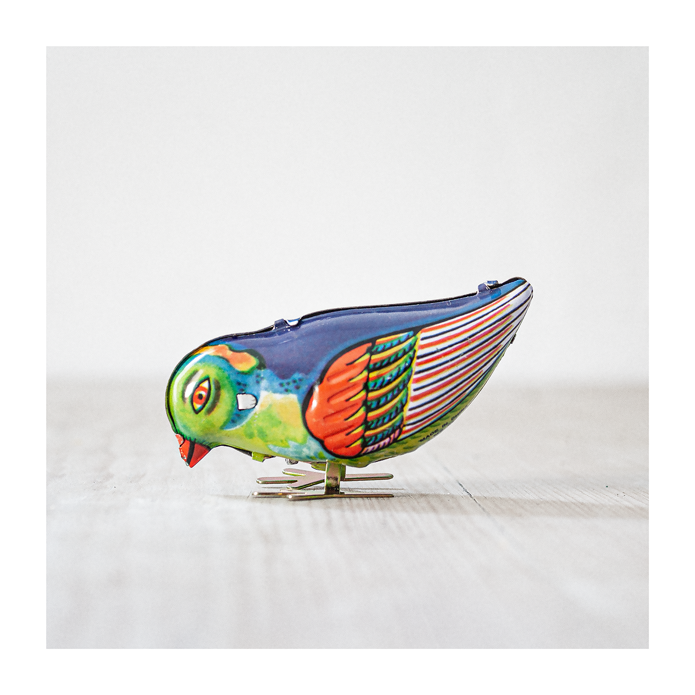 Another day, another tin-toy, and this time a rather wonderful clockwork ‘blue bird’ that pecks elegantly at the ground while turning in circles. Inspired by the creative gauntlet set down by The Kick-About #33, I continued to enjoy the vanishing effects of movement + long exposure, with the design and motion of this particular toy promising lots of enjoyably ephemeral outcomes and ideas too for further play.