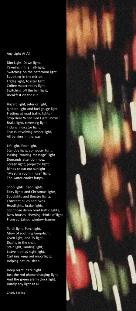 “After watching Marie Menken’s ‘Lights’, I found myself walking around muttering ‘lights, lights, lights, lights’ over and over in a sort of chant. As I did, I became very aware of the number of lights, large and small, significant and insignificant, that fill our modern lives. This poem is my attempt to express that awareness.”