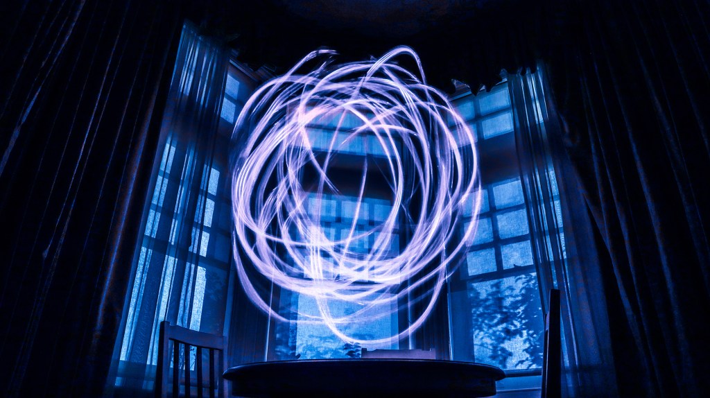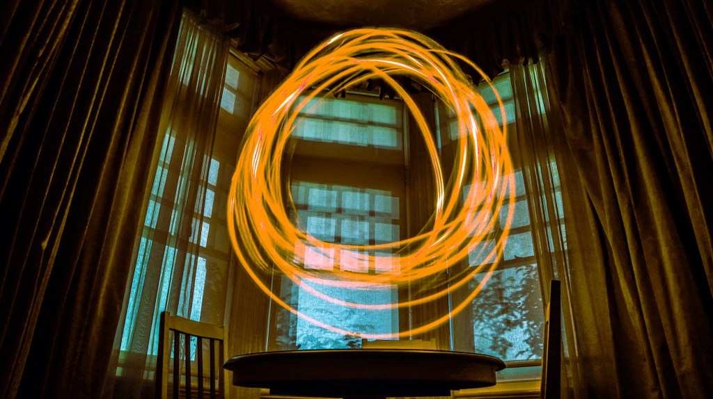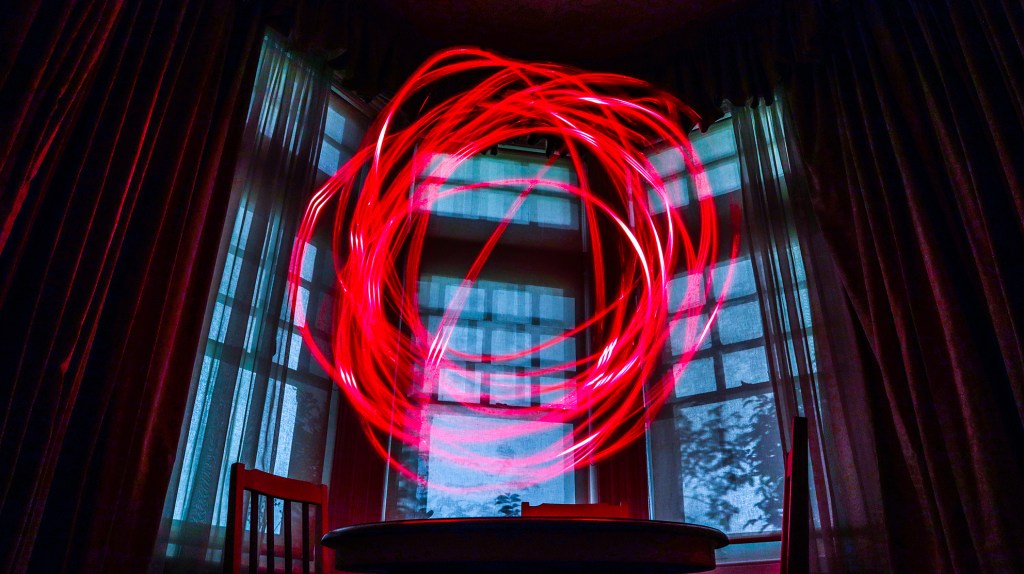 “These long exposure photographs were taken a while ago, situated in one of the turrets in our home and framed by its long theatrical curtains. One day I would like to try and make an animation out of these techniques and mimic Menken’s inspirational film more.”