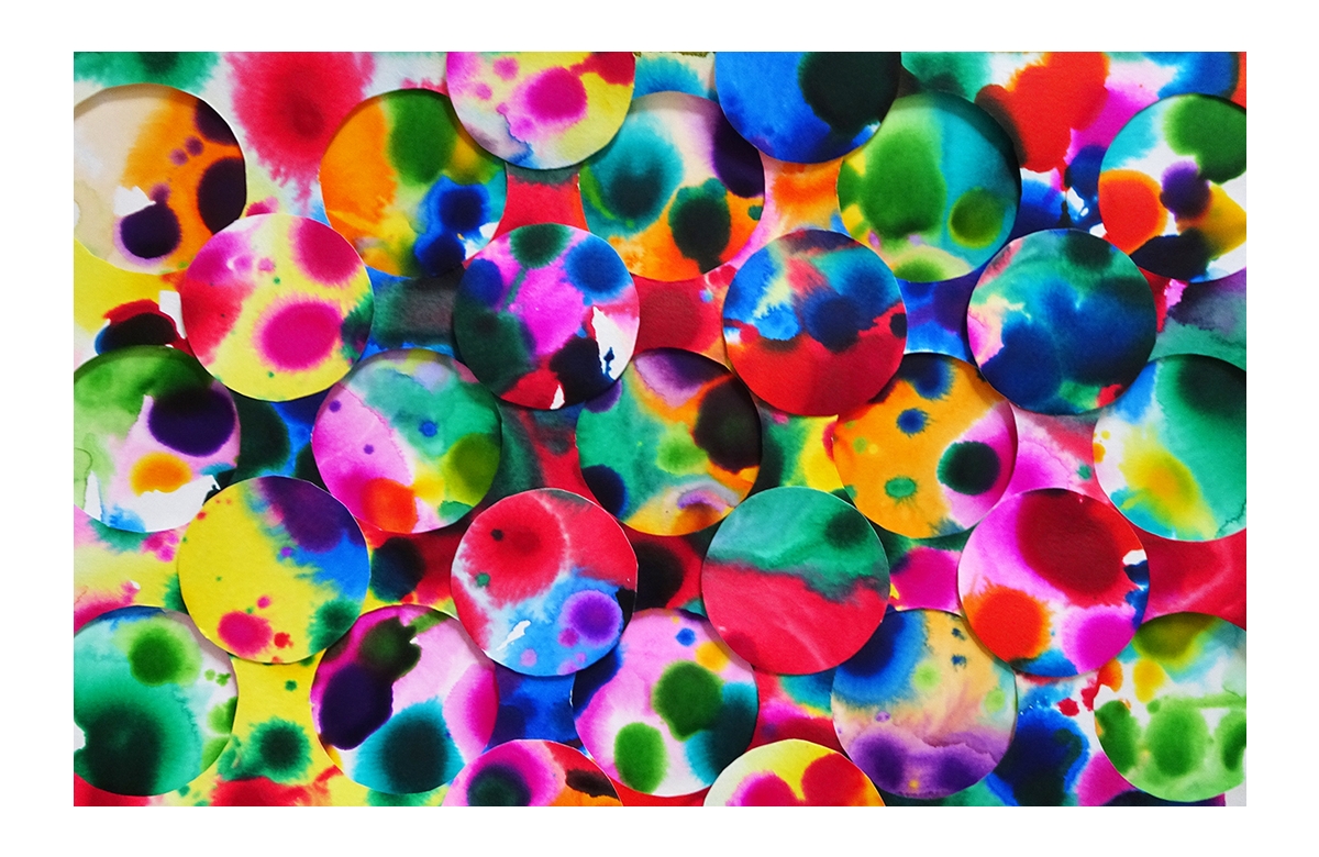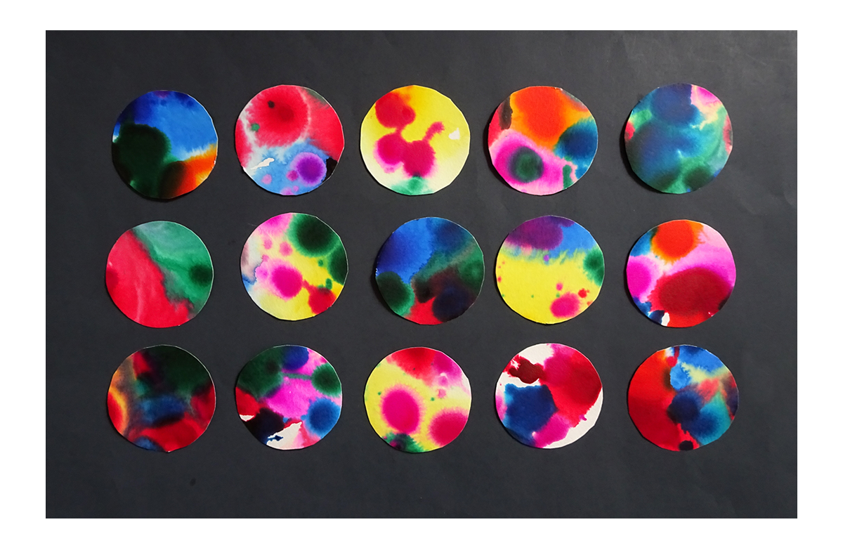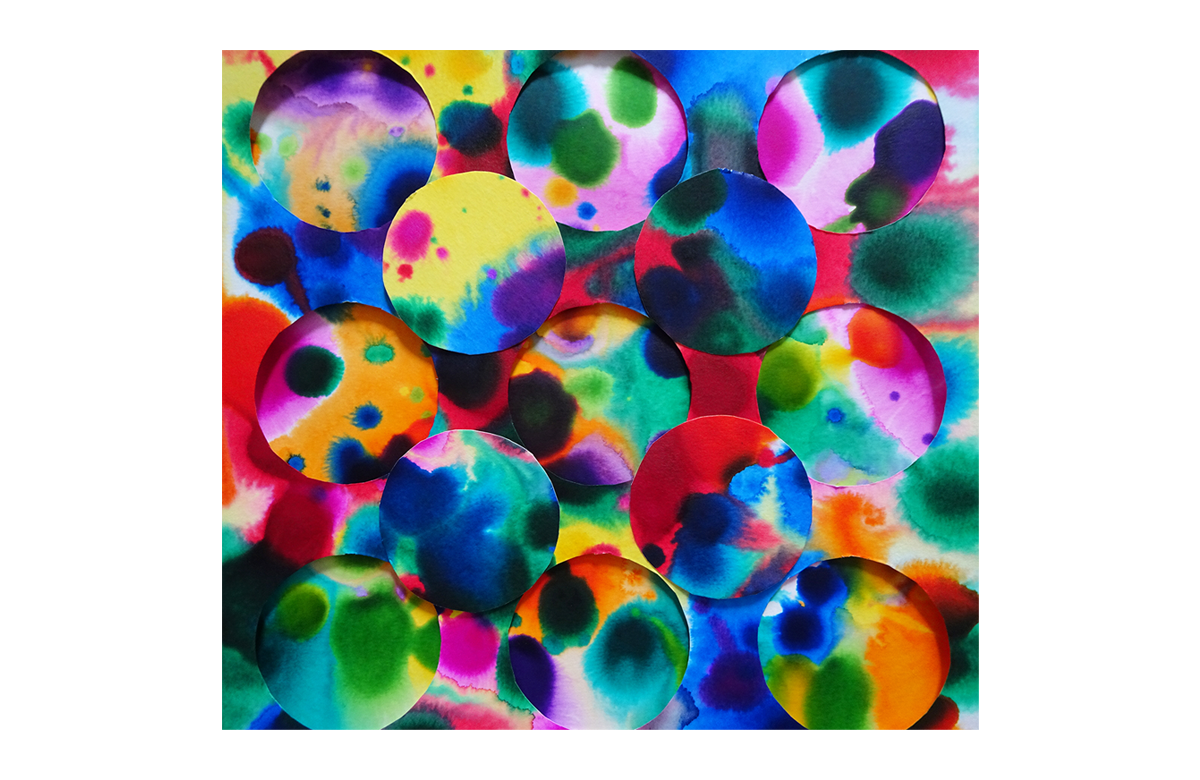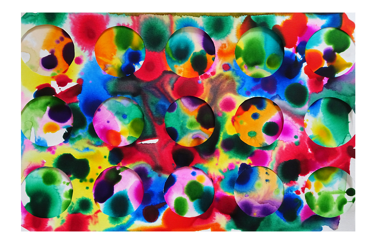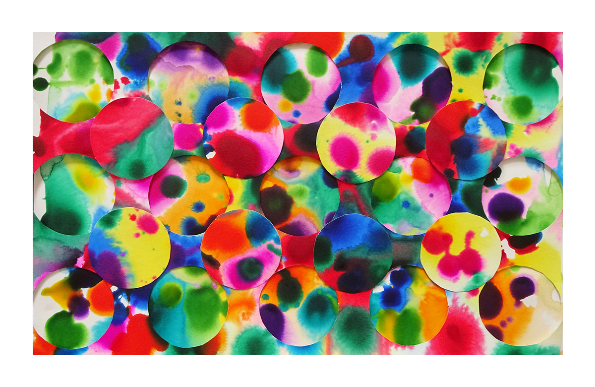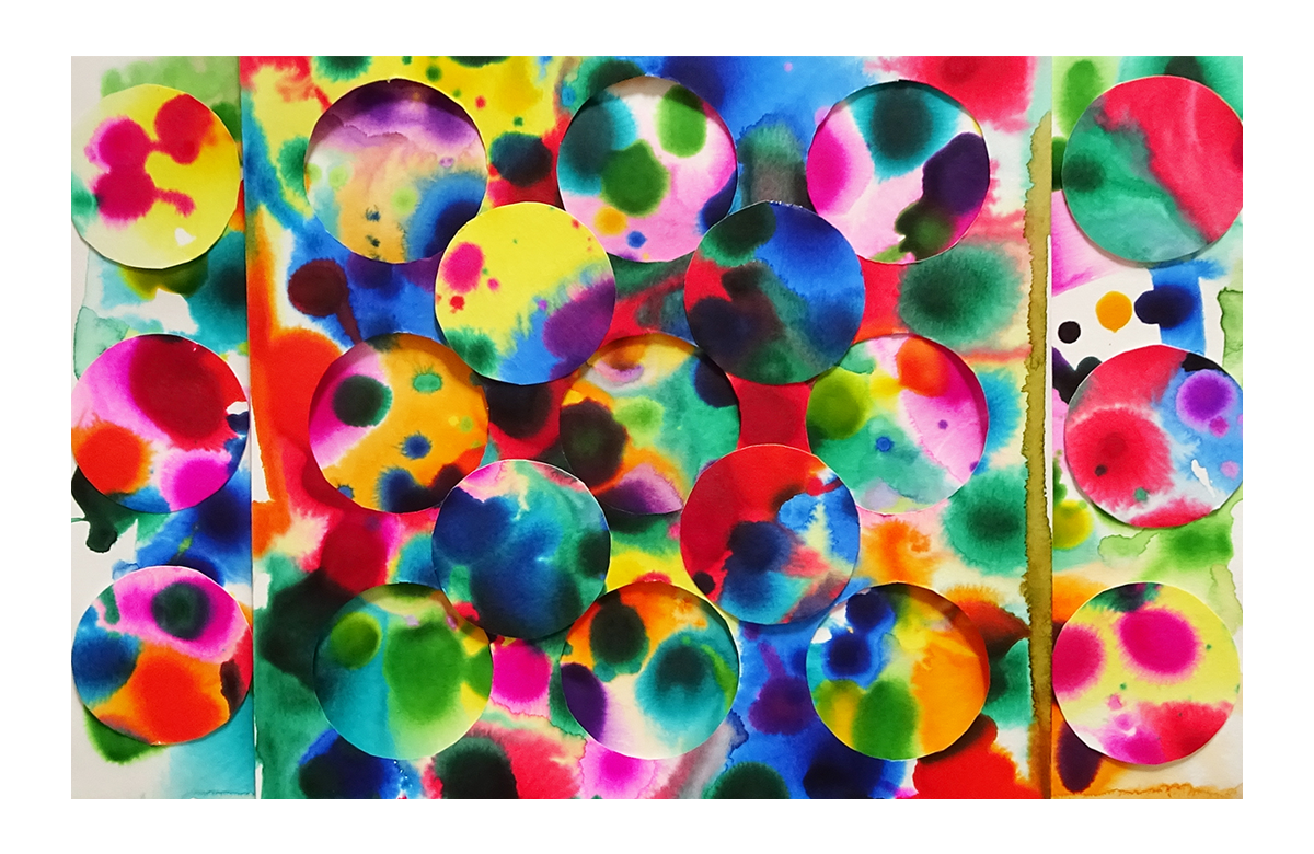 “This prompt was perfect for an idea I’ve wanted to try for awhile. I did a layered collage with a drawing and a map with circles cut out on top awhile ago, but I wanted to try it with two layers of pattern, and the lights were a good inspiration. It took me a while to figure out how to do the watercolor to get the effect I wanted, but finally I got two paintings I thought would work well as layers. I cut circles out of one of them, and made different arrangements of all 3 components–ground, cut circle painting, and the circles themselves. I’ve photographed both the original elements and some different layerings. I was pleased with the way it managed to evoke the flashing and moving lights of the film.”