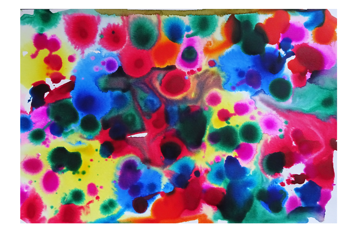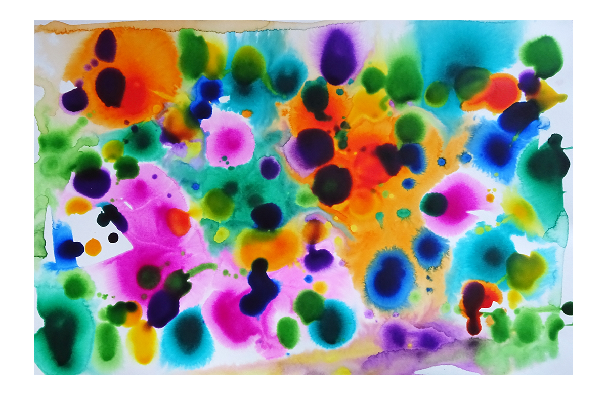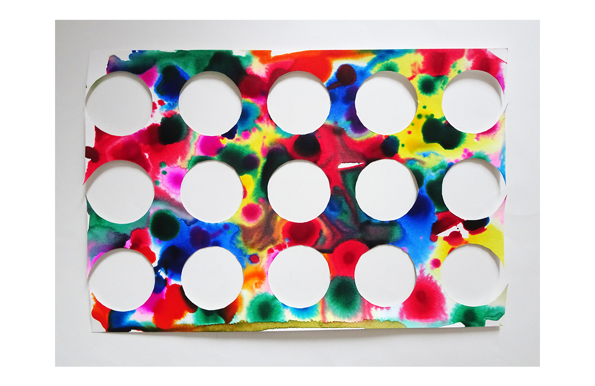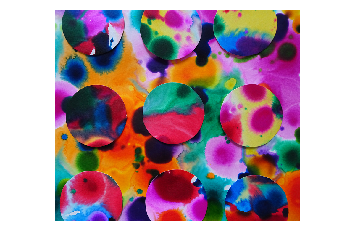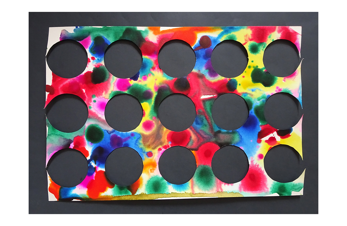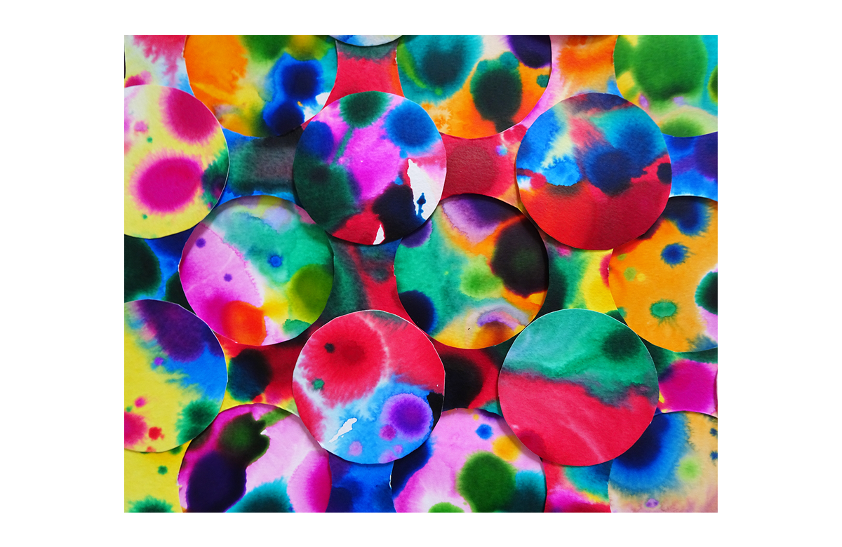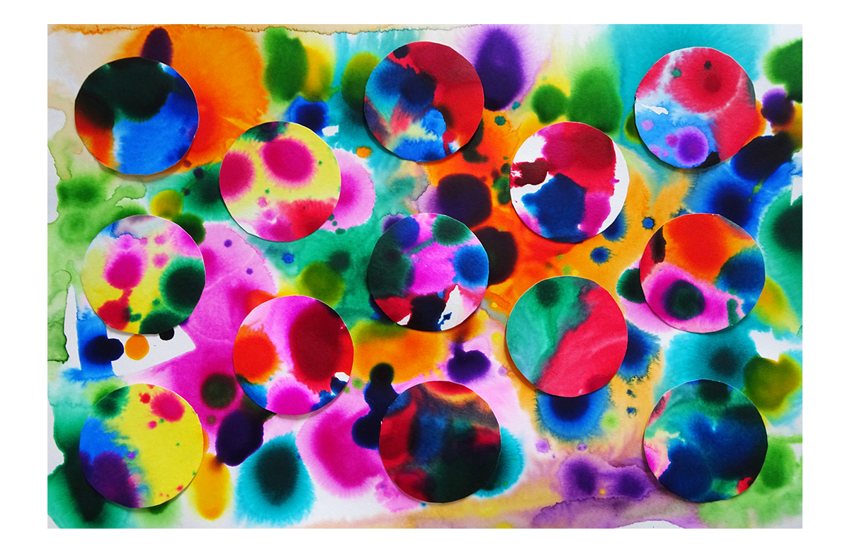 “This prompt was perfect for an idea I’ve wanted to try for awhile. I did a layered collage with a drawing and a map with circles cut out on top awhile ago, but I wanted to try it with two layers of pattern, and the lights were a good inspiration. It took me a while to figure out how to do the watercolor to get the effect I wanted, but finally I got two paintings I thought would work well as layers. I cut circles out of one of them, and made different arrangements of all 3 components–ground, cut circle painting, and the circles themselves. I’ve photographed both the original elements and some different layerings. I was pleased with the way it managed to evoke the flashing and moving lights of the film.”
