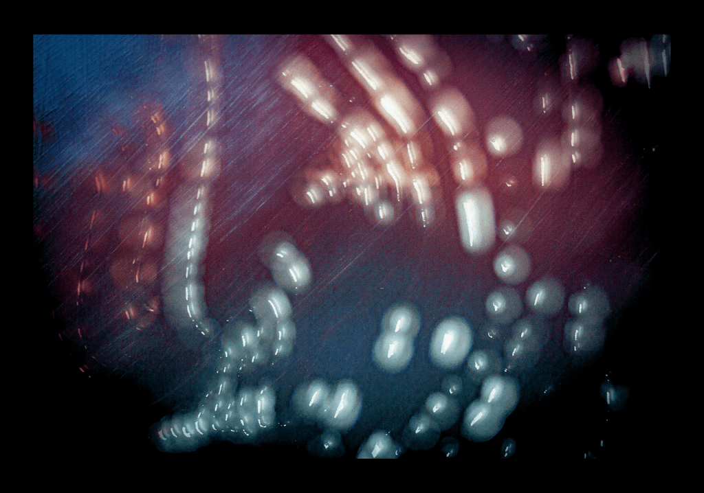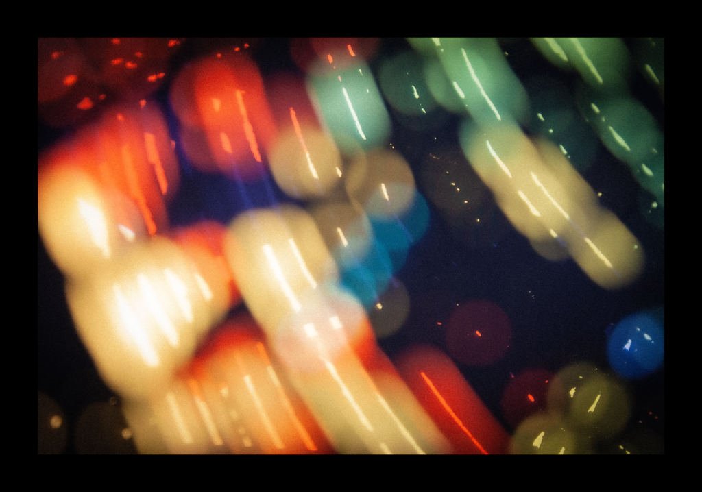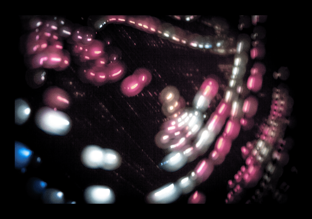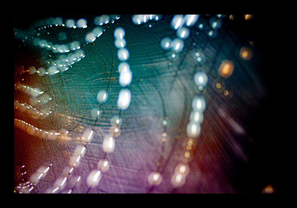With this playfulness very much in mind, I tried something quick and dirty: painting a sheet of glass with black acrylic, before scratching parts of the painted surface away in the form of lines of irregular dots and dashes. Very simply, the painted sheet of glass was then positioned in front of windows, bright environments and television screens, and the surface of the glass photographed. Sometimes, during one exposure, I would push the focus from pin-prick sharp to diffuse, which had the satisfying effect of ‘spherizing’ the scratched patterns on the surface of the glass, producing the illusion of strings of lights or illuminated bubbles. I don’t mind admitting some of the resulting images had me laughing out loud with pleasure, so closely did they recall the aesthetic of mid-century avant-garde animations and the like. It gave me a secret squizz of pleasure too – the trick of it, the very fact of me not, in fact, photographing strings of fairy-lights or pastel-coloured Christmas baubles, or those long balloons out of which you might fashion a poodle: no, just a sheet of glass, painted black, with marks scratched into it using the end of a matchstick and a zester swiped from the kitchen drawer.