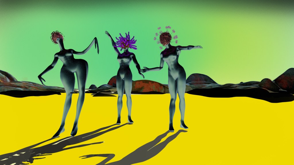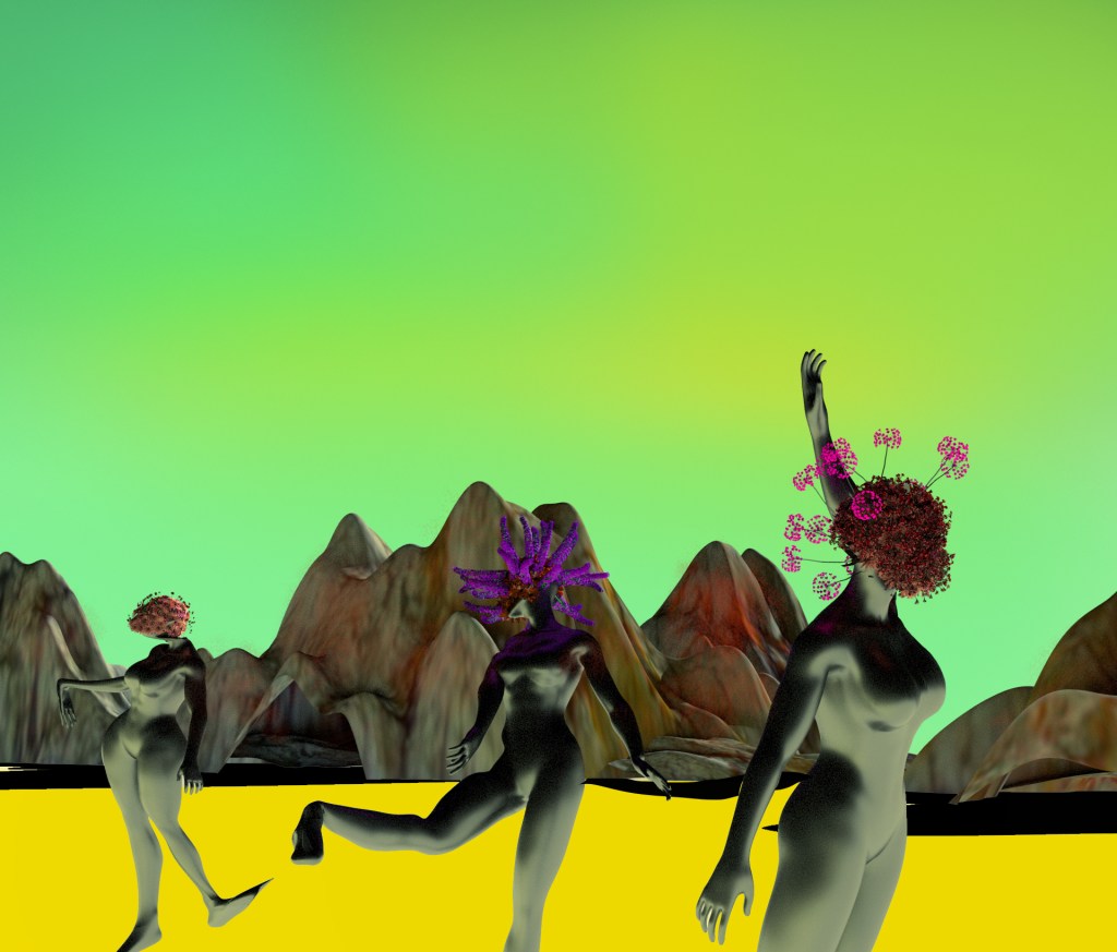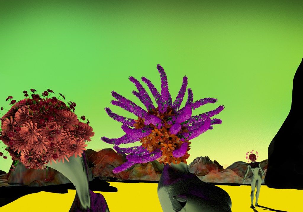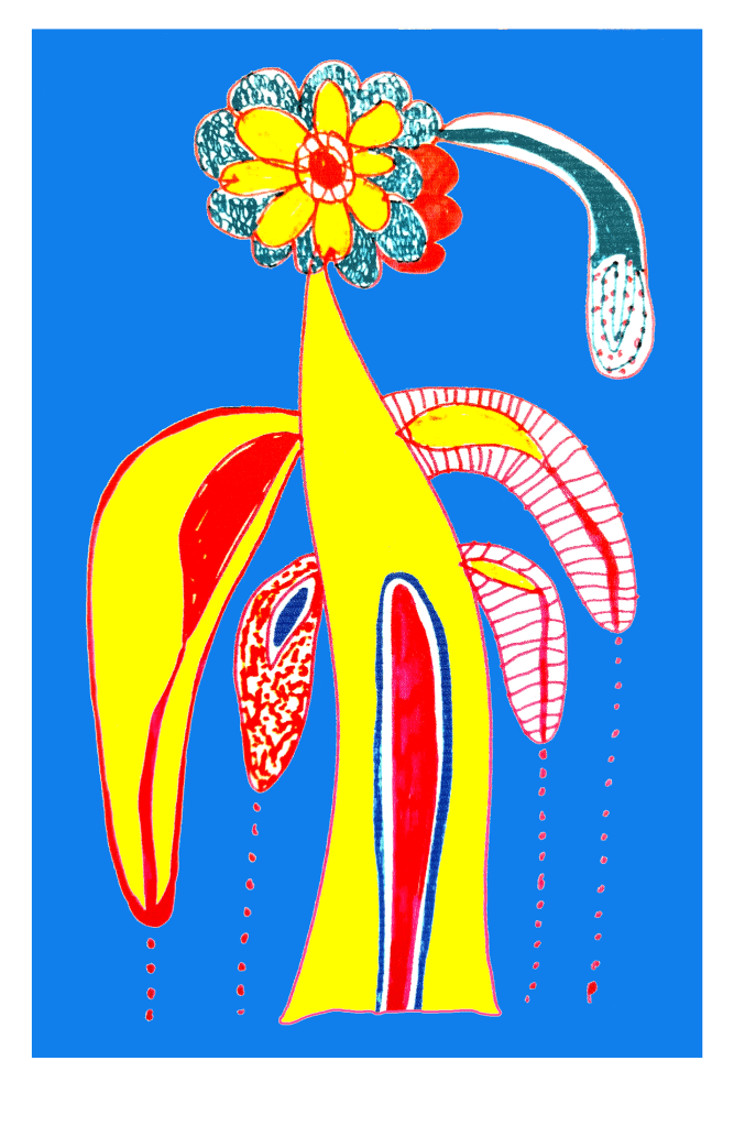“This prompt made me think of world conditions acting on Surrealists – where do movements come from – so my response is a meld of the flower head with environmental issues, and how I think the level of denial everyone has, to so many issues, comes into play.”