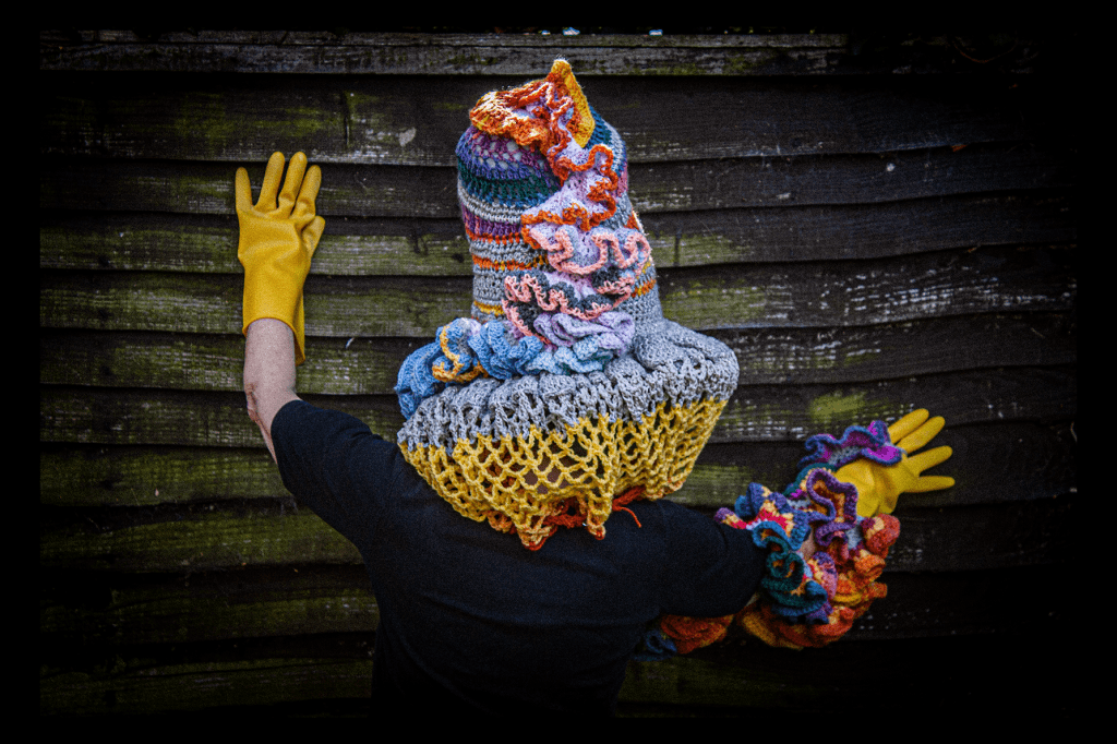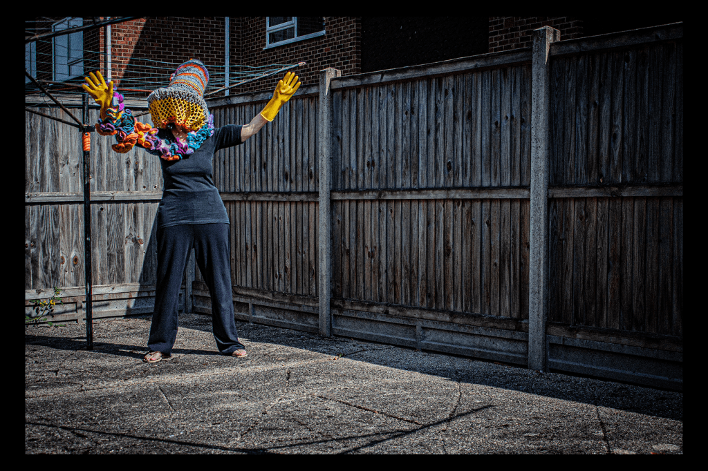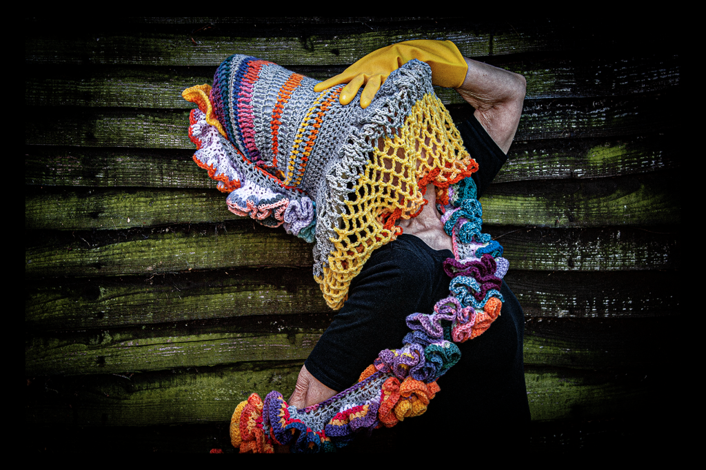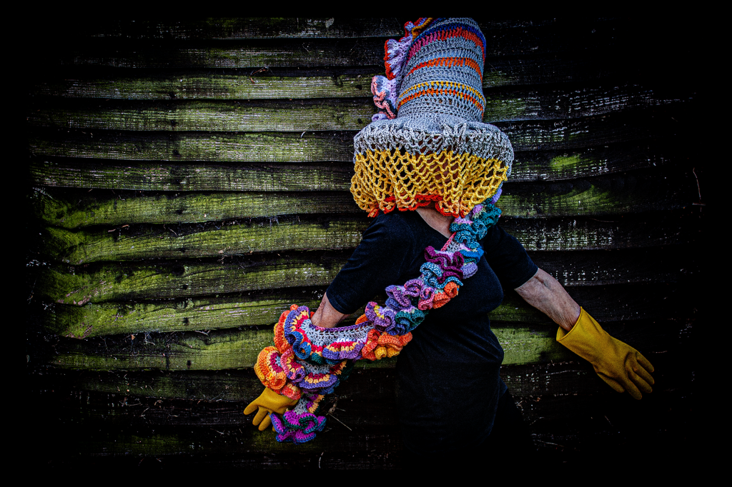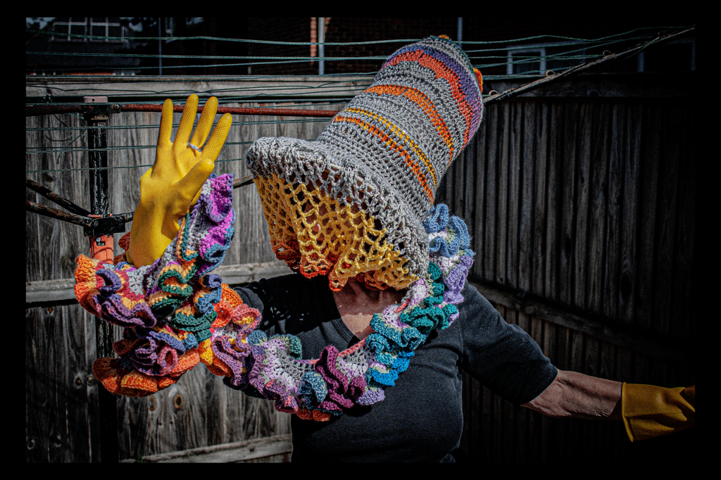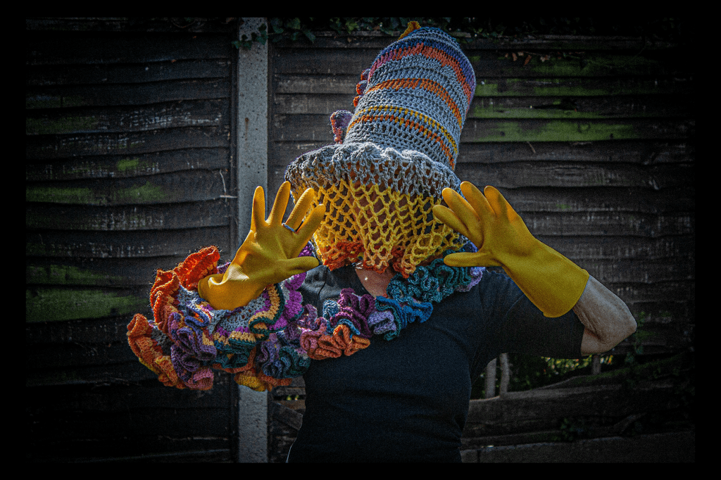 “I was surprised to find this photo was taken as early as 1936. When I first saw it, it reminded me strongly of a 1950-60’s fashion shot. I have no references for this, it was just what came to mind. However, it got me thinking about fashion, face-coverings, Gertrude Shilling and Afghanistan’s women, and I started working on hyperbolic crocheted decoration for an old straw hat. However, while hyperbolic crochet makes amazing, wonderful shapes, the process itself can be tedious, and as I worked on it, my brain ran on to thinking about what had prompted Sheila Legge to create that image in the first place. What was she trying to convey? What was I trying to convey? The old straw hat was discarded, a new hat structure created, and as my hands worked on the hat, my brain worked on the process, resulting in the short poem below. The poem came after the hat, so it may make sense to read it after viewing the images. Or not at all. Up to you.”