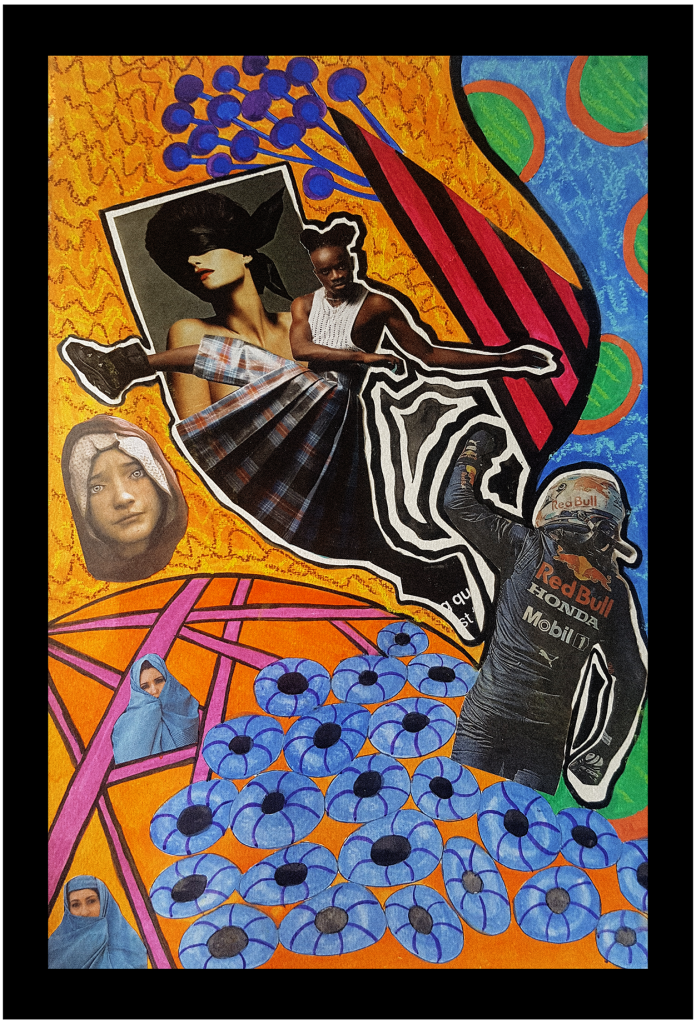“I’m not sure if this is surrealism or the stuff of nightmares! I think, subconsciously, I was reflecting on the plight of women under the Taliban regime ,and on other women who are trying to break free from cruelty etc. Don’t ask me what the blue doughnuts symbolise – maybe hunger? Enjoyed doing this and definitely made me think and be thankful.”