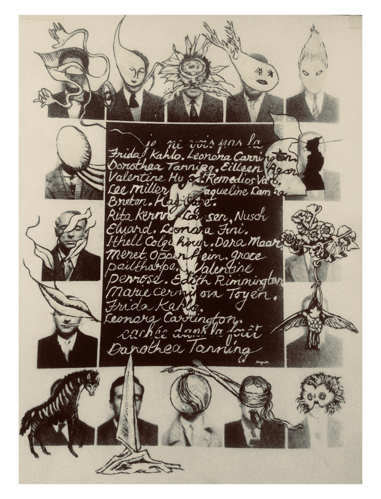 “Robert Benayoun suggested that while Surrealism exalted ‘la femme’, the Surrealists did not equally revere ‘les femmes’. The histories of female Surrealists have often remained buried under those of male Surrealists, who have gained wider public recognition. Well, Sheila Legge with her head covered, sums this up nicely, as does the Magritte painting surrounded by the above. Referencing their artwork and naming all the mainly, “forgotten” women, I felt went somewhere towards redressing the balance!”