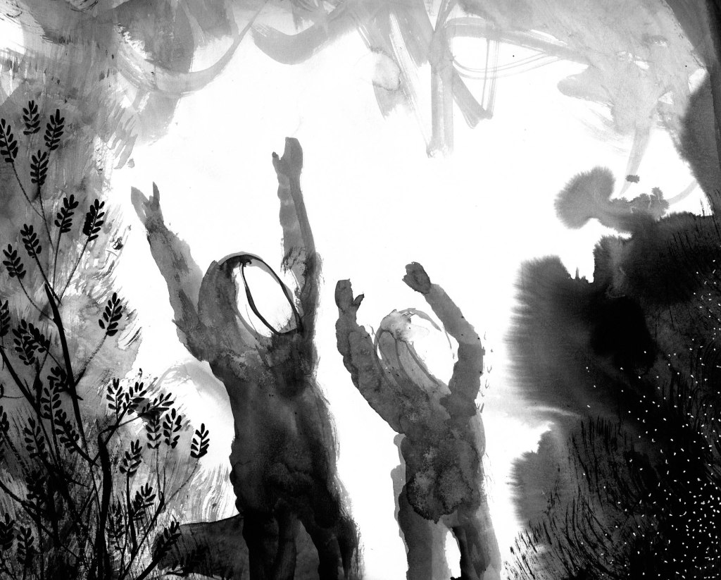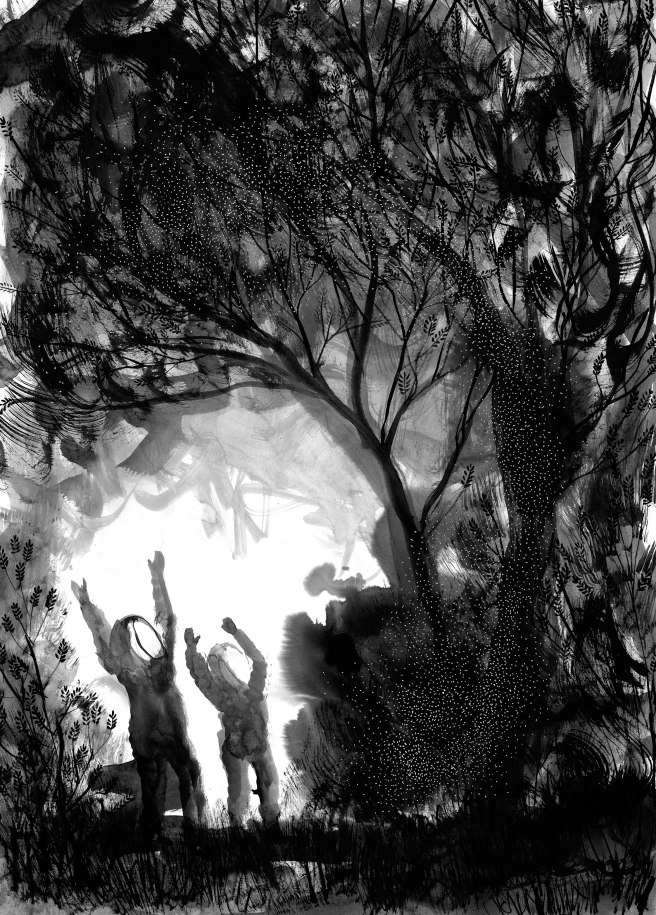 “The prompt could hardly have been more suited to me and my natural inclinations. It’s inky and leafy and Australian. What strikes me most is the combination of the loosest of ink splatters with far more careful and detailed patterning. I was going to explore some inkiness yesterday (Yep! Last minute again!) to see where an observation of Mungkuri’s work might take me, especially with regard to the use of white ink patterning over the top of the looser ink layers. But before I could begin something happened… Our bees swarmed! Later, I had a bit of a go at my inky exploration of Peter Mungkuri’s plant drawings, but my mind was full of bees. And joy. So it became an illustration of Hugo and me, arms uplifted to the swarming bees.”