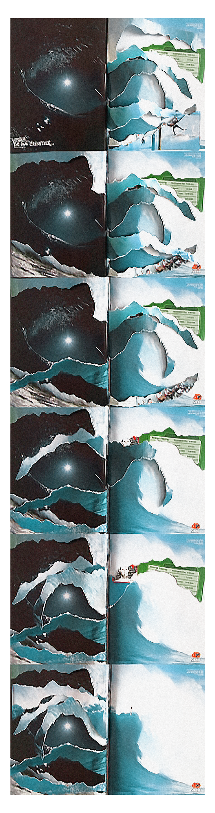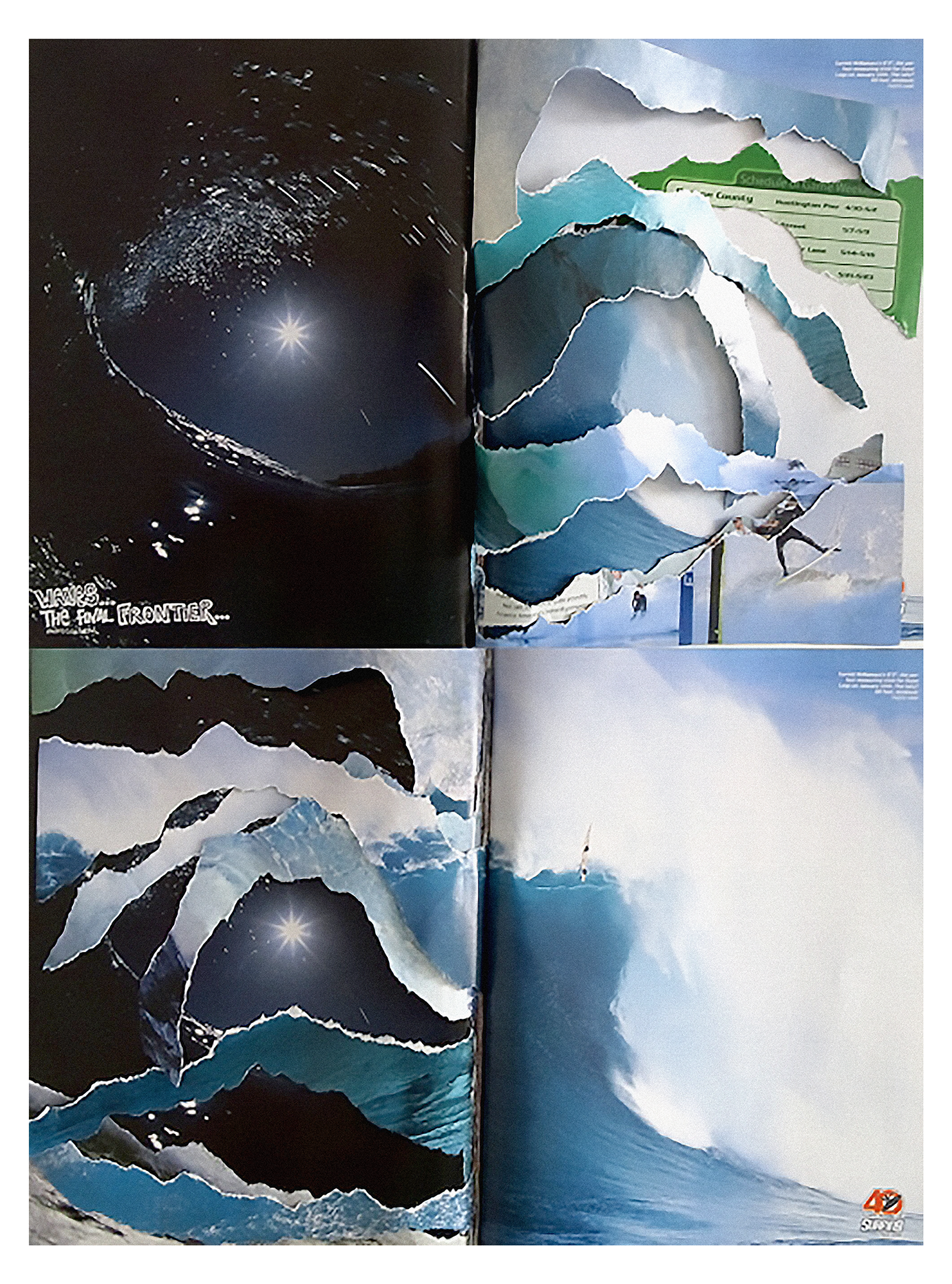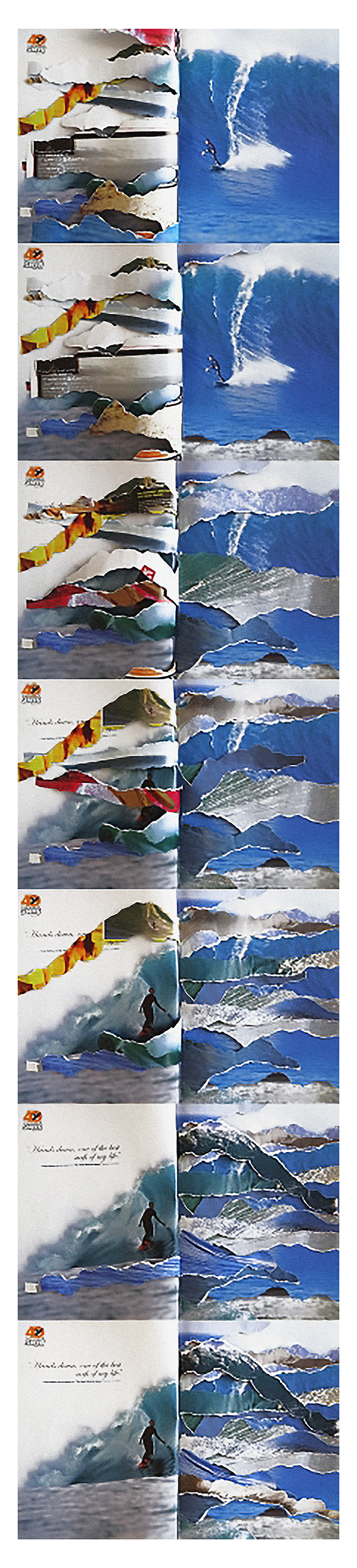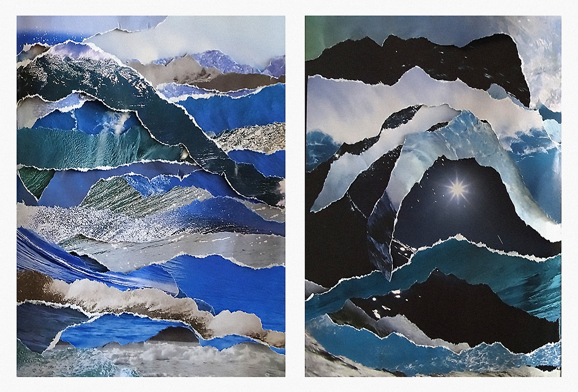“The layering of the different elements got me thinking about an idea from Claudia McGill that I had copied and saved which I recently found when sorting out files. She took a magazine and tore pages partially out to create a new layered collage-like image. I did not have any magazines with trees, but I have lots of surfing magazines I bought on eBay because they are full of images of sea and sky to use in collage. So I layered the ocean. My poem is a shadorma quadrille for dVerse, using the word provided by Linda, linger.”