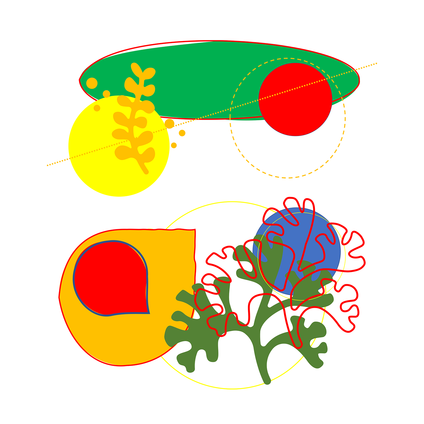 One of the application’s off-the-peg tools is ‘Insert Shapes’ – which allows you to draw simple shapes with a quick drag of your mouse, and then colour and outline them as you see fit. I used Powerpoint to produce collections of basic shapes – circles, rectangles and squares (and later, some of Powerpoint’s cookie-cutter plant form icons) – and then brought these ‘cut-outs’ into Photoshop, where I set about layering them one on top of the other with as much immediacy as I could muster.