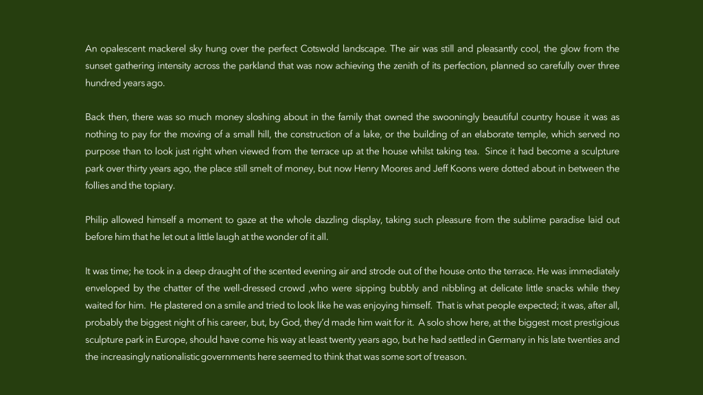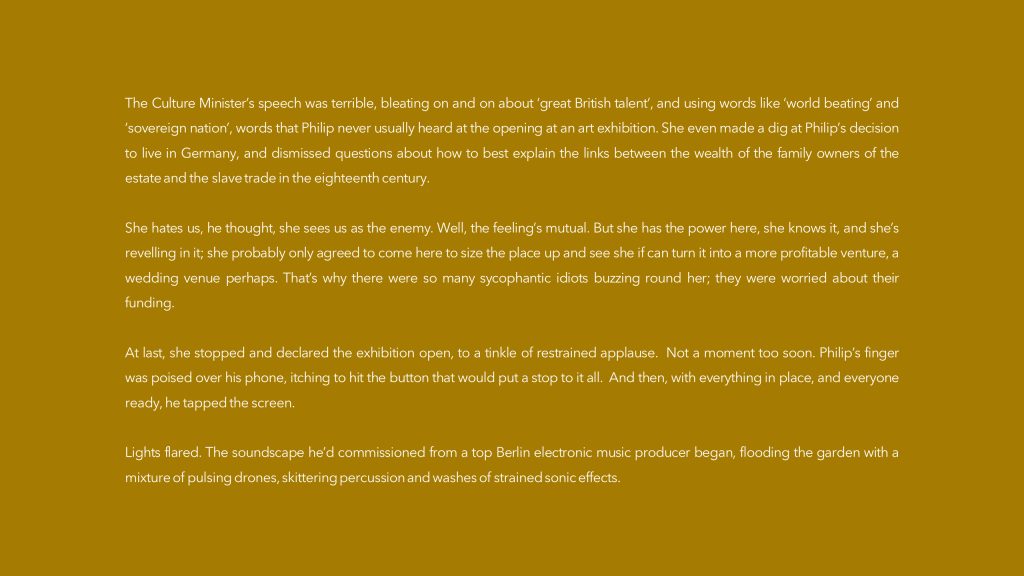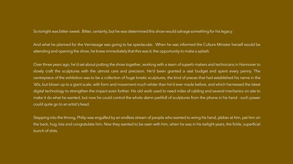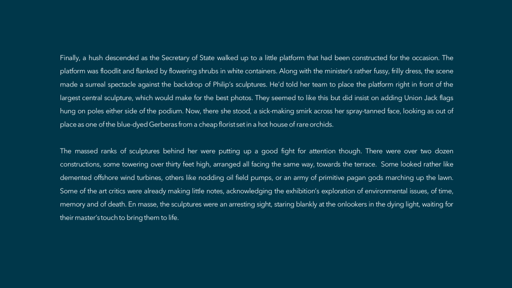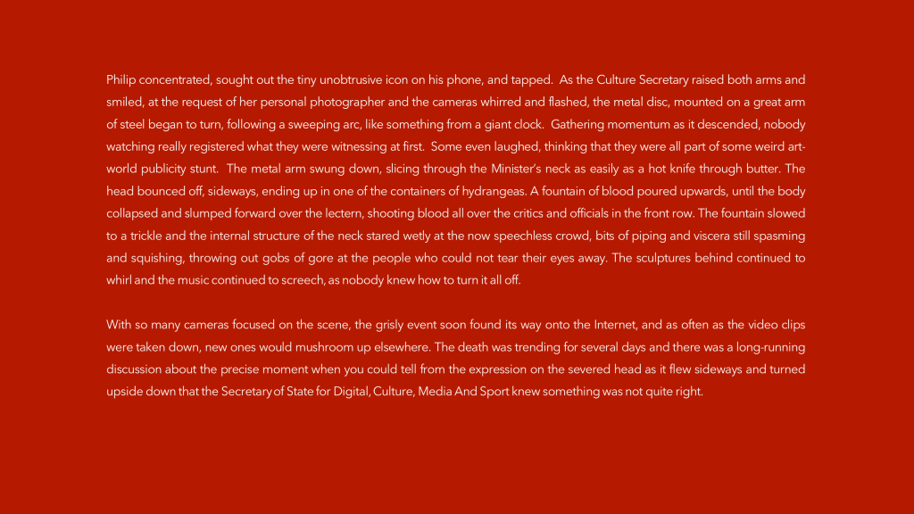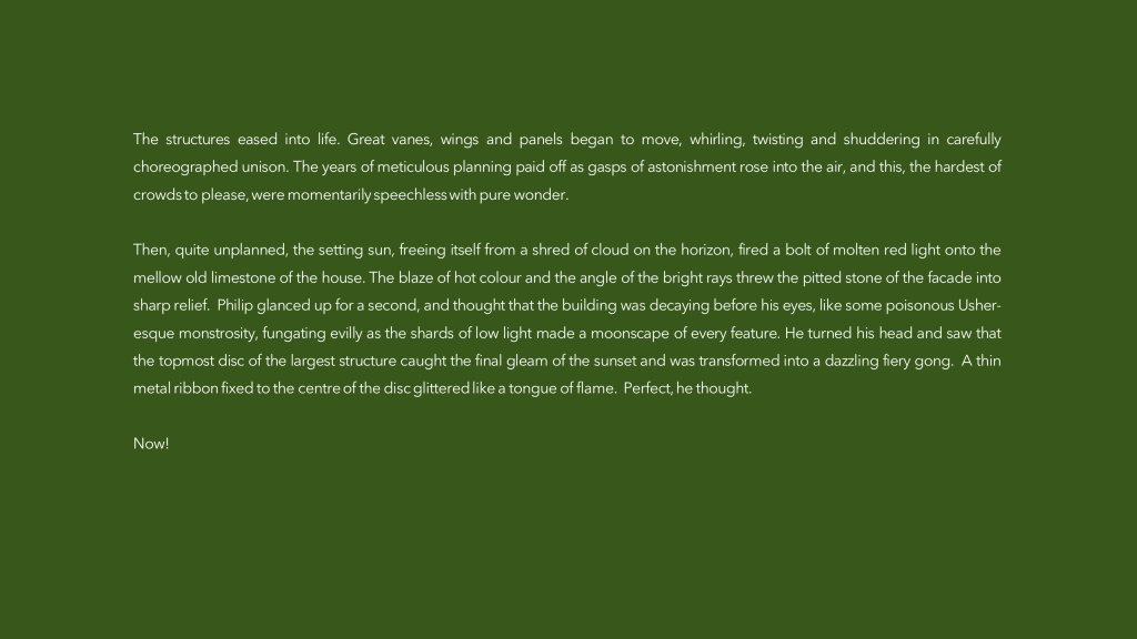 “I loved the prompt this week. I’m a big fan of Alexander Calder’s sculptures. By happy coincidence there’s a big exhibition of his work here in Berlin right now at the just-refurbished Neue Nationalgalerie. Quite how I came to write such a story in response to the beautiful, elegant mobile in the prompt is a bit of a mystery. I think too many mince pies and liqueur chocolates over Christmas sent me a bit funny!”