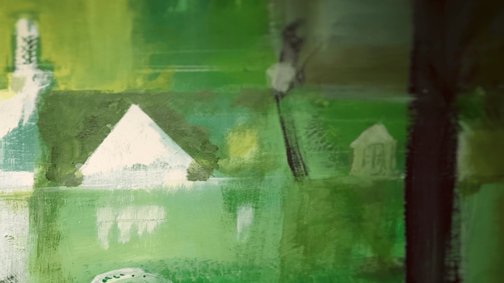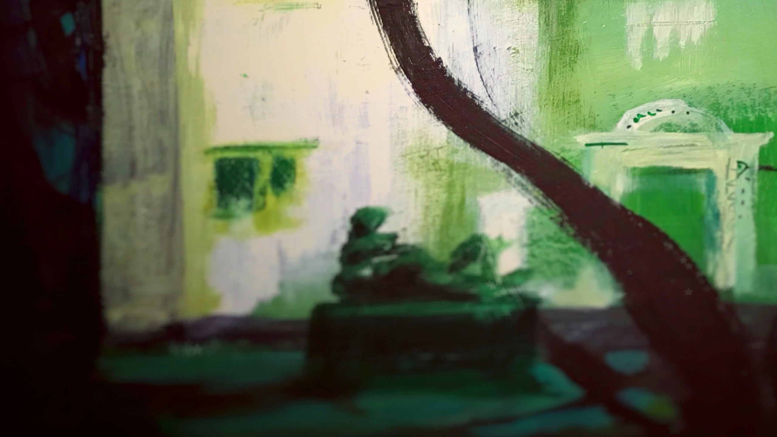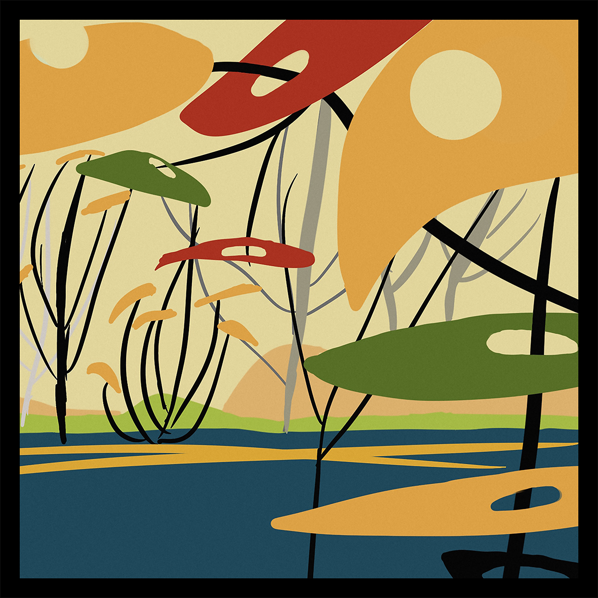 “When I saw the colours and shapes of Calder’s mobile, I was reminded of the seventies, and I have always been in love with mid-century architecture, so itching to do some environment art, I drew a house surrounded by Calder’s colours and shapes.”
