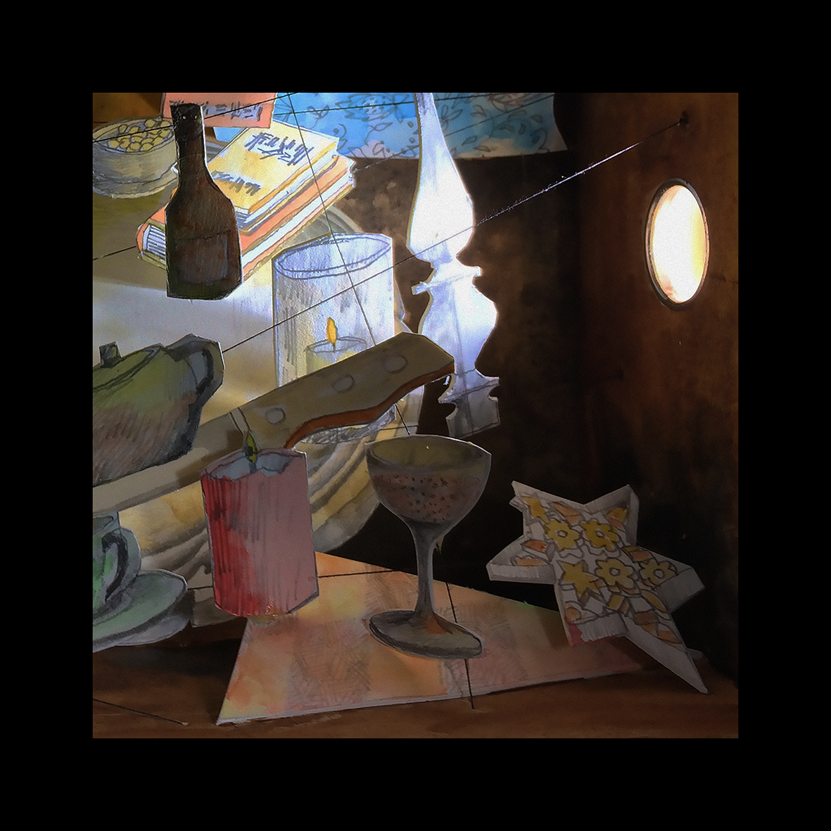 “Happy New Year to all. Tried creating a still-life mobile, hoping to better view ‘variations on a theme’ in support of being freer with composition when painting. Well that failed! Rethinking demanded reusing again these miniature cut-outs in a 3-D manner. How I wish magic powers could float objects where ever they are placed in space!”