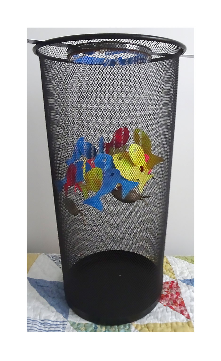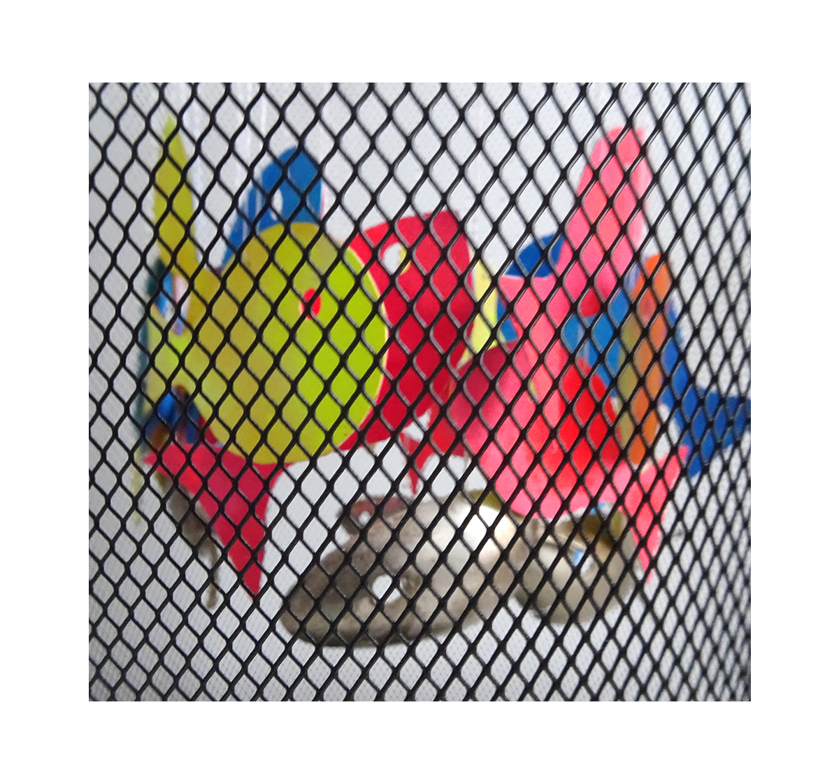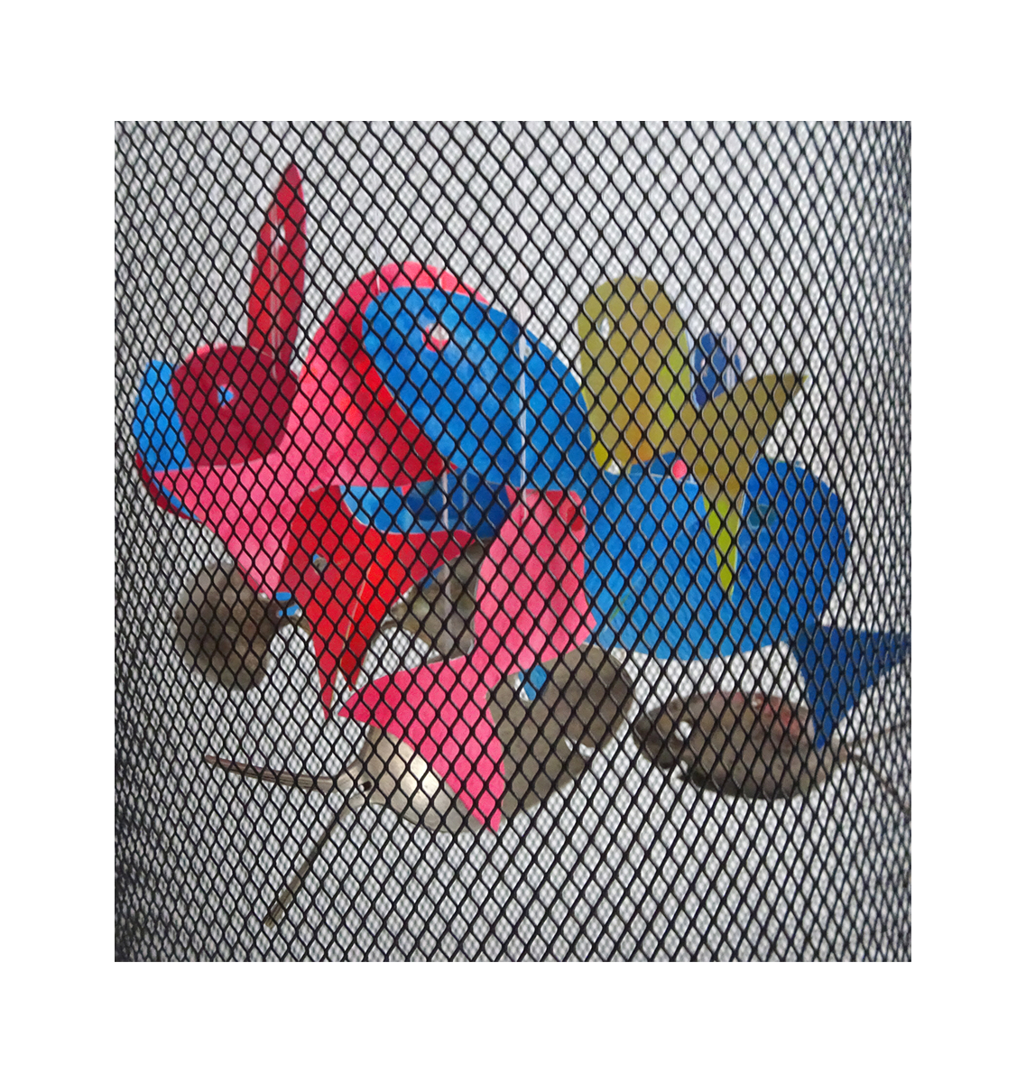 “Once again, I had an inconclusive result, but now I know how to get closer to my original idea, had I time – and a spare wastebasket! One thing I really like about these challenges is the ephemeral nature of them; this will exist only in photos, but it may lead to other more permanent installations, who knows? It’s always fun to try new things. The metal in the Calder mobile reminded me I had a fish mobile/wind chime made of recycled spoons that my brother had given me years ago, which I never could figure out how to hang correctly. So I took it apart, traced the fish, painted watercolor paper in primary colors, and made more fish. I used a hole punch to make eyes, and simple cotton thread to hang them. I had an idea to use an embroidery hoop and circle the fish around it at different heights, but I didn’t think of the wastebasket to hang it in until after I had attached the fish. I think if I hung the hoop over the wastebasket first, and then attached one fish at a time, I could get a better, more balanced result. Another problem was no sun for the entire week; I tried three different lightings to photo it, but natural light, I’m sure, would have been much more satisfying. But they did move and the metal occasionally chimed, so a definite improvement over the original set up, and I like the interaction with the mesh of the wastebasket too.”