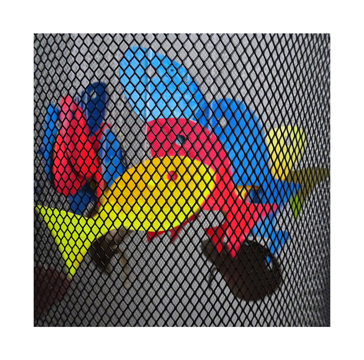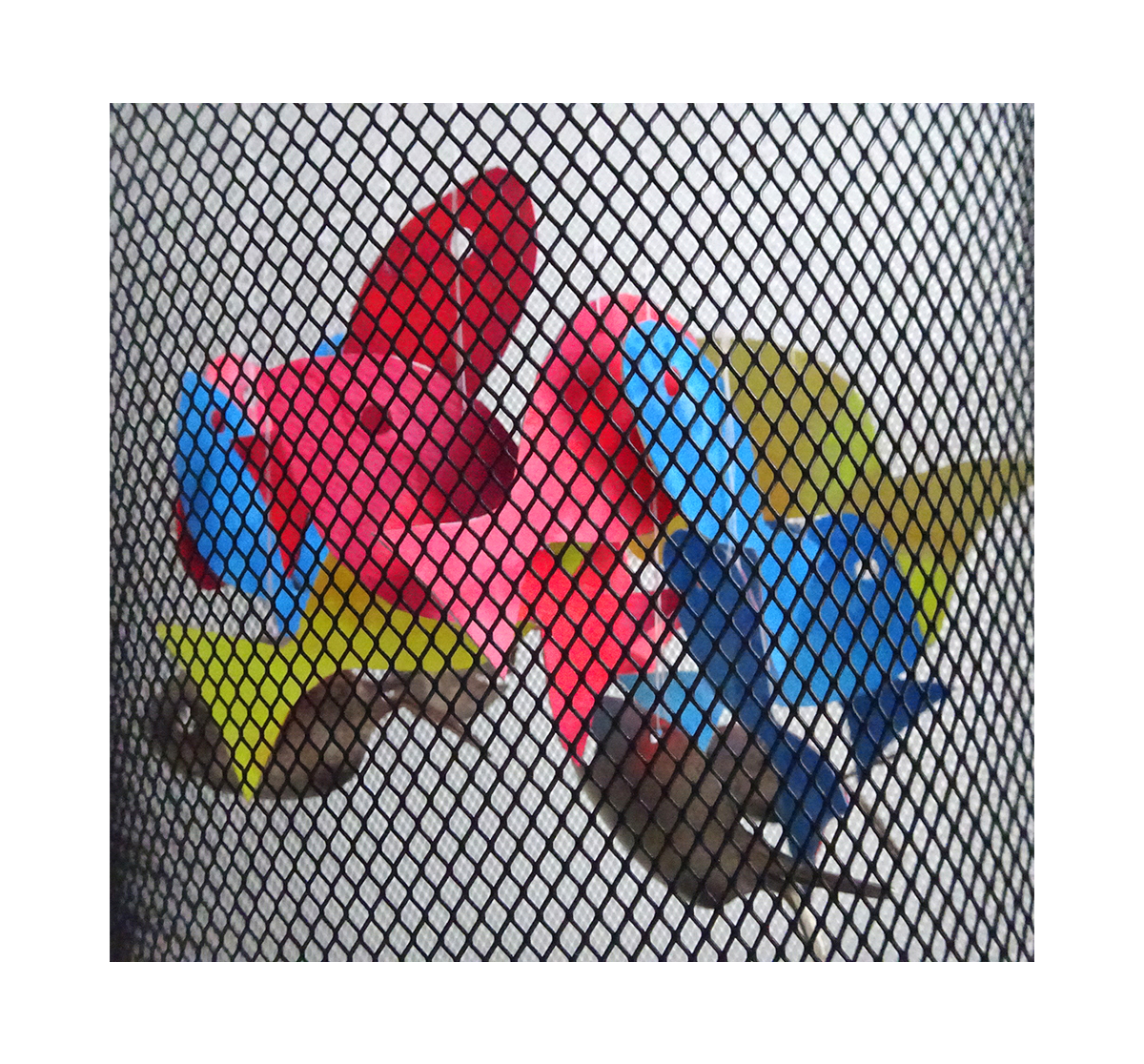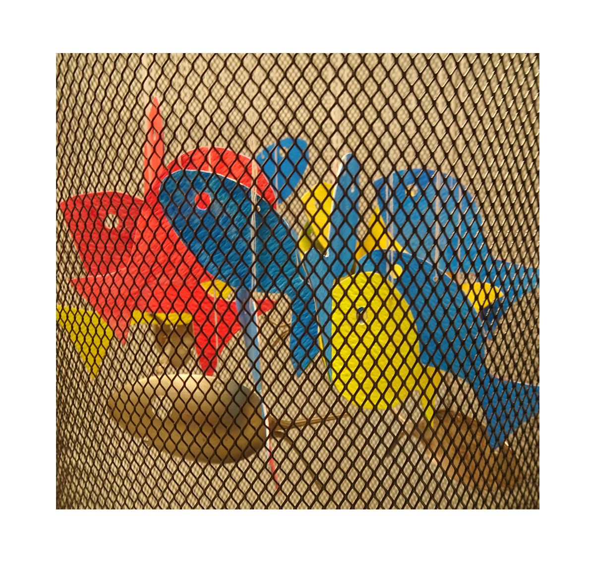 “Once again, I had an inconclusive result, but now I know how to get closer to my original idea, had I time – and a spare wastebasket! One thing I really like about these challenges is the ephemeral nature of them; this will exist only in photos, but it may lead to other more permanent installations, who knows? It’s always fun to try new things. The metal in the Calder mobile reminded me I had a fish mobile/wind chime made of recycled spoons that my brother had given me years ago, which I never could figure out how to hang correctly. So I took it apart, traced the fish, painted watercolor paper in primary colors, and made more fish. I used a hole punch to make eyes, and simple cotton thread to hang them. I had an idea to use an embroidery hoop and circle the fish around it at different heights, but I didn’t think of the wastebasket to hang it in until after I had attached the fish. I think if I hung the hoop over the wastebasket first, and then attached one fish at a time, I could get a better, more balanced result. Another problem was no sun for the entire week; I tried three different lightings to photo it, but natural light, I’m sure, would have been much more satisfying. But they did move and the metal occasionally chimed, so a definite improvement over the original set up, and I like the interaction with the mesh of the wastebasket too.”