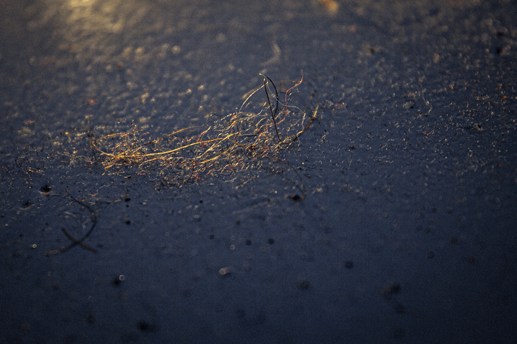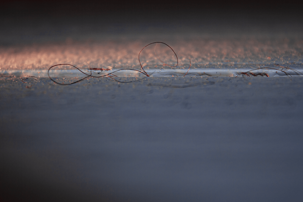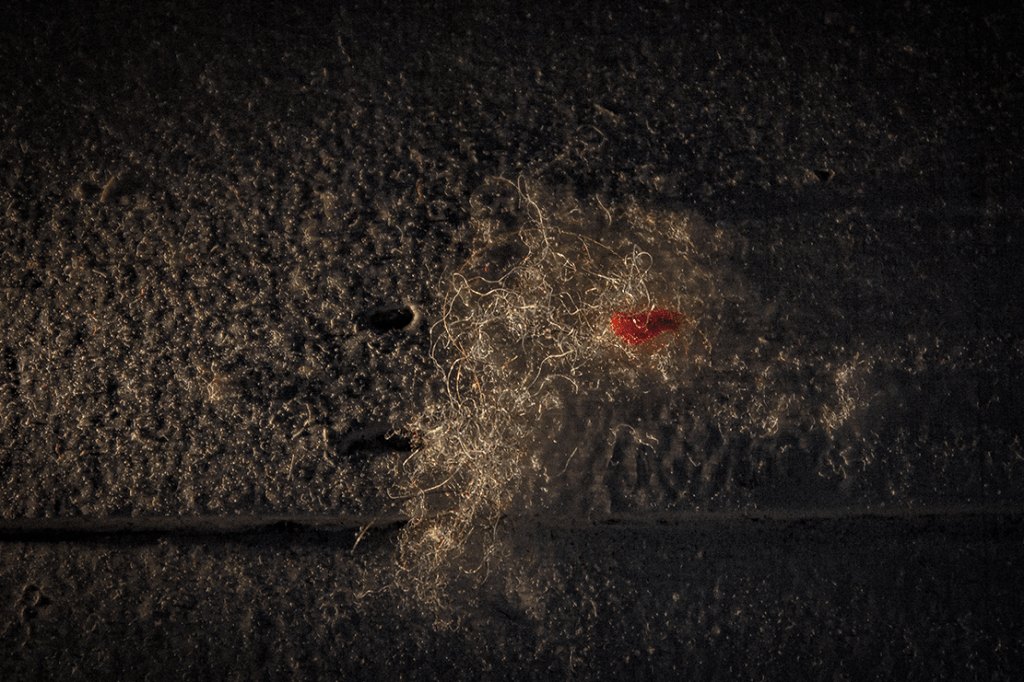 Featured here are those sites of domestic shame: the grill pan, the unwashed hob, the dust-bunnies under the bed and behind the door, the stray hairs, beard-based or otherwise, once connected, now disembodied and abject, and also the cropping up of balls of bright red fluff, from my socks I think, but as widely dispersed as spores.