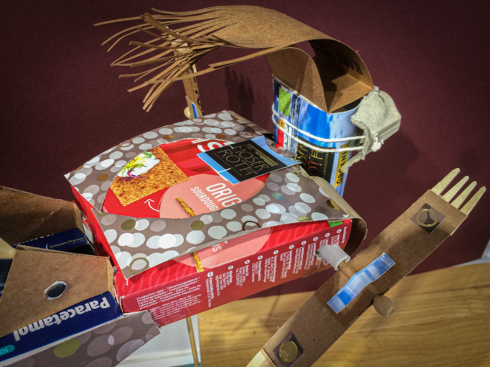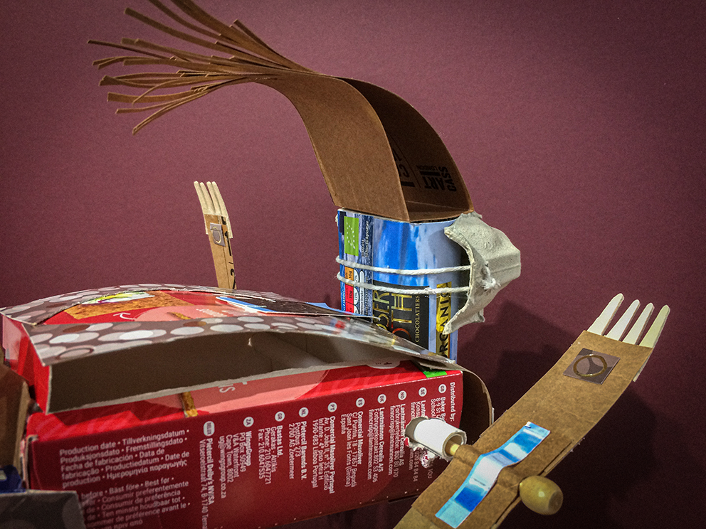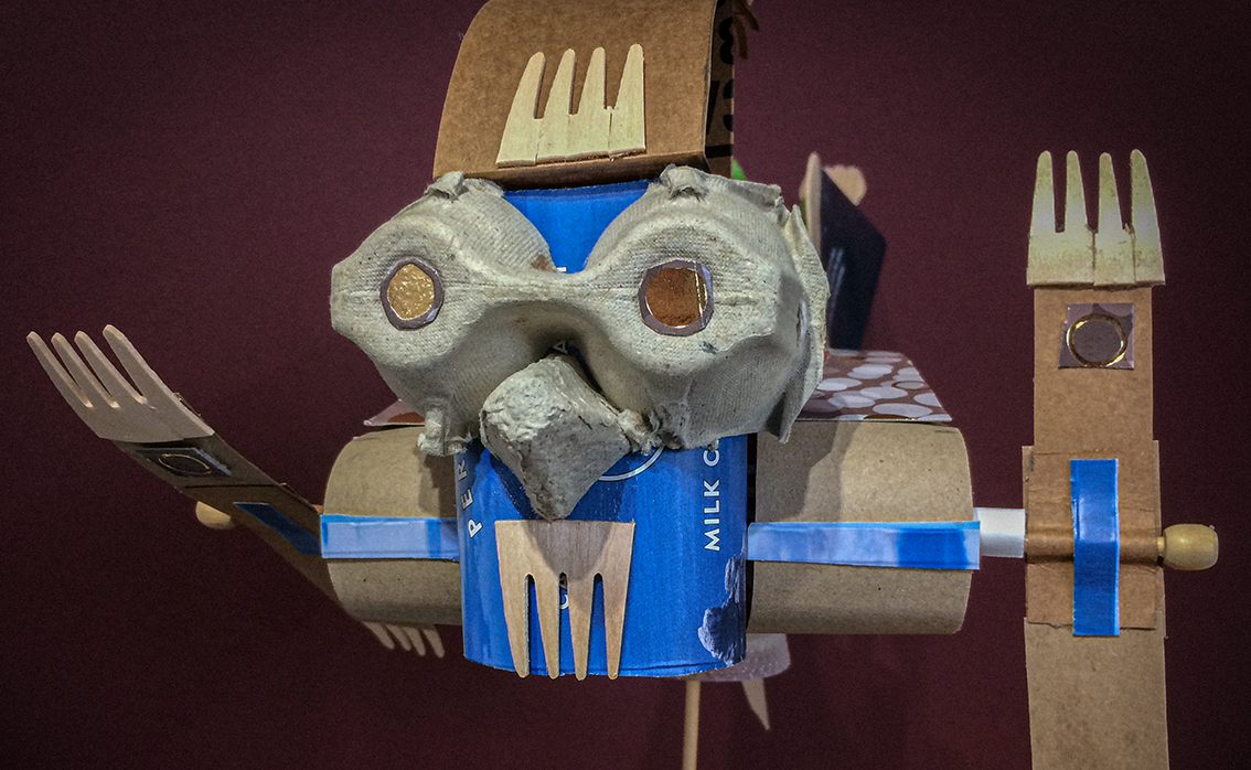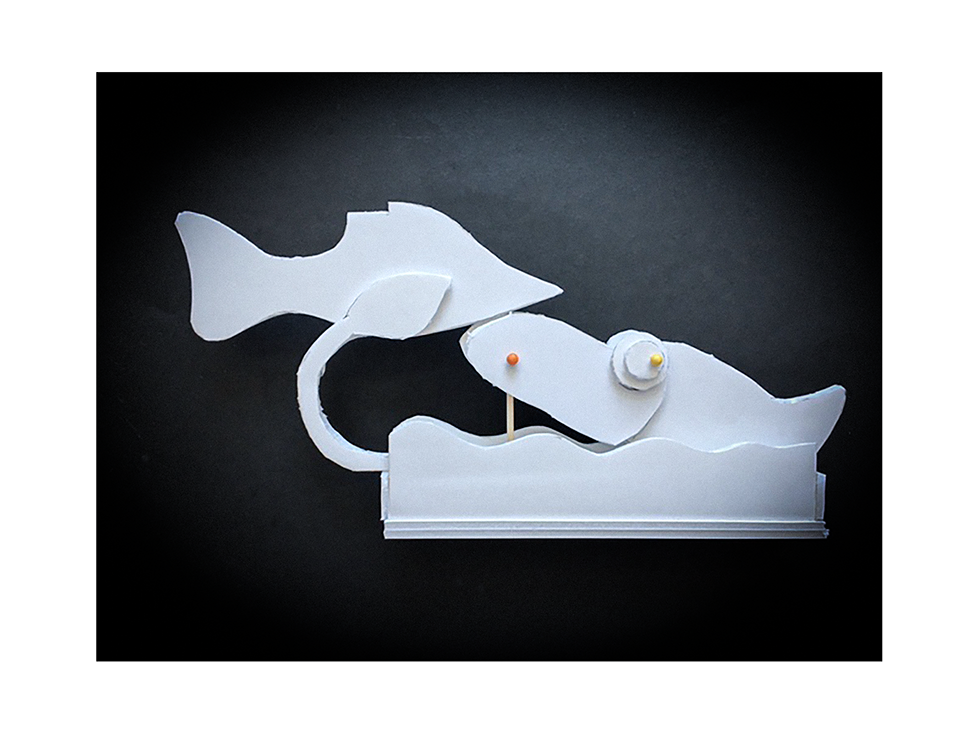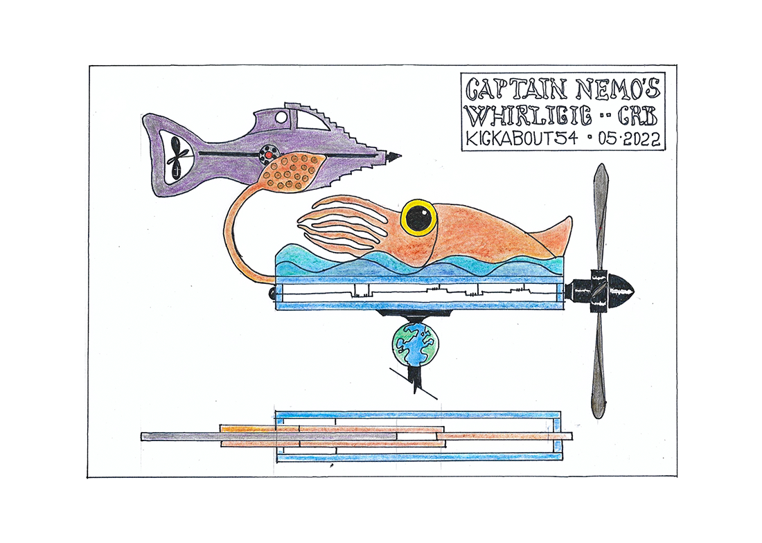“Rowland Emett was a cartoonist and sculptor of automata. He created things that are whimsical, English and eccentric and which serve the purpose to raise a smile and be enjoyed (Far Tottering and Oyster Creek Branch Railway Festival of Britain 1951). To me, his work is like a cross between early steampunk and Festival of Britain surrealism. I also wanted a theme to work around, and an illustration of the cross section of the (art nouveau/steampunk) Nautilus in a 1950’s Disney children’s book provided the theme. The first idea was to imagine a whirligig (generally a wind driven automata) for Captain Nemo’s garden. Unfortunately, he never made land and I am no mechanical engineer, but I did put one together and rough-tested it with white card model. However, a lot of time was spent in the processing and considering its movement, and I felt the fantasy and whimsical Emmet elements were getting a little lost, so in the late and last hour, to refresh, I returned to doodling and to the train idea. Times up and I have a beginning and some initial responses. It’s been another great Kick-About and provided a lot of material to mine….. plenty more left in this Kick-About to chase.“