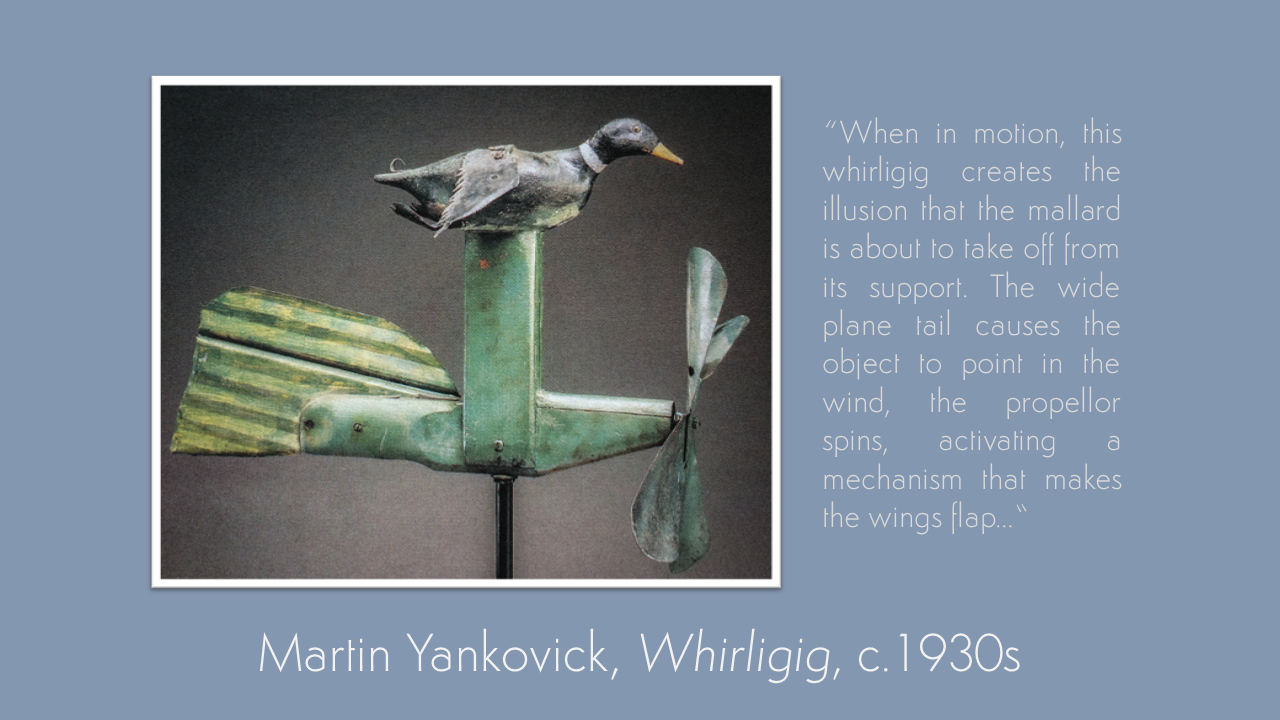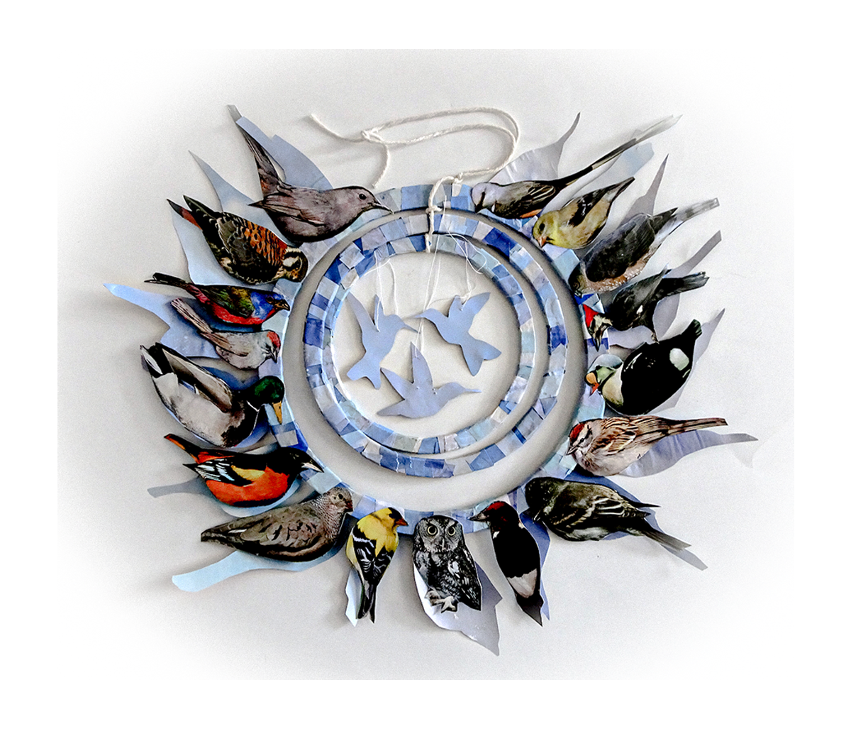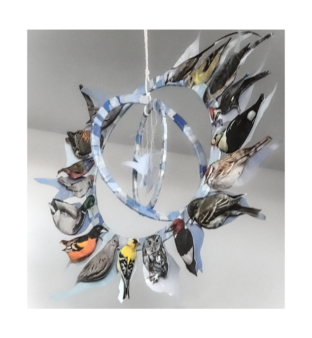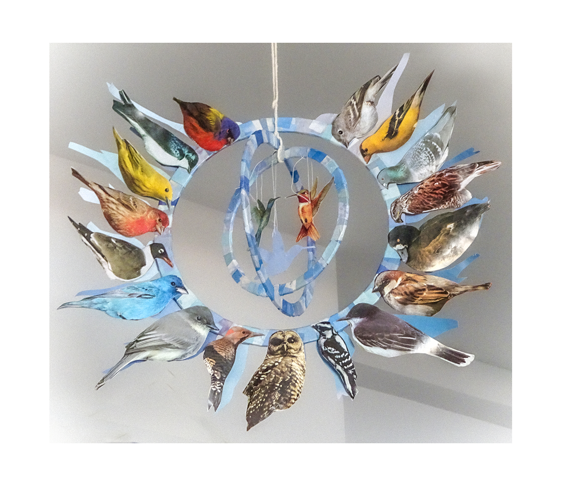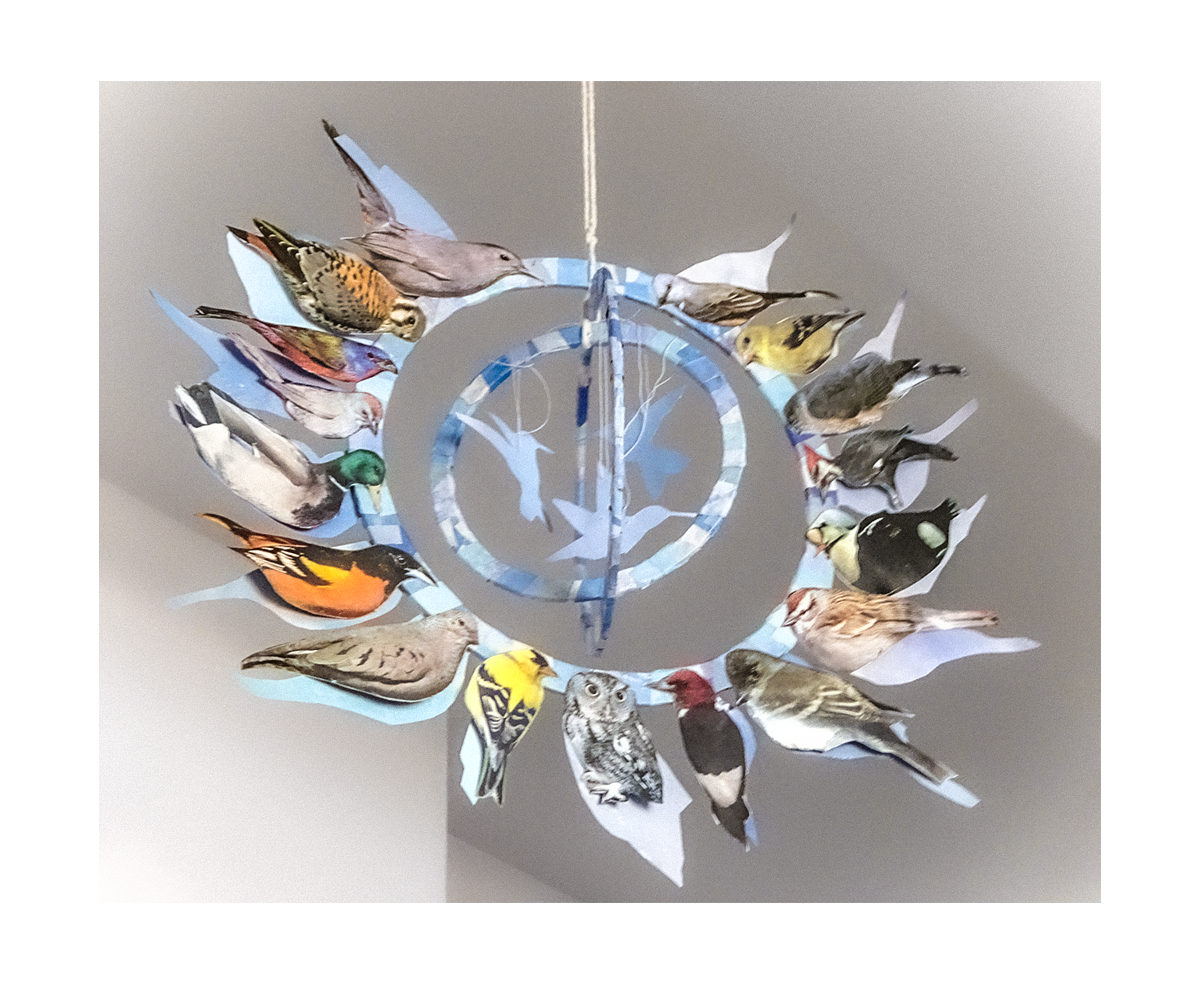 “I had no illusions I could construct an actual whirligig. But I figured I could do something that moved, with birds. As usual, not much like my original vague idea. And I had a very hard time finding a place to hang it where there wouldn’t be too much stuff in the background for a photo. As a result, the photos aren’t great, but they do give an idea of how it looks in motion. And now that it’s fan weather, it’s in motion much of the time.“