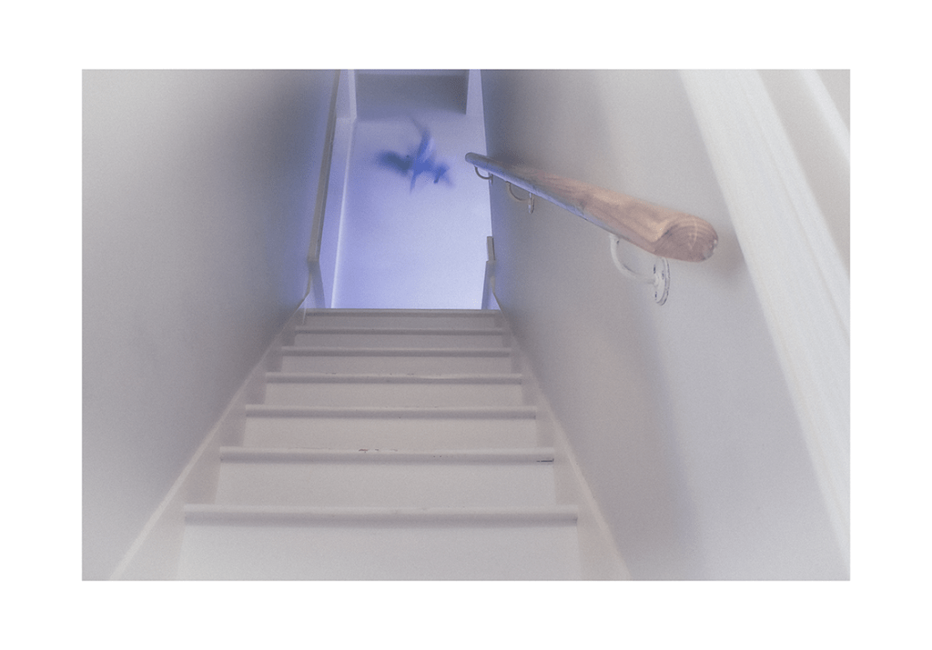 In response to the bird-based ‘whirligig’ prompt of The Kick-About #54, I set myself the ambition of photographing the movement of a flapping bird in the confines of my house, in the knowledge that a) I didn’t have a bird and b) birds are difficult to manage as the subject of a photographic shoot! For sometime now, I’ve been rather preoccupied with the transformative effects of long exposure photography, so taking some of this experience forward, I built a cardboard ‘bird shape’ from packing boxes (imagine a confection of wing-shapes slotted together in a vague cruciform construction), sprayed it white and blue, then tied it onto a length of white elastic. What followed was largely comical, as said ‘bird-shape’ was made to swing from one side of the room to the other, or ping through the air like something launched from a catapult. That said, the combination of time, light and movement is nothing if not transforming, and very soon I understood I did indeed have the semblance of a ‘thing with feathers’ – and perhaps a little more than this in some of the most successful images. More to follow.