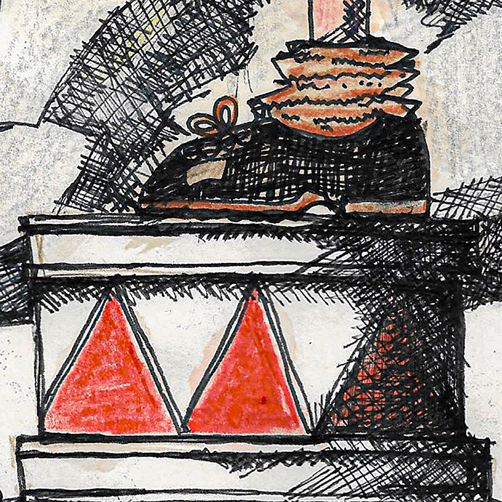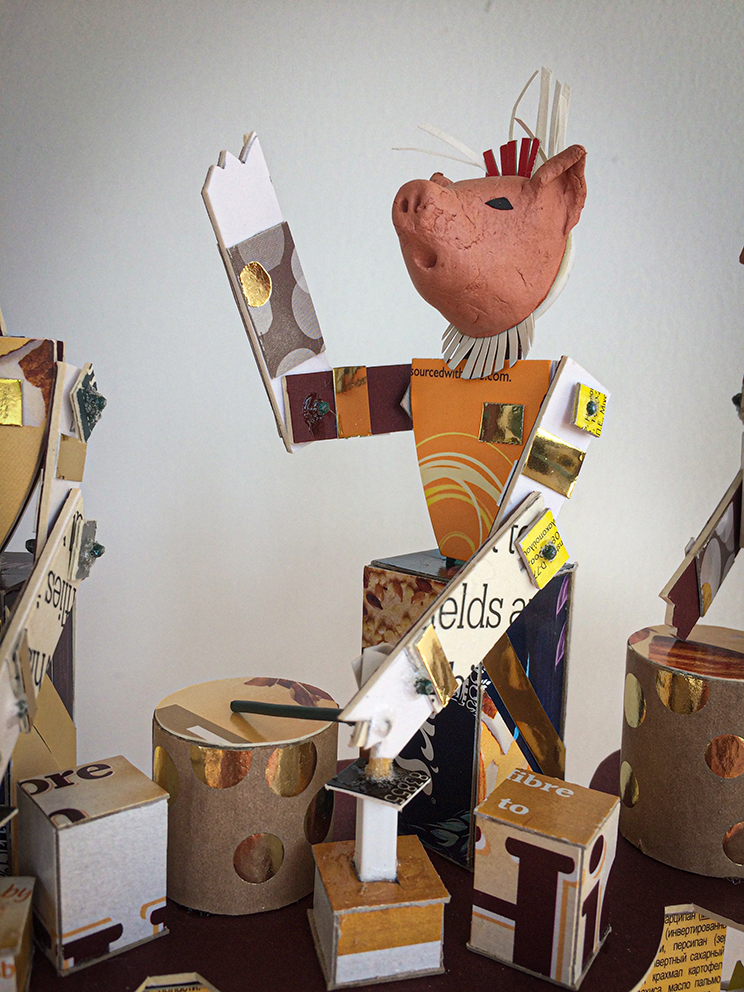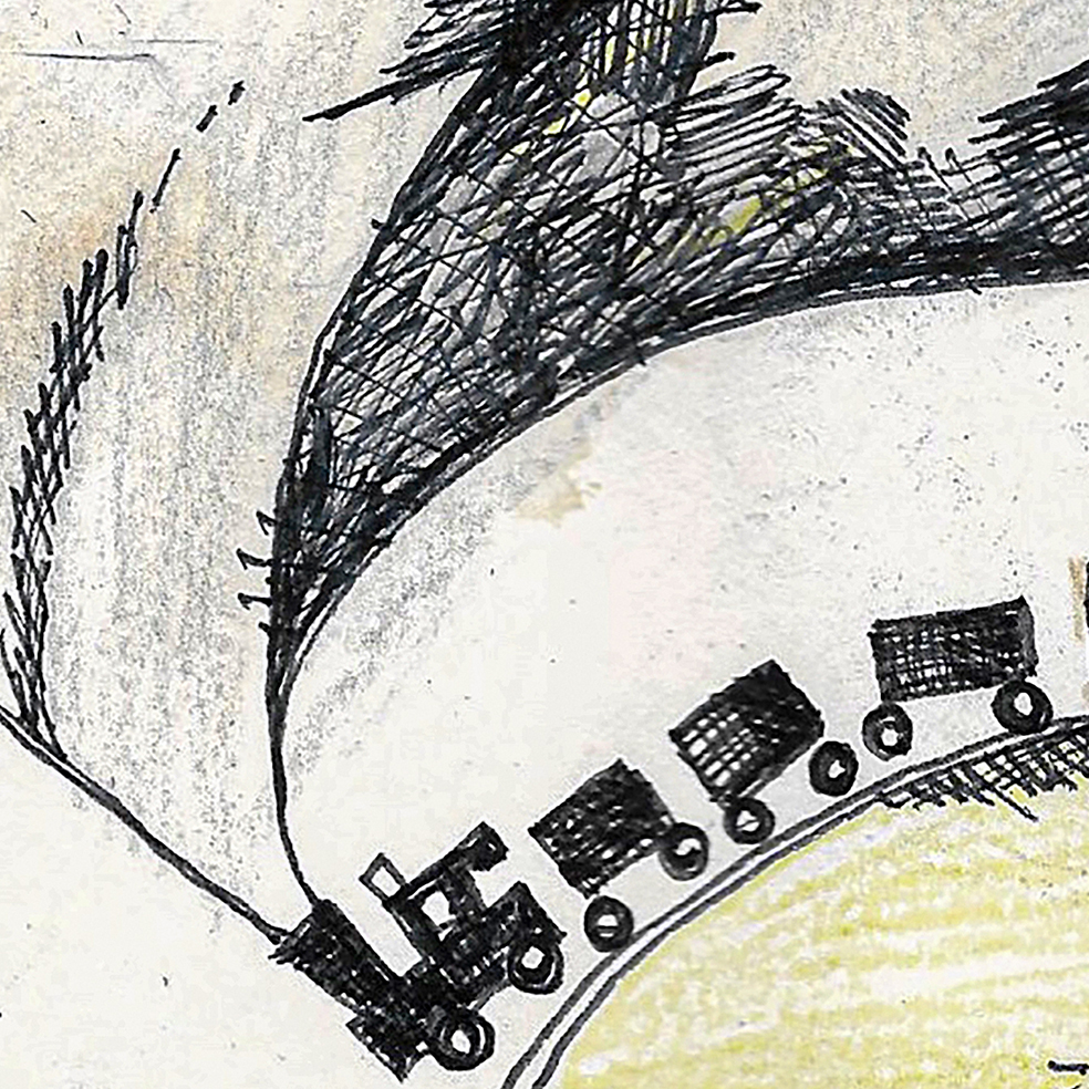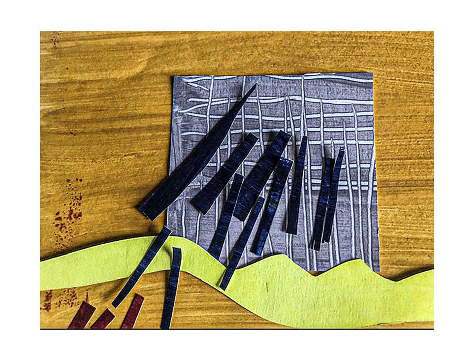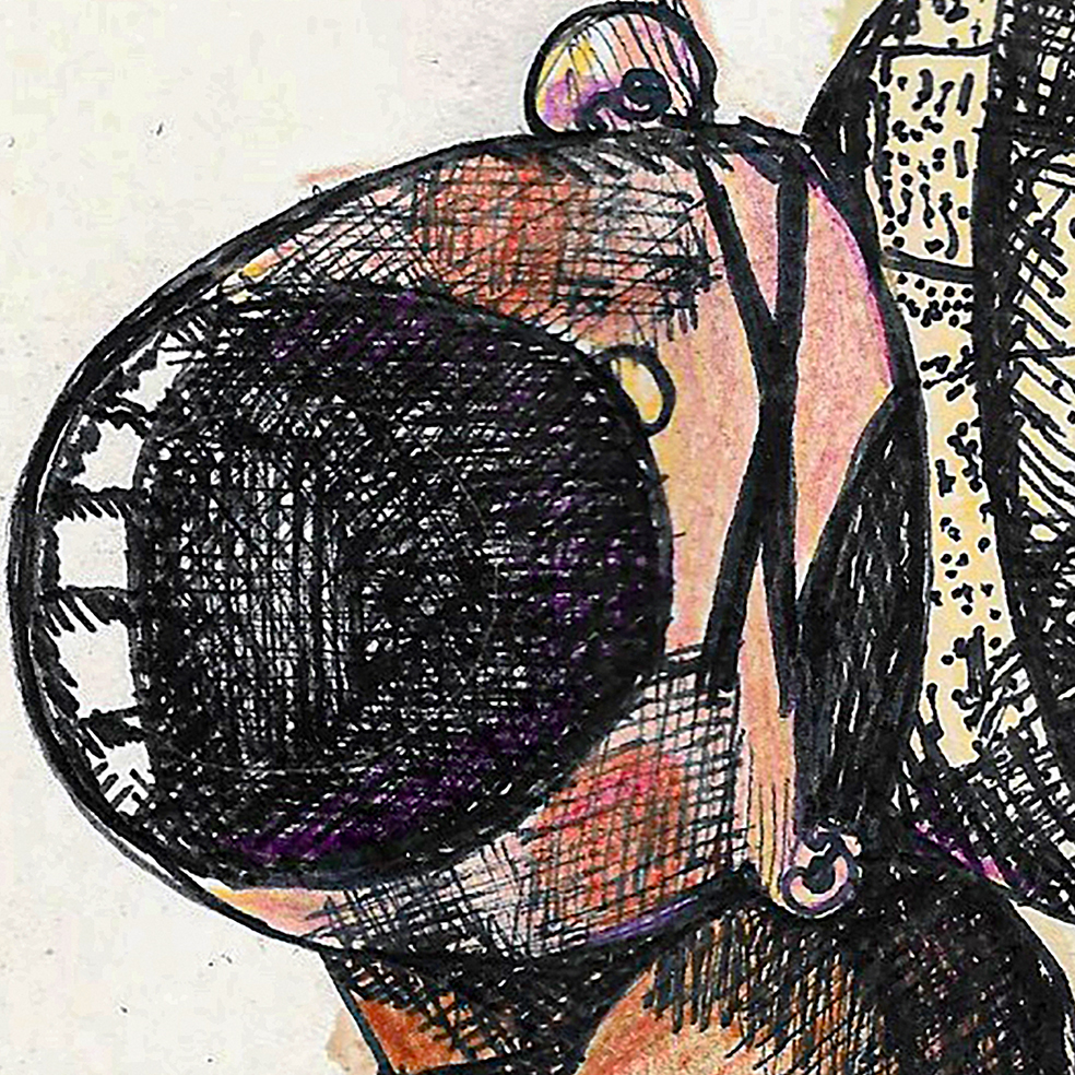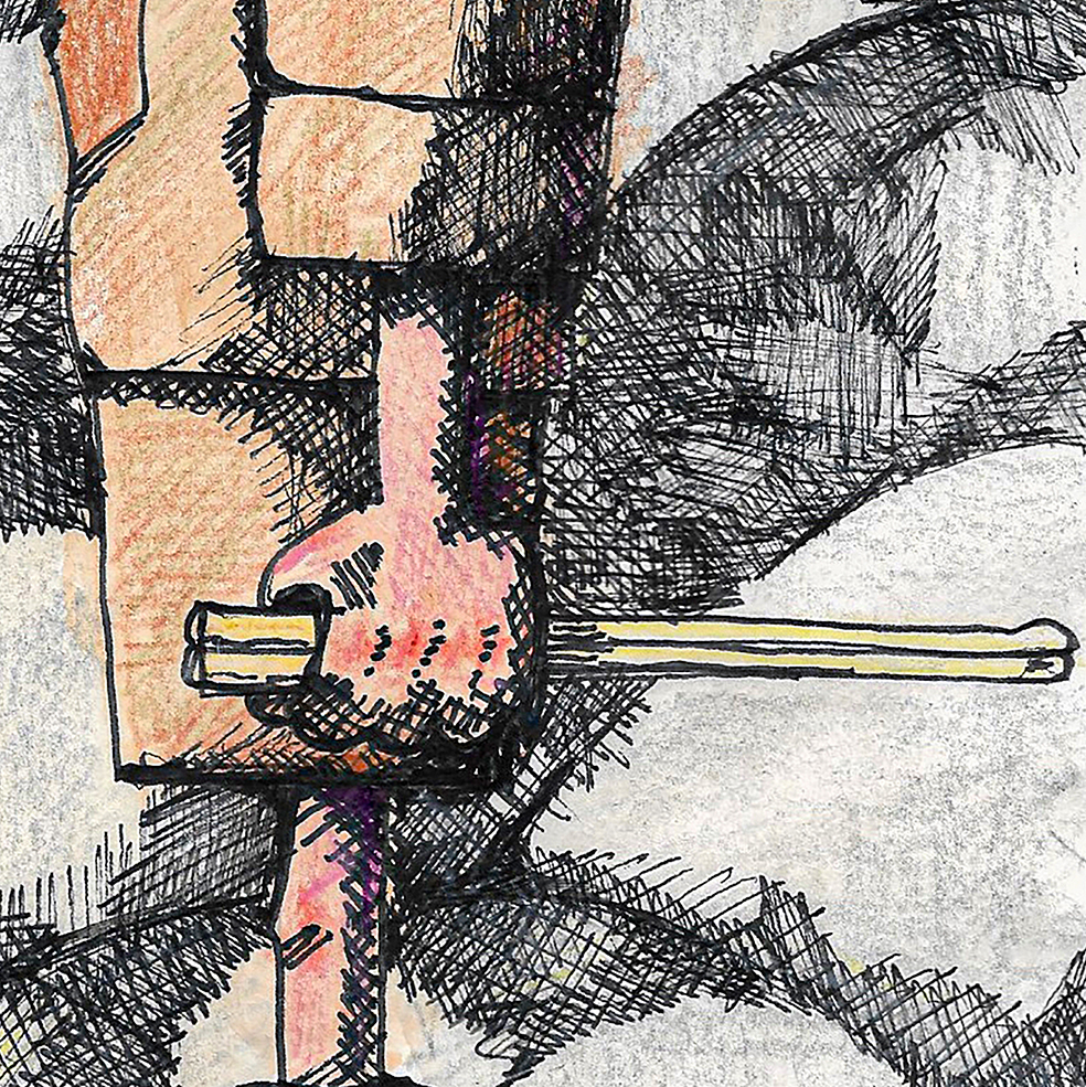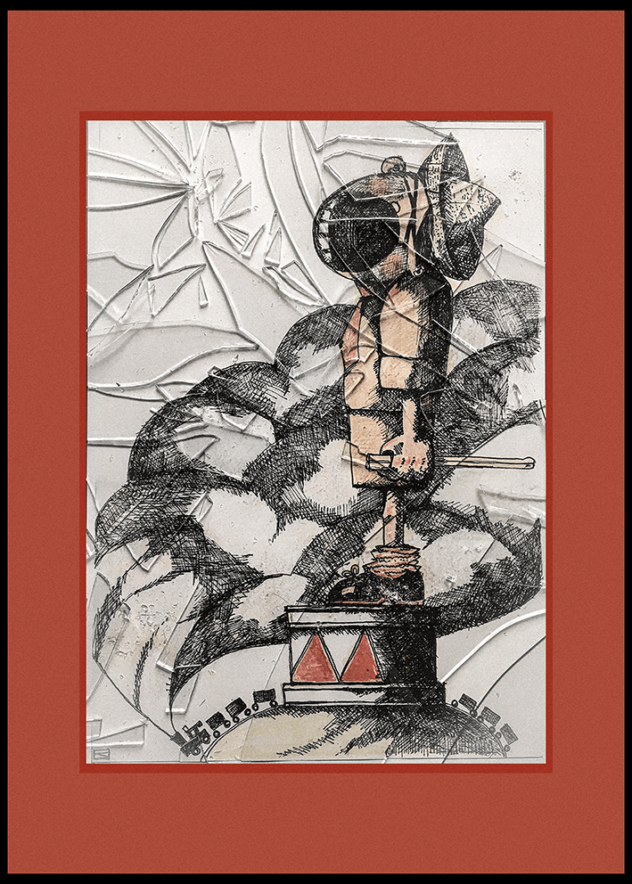 “The prompt initially recalled my grandfather tapping out the ‘Radetszky March’ on the kitchen table. He saw service in both world wars and as an Austrian became German in 1938 and served in the Wehrmacht. Themes in ‘The Tin Drum’ (Gunther Grass), written after the war, suggested the imagery. Once I had the image, I used a Berol handwriting pen over washes created with watercolour pencils and used the same to enrich. The scrap glass over the image was smashed with a hammer. In honesty I have not properly read The Tin Drum, but some years ago I did read ‘The Painted Bird’ (Jerzy Kosinski) and neither is for the faint hearted. Both, I think, deal with individual survival. In the end the image makes comment on the aspects of the war that my grandfather survived but didn’t say much about.”