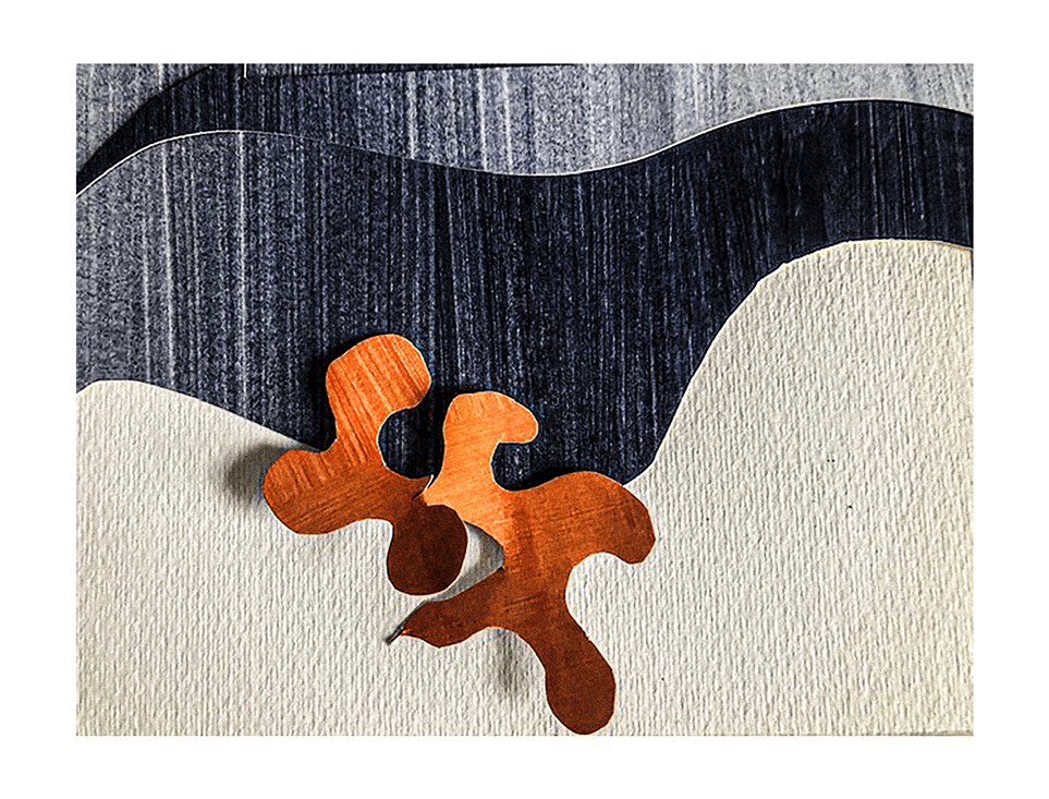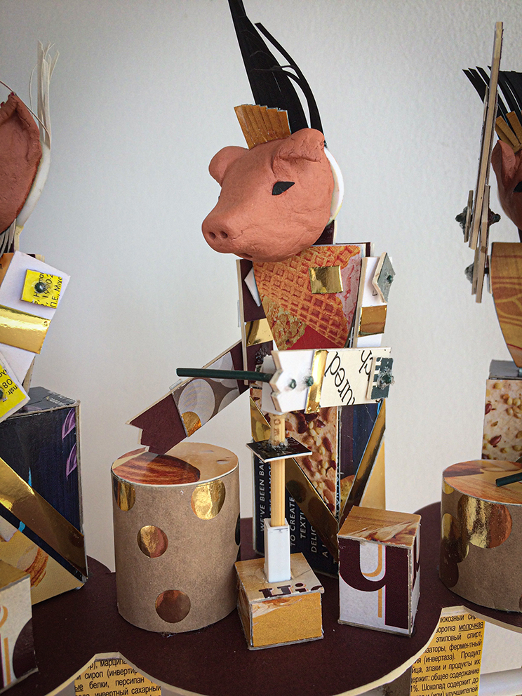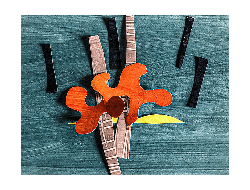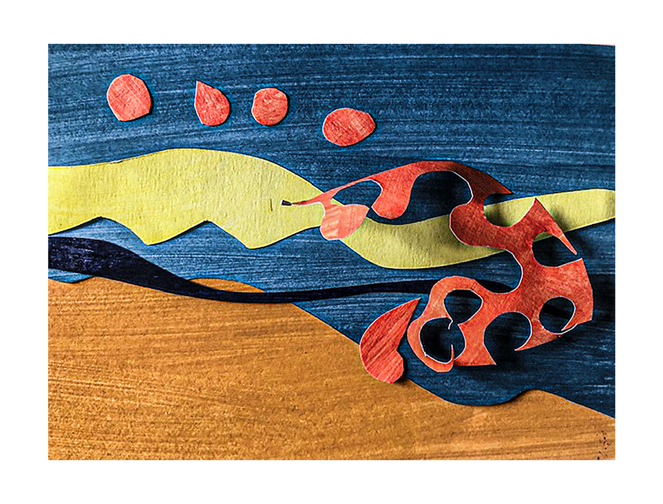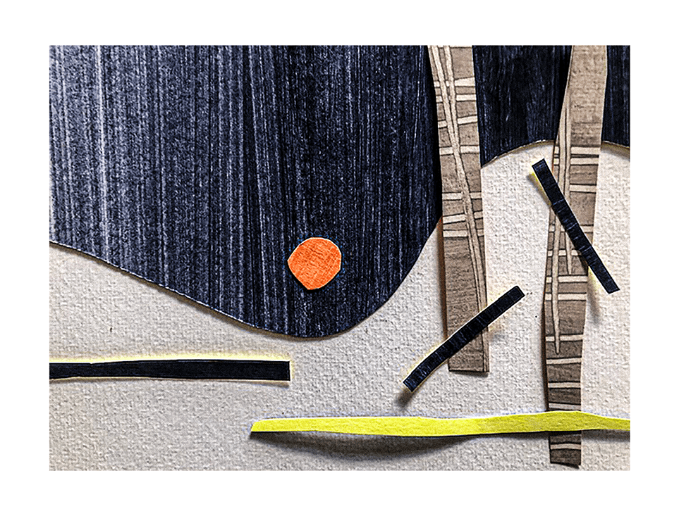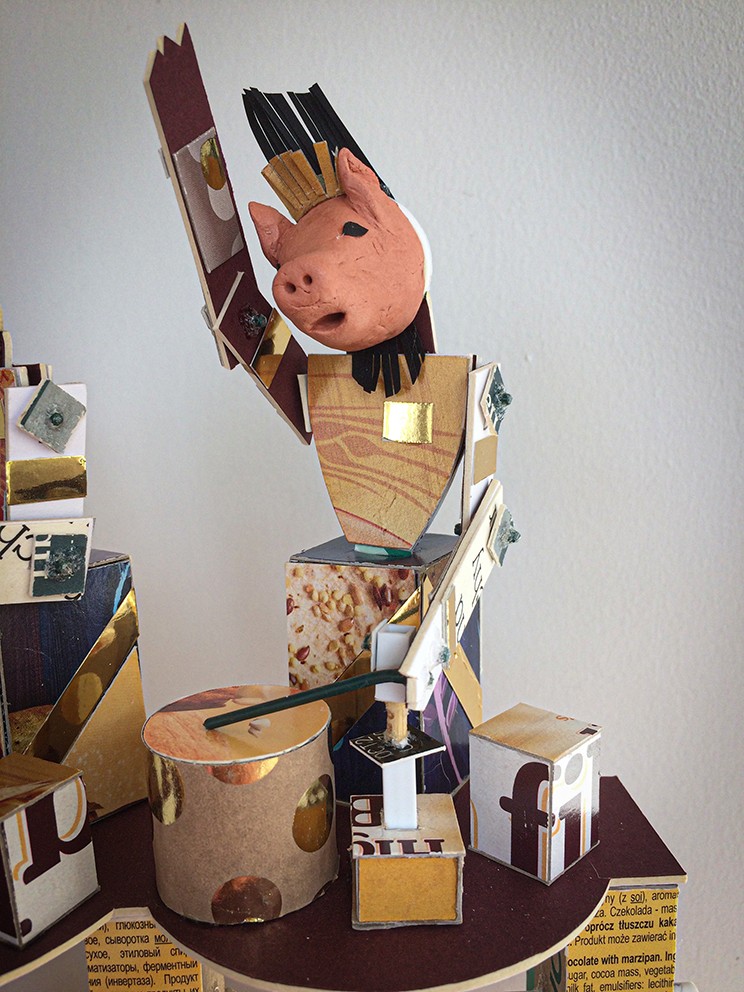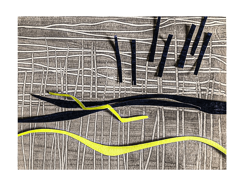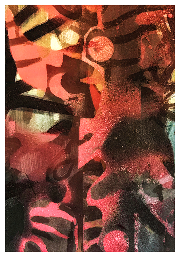 “The prompt initially recalled my grandfather tapping out the ‘Radetszky March’ on the kitchen table. He saw service in both world wars and as an Austrian became German in 1938 and served in the Wehrmacht. Themes in ‘The Tin Drum’ (Gunther Grass), written after the war, suggested the imagery. Once I had the image, I used a Berol handwriting pen over washes created with watercolour pencils and used the same to enrich. The scrap glass over the image was smashed with a hammer. In honesty I have not properly read The Tin Drum, but some years ago I did read ‘The Painted Bird’ (Jerzy Kosinski) and neither is for the faint hearted. Both, I think, deal with individual survival. In the end the image makes comment on the aspects of the war that my grandfather survived but didn’t say much about.”