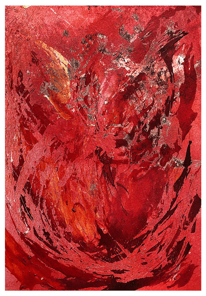 “What a great album, thank you Charly, very inspiring. I find percussions and drums quite fascinating. When I was heavily pregnant with Sophie, we went to a Kodo Drummers gig. I didn’t realise it would be quite so loud and powerful, I could feel the sound waves going through me like through air, I could barely breathe. I was quite worried about Sophie, but she started kicking madly as soon as the sound stopped, which I took as a sign of appreciation. So here I am, back on the heart, and the heart beat responding to the drumming.” Acrylic Inks on watercolour paper, 25×17 cm.