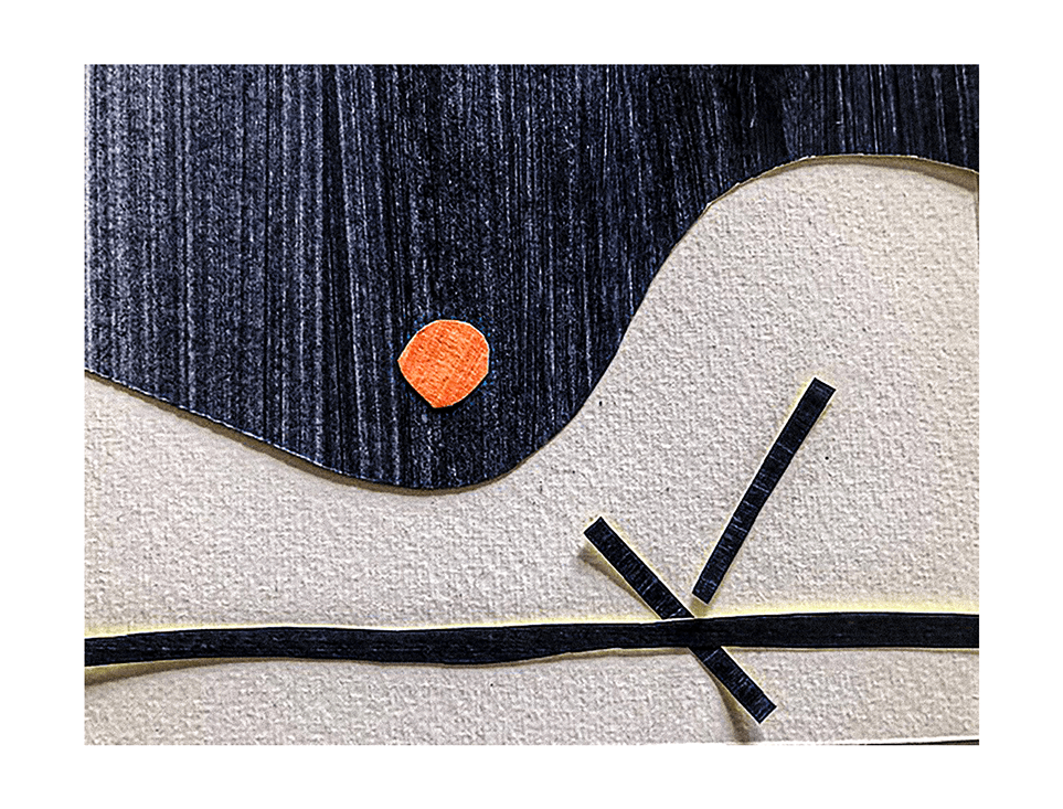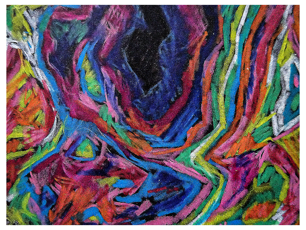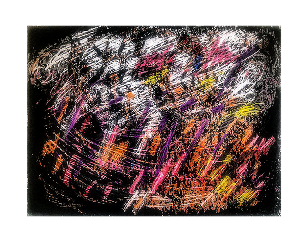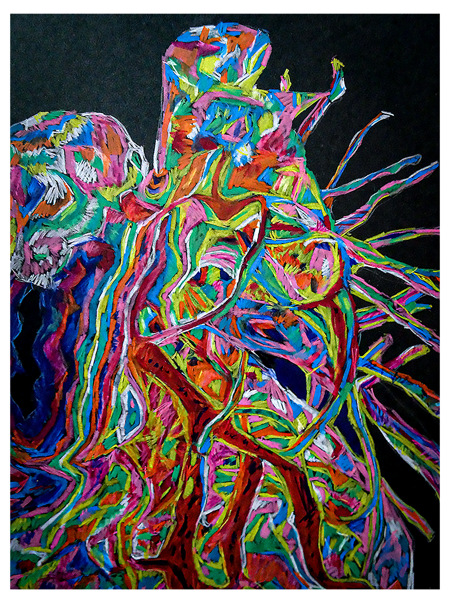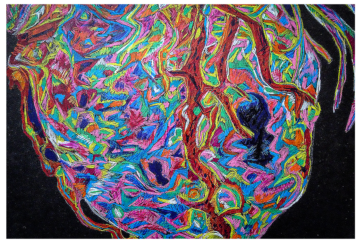 “The drumming of Sandy Nelson reminded me of heartbeats which can careen wildly under different circumstances. When I looked online for images of hearts, I was attracted to the somewhat psychedelic MRI images. I wanted to work large, but even with 18 x 24 paper, I was unable to do justice to all the different elements of the heart. I made no layout, but just started drawing in the upper center with my colored pencils, a small section each day. So both the line quality and the proportions changed as I went on. Whole sections were expanded, compressed, and left out – just like the trajectory of the drumming in my mind.”