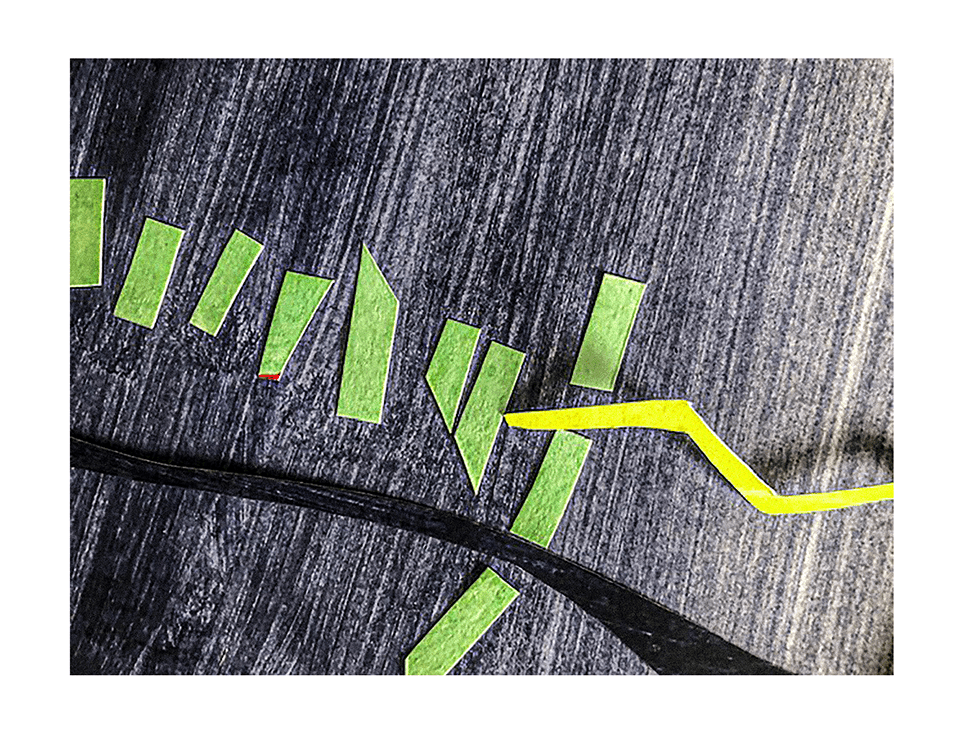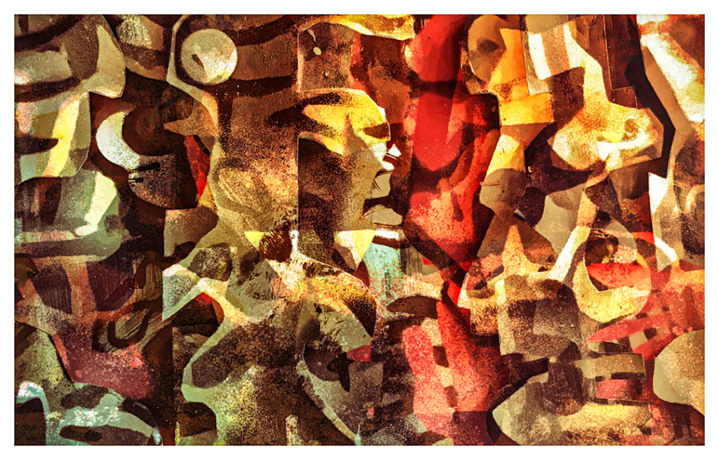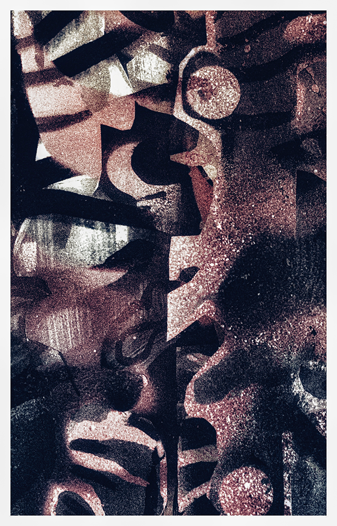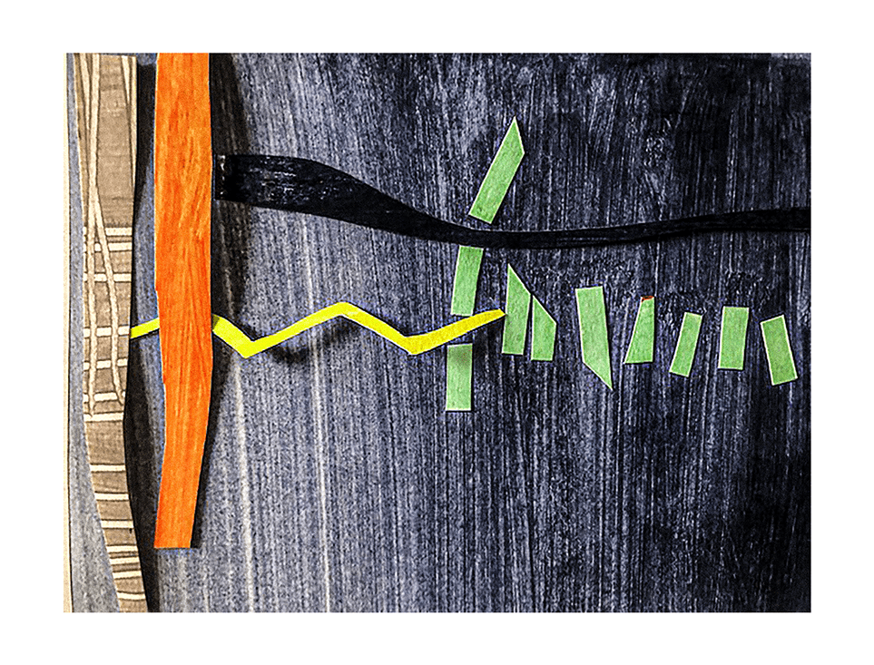 “I’ve been enjoying listening to the amazing percussion of Sandy Nelson this week. I’d put it on when I was cooking, cleaning, working, it’s great for doing anything to. From time to time I’d grab a pen or a ruler and start tapping things in time to the music, the beats and rhythms are infectious. In response I made some cut-out paper shapes, trying to capture something of the music in the repeated shapes and colours of the papers. I then photographed them, overlaying the shapes and making different arrangements before adding some effects in Snapseed and Enlight. It was great fun and I found using sounds as a starting point was very freeing. It really encouraged spontaneity.”
