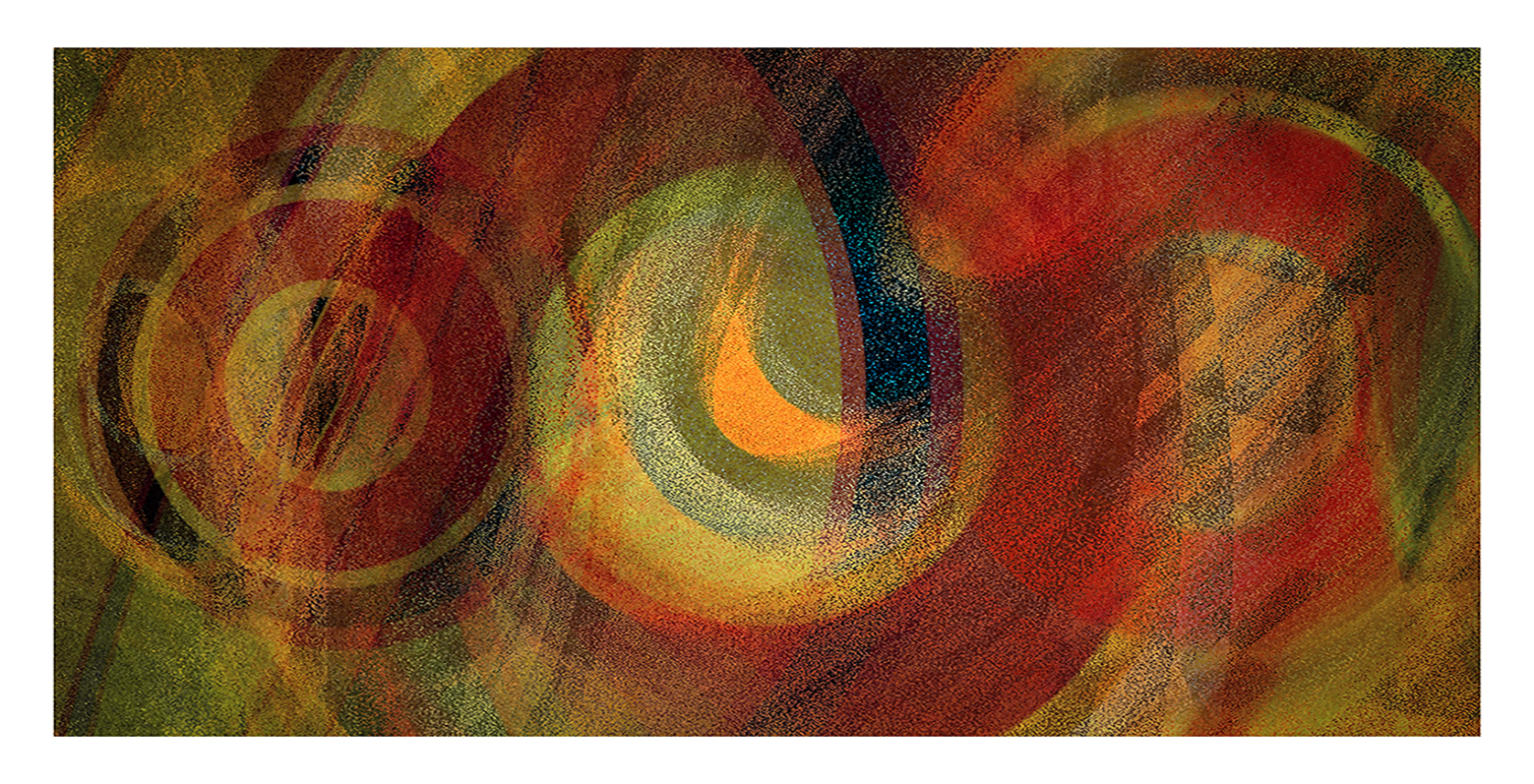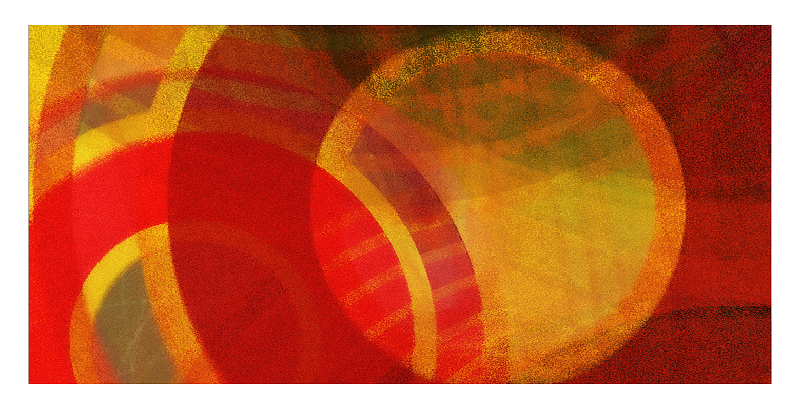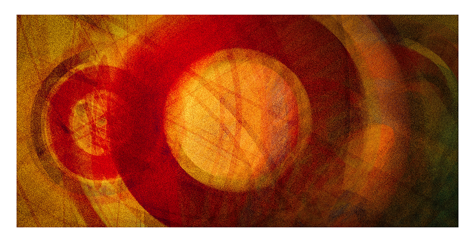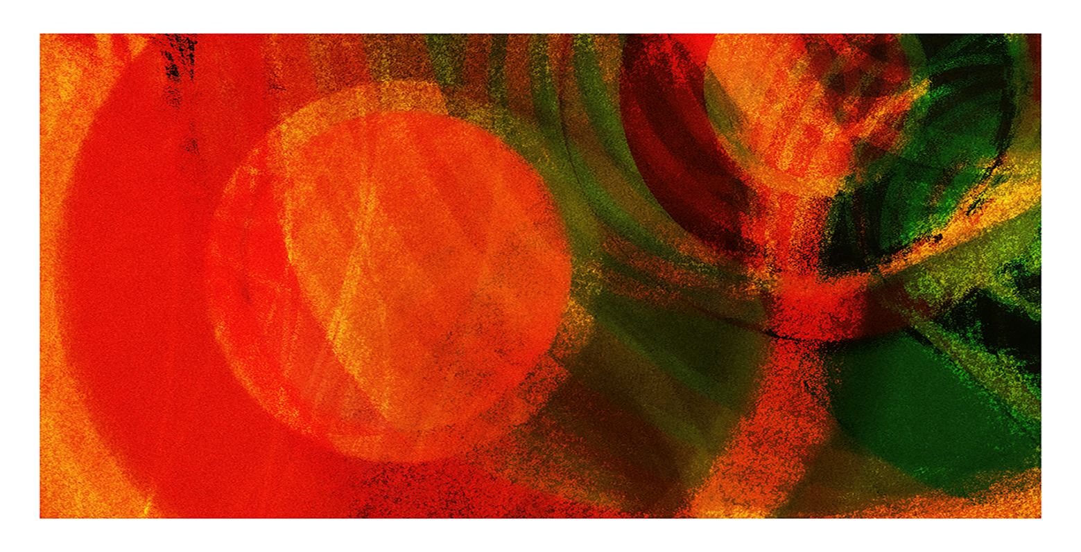 “My immediate response to this prompt was ‘make a film’, so I set about trying to find a means to visualise Nelson’s percussive effects; I built some simple 2D shapes in the video-editing software and tried to ‘vibrate’ them. I had the image of a cymbal being struck, a disc-shape producing more complex effects due to the persistence of vision. I struggled a bit, because I couldn’t get what my imagination was showing me. That said, during the experiments that led me to give up on the idea of moving image, I began to develop some work for which I could muster more enthusiasm – and if not visualisations of sound exactly, than artwork that wouldn’t look too out of place on the front cover of a jazz album.”