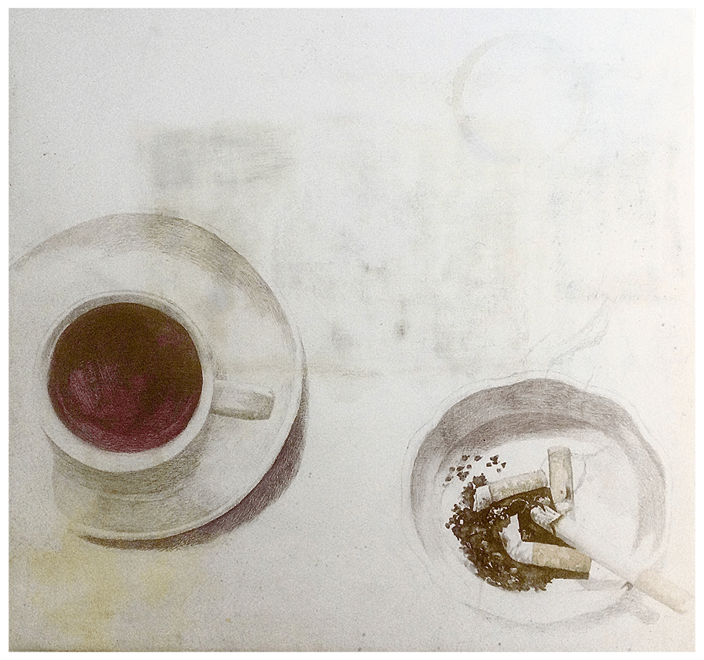 “I closed my eyes and let the music fill me up… legs and feet jiggling to the beat, memories of the 606 club on the New Kings Rd..the doors opening just before midnight, musicians arriving after their various gigs and ‘ jamming’ ’til the early hours, alcohol in coffee cups and cigarette smoke hanging low, climbing the stairs at dawn. A quiet response to an exhilarating disc and time travel.” Watercolour and graphite on gesso.