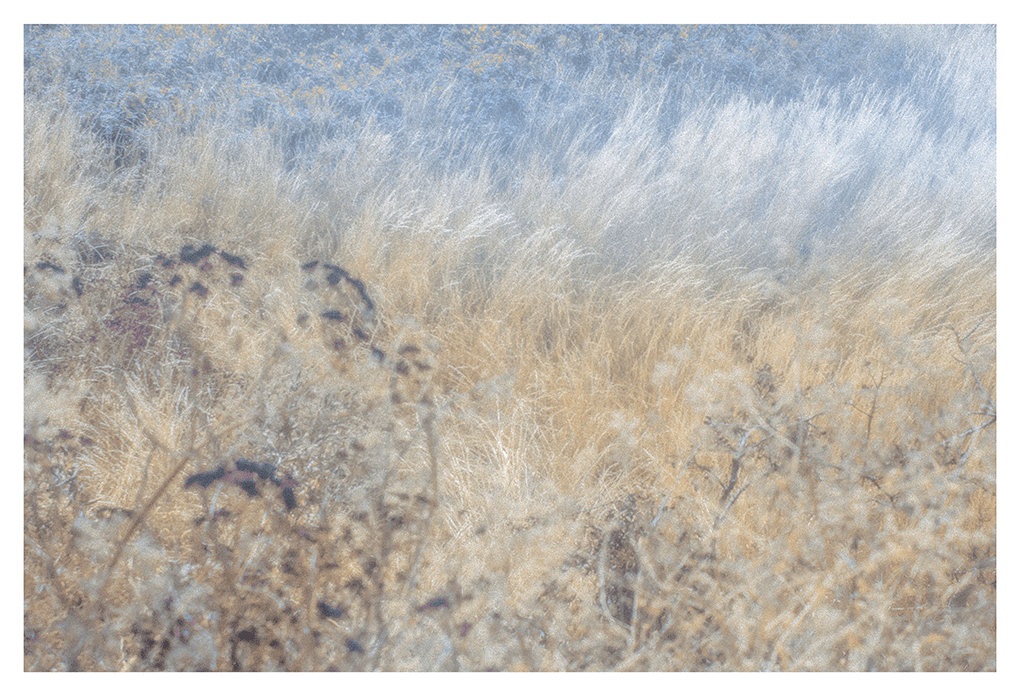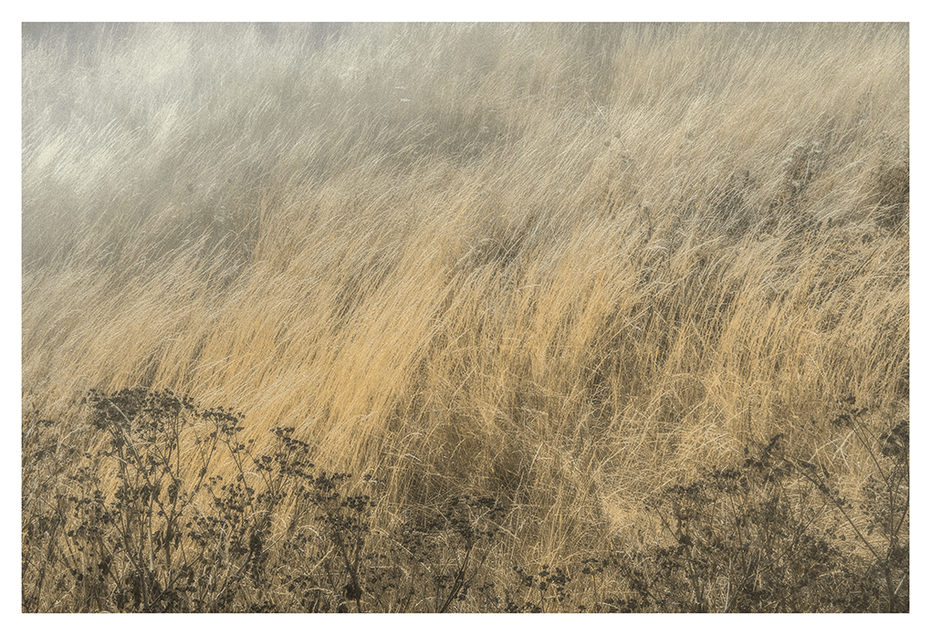 “I wasn’t familiar at all with Lamplough’s work (much obliged, Jordan), but find his paintings completely magical, and can hardly believe they’re paintings at all, in so much as all that soft golden light and gauze is produced from paint and brushes onto paper. In Lamplough’s landscapes, I find the impressionism and light-play I always want from my own photographs, and it was a happy coincidence that Jordan’s choice of prompt should arrive in the same week I was experimenting with physical gauzes to produce more diffuse lighting effects of my own. Suitably inspired, I returned to a local bit of unadopted scrub set just back from the sea front (last seen on here under very different circumstances) and indulged once more my love of grasses, in all their billowing contours. First putting my camera into an organza bag, I proceeded to photograph the scrub as the wind pushed it this way and that, and the sun illuminated every quill and strand of it. Meanwhile, the gauze served to flatten everything out and flood the subject with light, producing some Lamplough-like atmospheres from a largely over-looked landscape.”