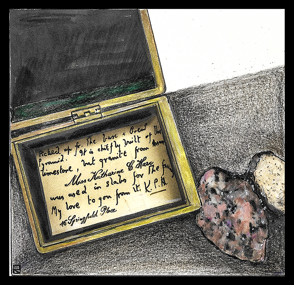 Inside the lid is a sticker marked ‘Relics’ and four smaller boxes are revealed. Each box, decorated all over with detailed floral sprays, contains fragments and objects collected on travels. Sadly, no body parts. In one are two pieces of building stone from the Great Pyramid… and so my rather obvious connection with the prompt. It’s a marvellous object and a bit like a transportable ‘cabinet of curiosities’. Apart from the pyramid fragments, there are some shells from the Sea of Galilee, a chunk of Fountains Abbey, and a bit of brick from the spyhole through which Wellington spied the French at Waterloo – and numerous other bits and pieces.