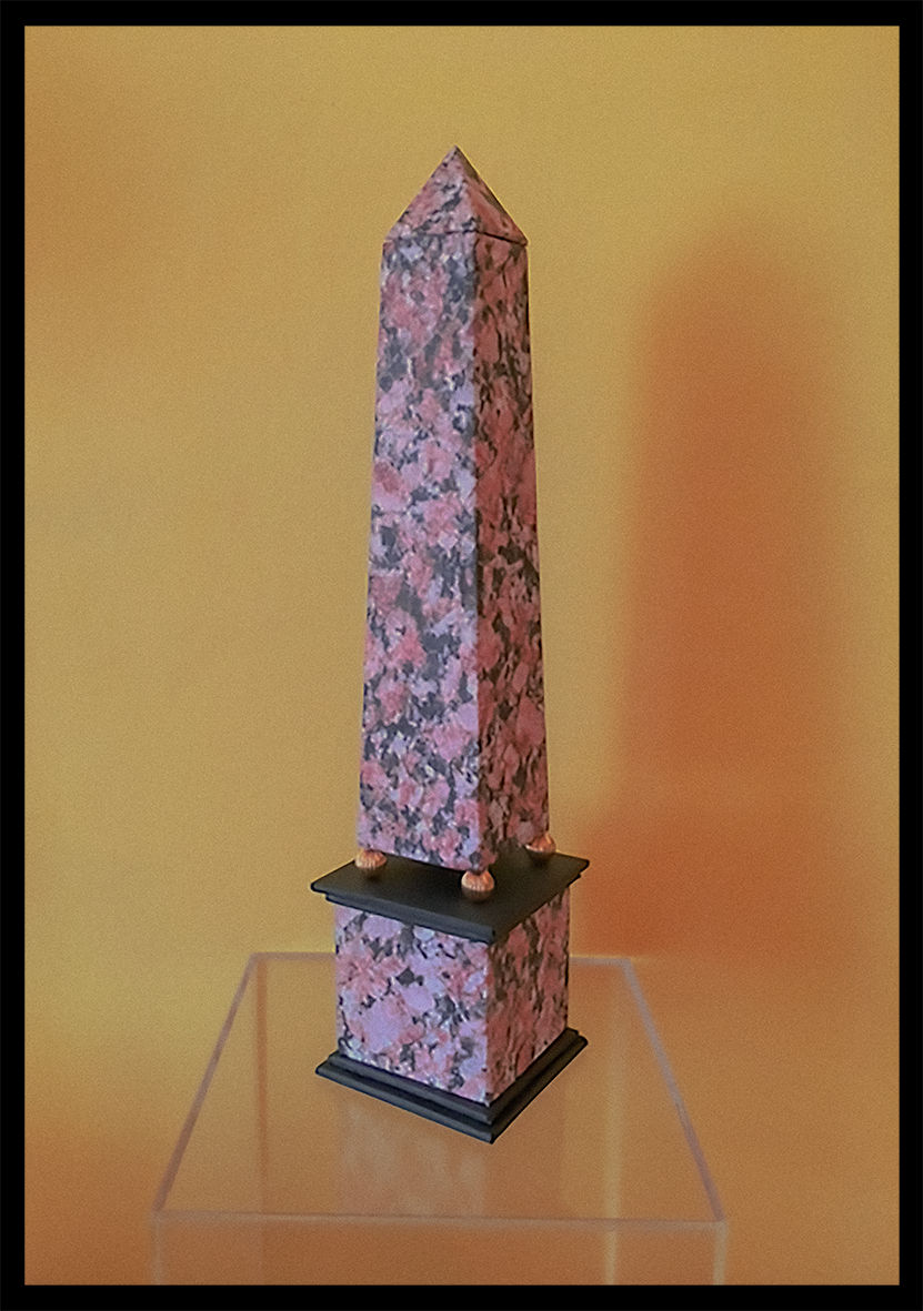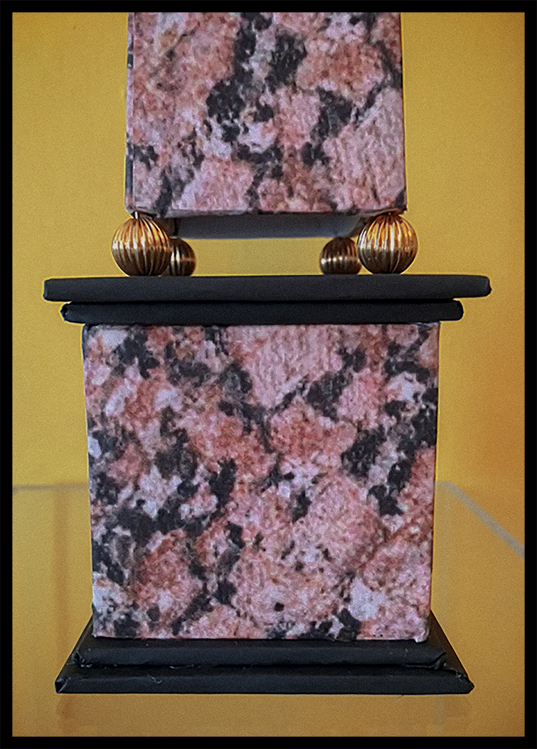 So the drawing (collage, coloured pencil and ink) that came out of this, is of that inner box: its contents and dedication. The obelisk (foam board, pins, beads and Pritt Stick materialised as a way of using the pattern of the red granite – useful if you happen to be staging ‘Aida’ or ‘The Magic Flute’ and you need a desk ornament.”