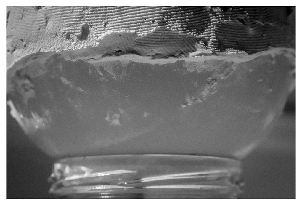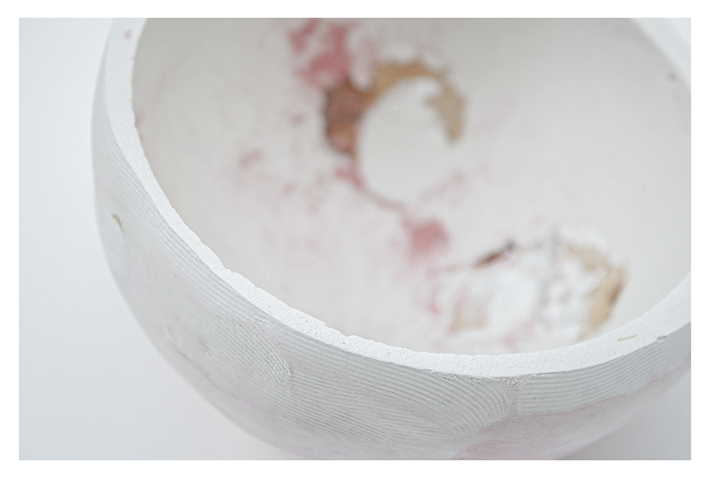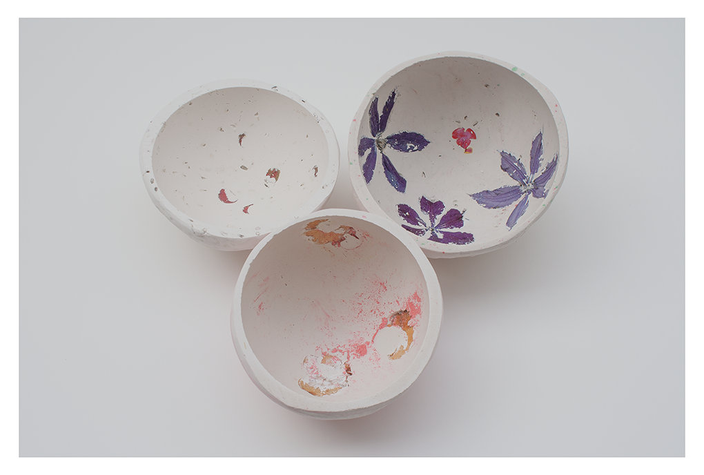 In lieu of any decorative glazes, I picked a few flowers from the garden and crushed some coloured chalks and squidged these elements against the surface of the balloon beneath big dollops of filler. I then used a knife to spread the filler over and around the balloon to create the rough shape of a bowl. Filler is designed to dry really fast, so you’ve got a bit of time to muck about with it – but not much.