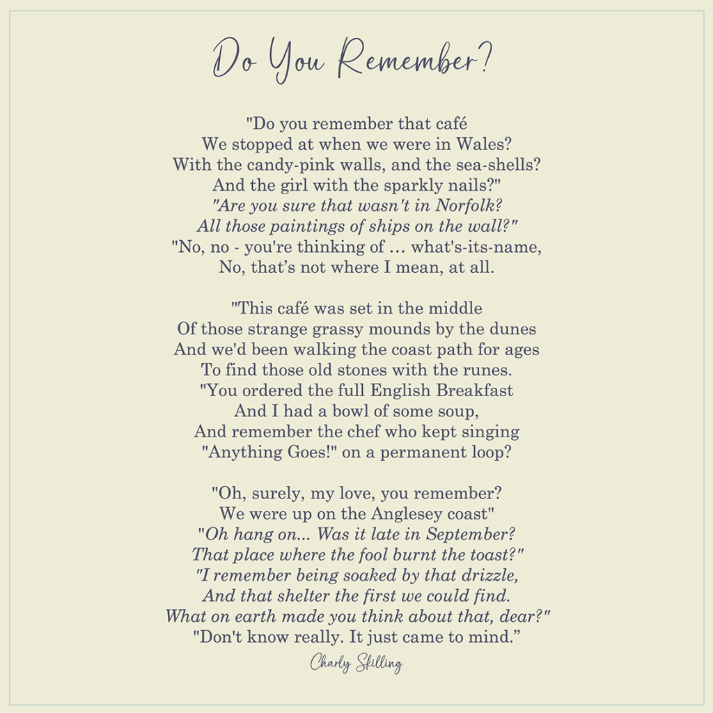 By the time we have aged within that relationship, we come to recognise that it is an achievement for any shared experience to be remembered by both of us at all, without several minutes of dispute over location time of year, weather, and reason for being there. And why is it that I find I cannot remember the name of a place, I cannot remember how to get there, or why – but I can remember exactly what we ate and the colour of the waitress’s nail polish? What’s all that about?”