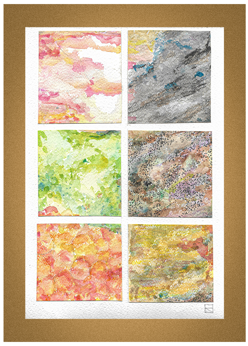 “This one was a bit of a late starter for me. Having given some early thought to it and tinkered with water colour washes as a response to the words, the result didn’t quite live up to my expectations . Initially I was thinking in terms of printed textiles based on the stanzas and 1950’s, but a few scribbles and doodles confirmed that wasn’t ready to work for me. So it rested until almost the deadline and, as a final go at it, I tried cutting up the original into sections and rearranging in an effort to express the ‘you and me ‘ idea. That practice put me in mind of putting together a shade card.