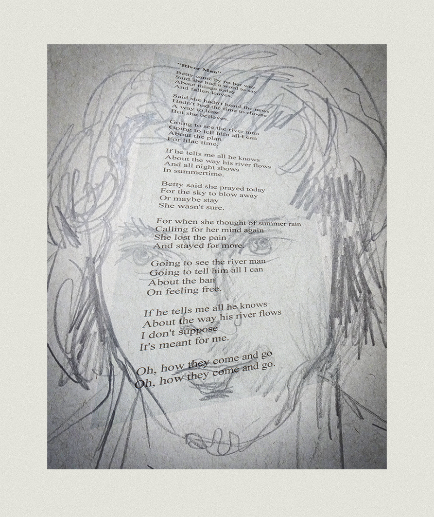“I wasn’t aware of Nick Drake’s heritage, but Molly’s song immediately made me think of ‘River Man. I took the feeling I got from both songs, and made a prose poem, then some art to accompany it.”